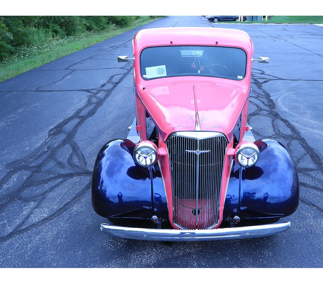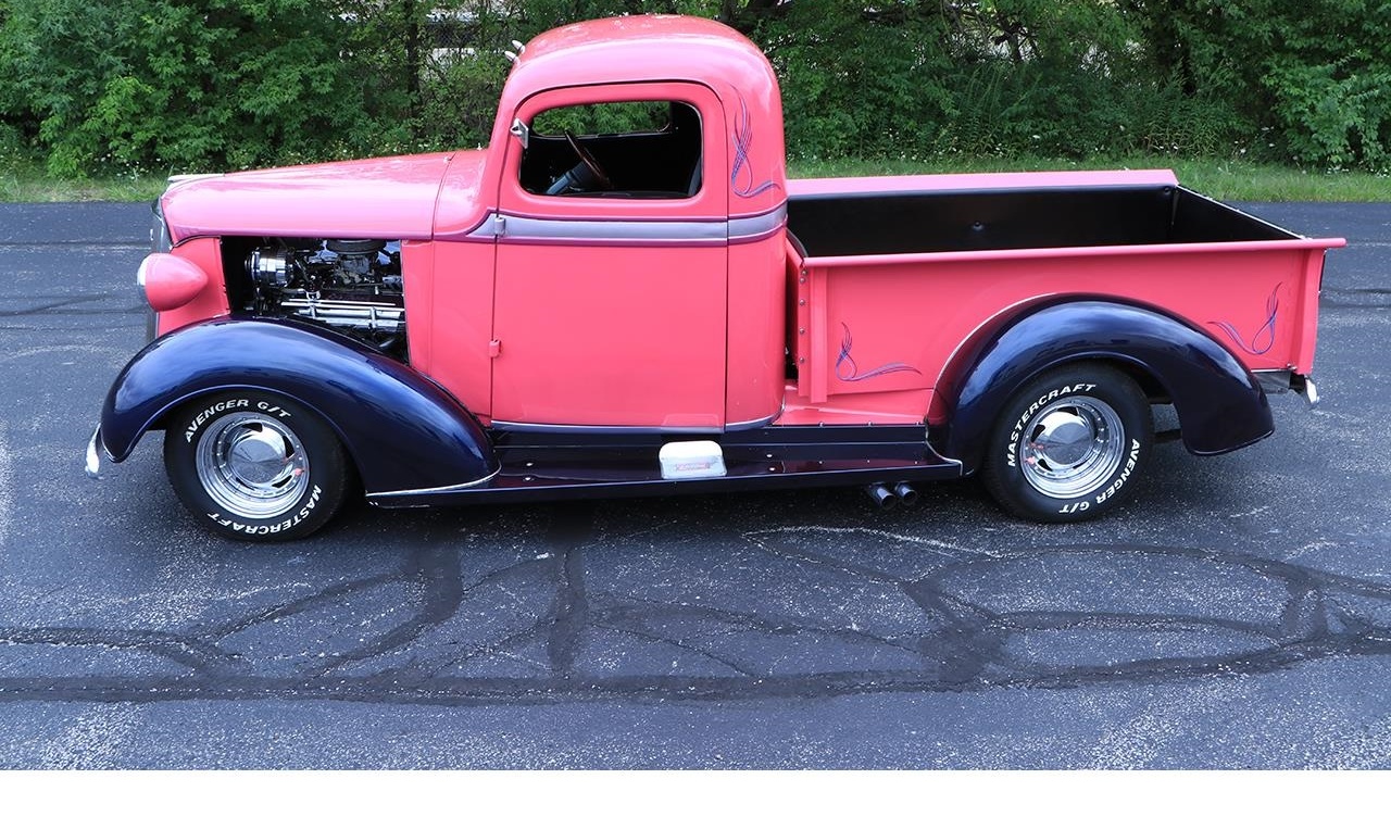 Powering this '37 is a rebuilt 350 small block V8 engine and mated to a turbo 400 automatic transmission. When looking under the hood or through the open side panels, you will instantly notice the chrome Edelbrock valve covers, long tube headers, modern 134a AC compressor, Weber Carburetor, and even Chevrolet "Heartbeat of America" covers.