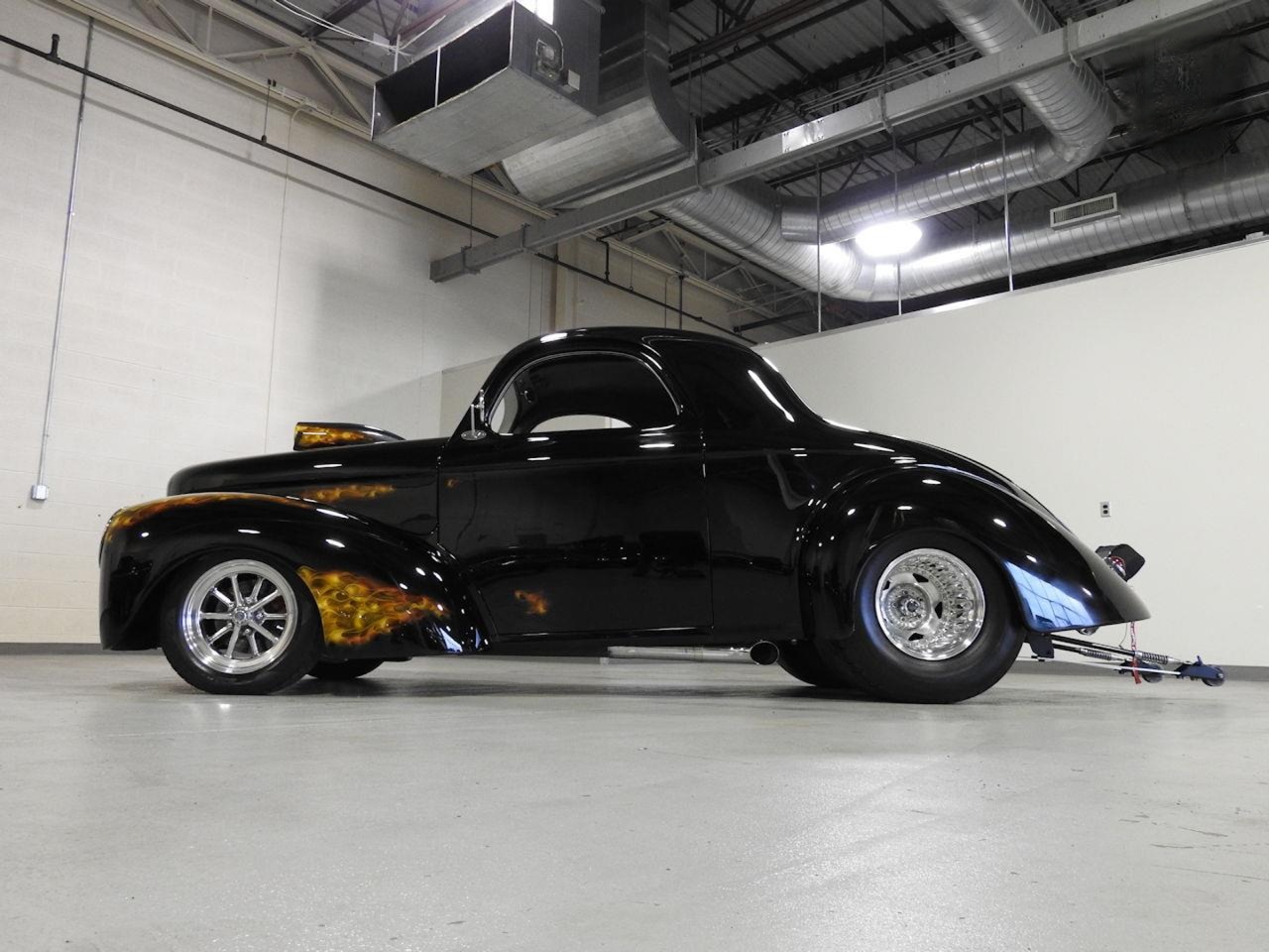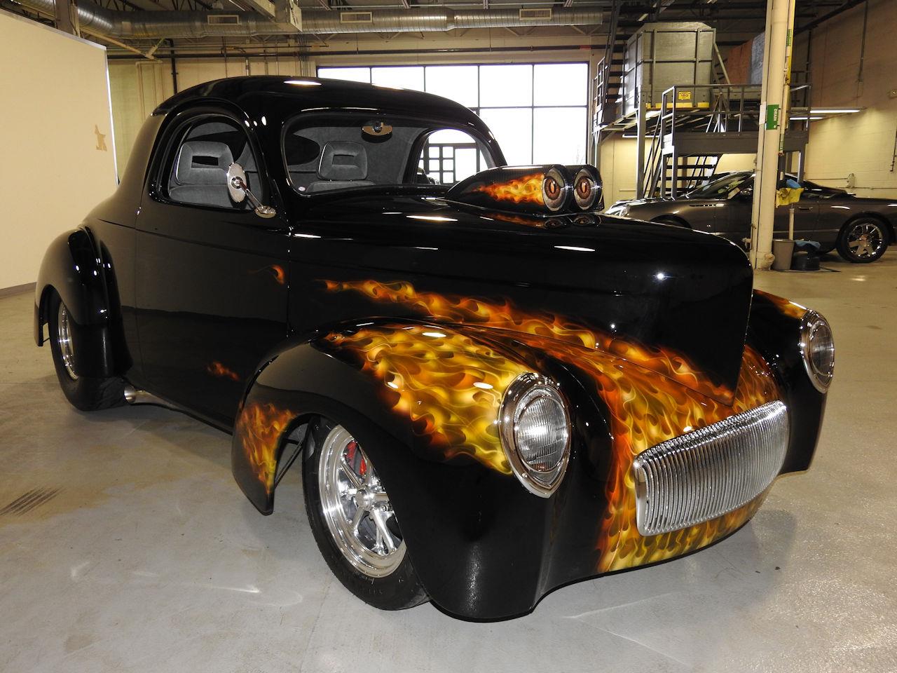 1941 Willy's Coupe. This Willy's custom hotrod is painted in a PPG black with a custom flame paint job. This Willy's is powered by a 496 Power house Stroker V8, with highrise tunnel ram manifold and 2 Edelbrock 650cfm carburetors to ensure no power is wasted. This powerplant is paired to a Turbo400 transmission which hands off power to the Ford 9" Posi-Traction rear end with shortened Moser axle shafts and is translated to the pavement via the rear Centerline wheels wrapped in Mickey Thompson Sportsmans. This Willy's is sitting on a Dennis Taylor chassis and will surely stay cool thanks to an excellent cooling system including 2 11" cooling fans for the engine, electric transmission cooler, and a BeCool radiator. The suspension of this Willy's consists of a Mustang II front suspension, four link rear suspension, and Aldan coil-over shocks. The gray and black cloth interior allow you to enjoy this beast comfortably when open road cruising. The interior provides some great modern pieces such as autometer gauges, custom machined trim pieces, and an easy pull to start system.