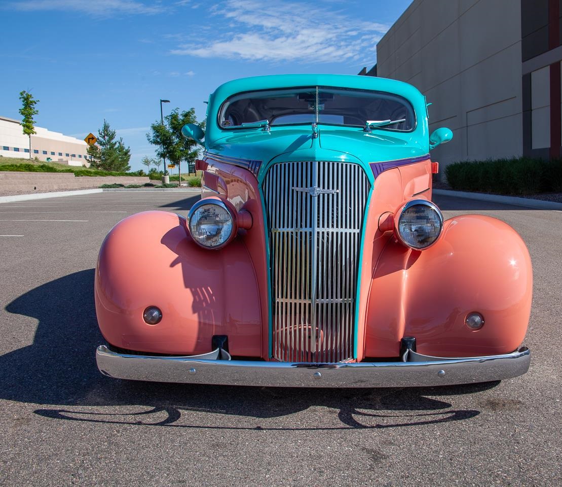 This one has a lot of the creature comfort amenities such as: 350 Chevy engine, mated to a 3 speed transmission putting power to a 10 bolt rear end sporting 3.55 gear ratio. Camaro Front Clip. 18" Intro Wheels in front, 20" Intro Wheels in the rear.