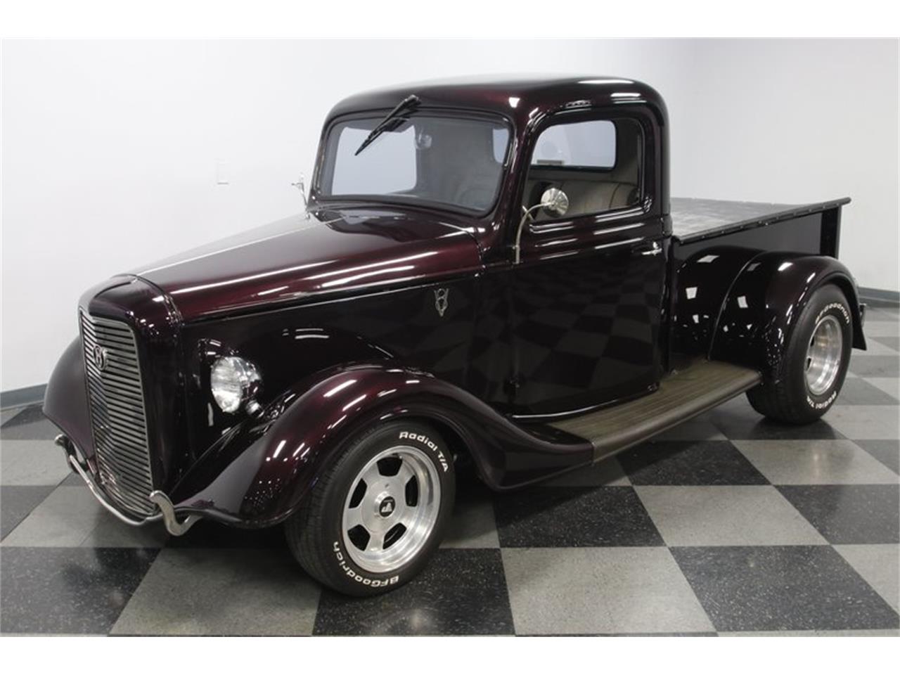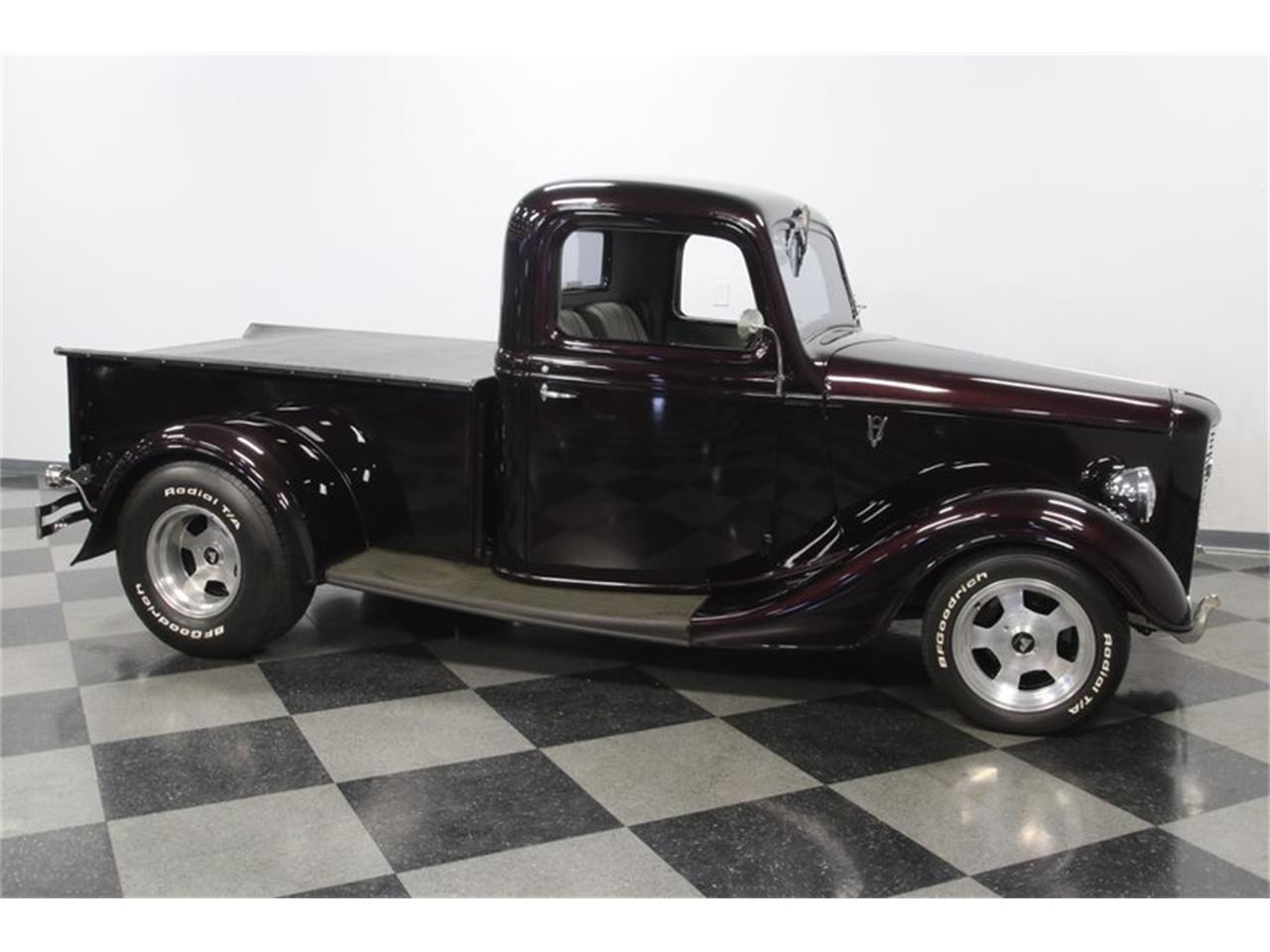 1936 Ford Pickup custom streetrod - 350 cubic-inch V8 power done with plenty of added shine. This motor has been enhanced with a Weber four-barrel carburetor, Edelbrock Performer RPM intake, and shorty headers feeding the dual exhaust. As you look underneath the truck, you're going to find terrific upgrades, like a Mustang II-style independent front end with tubular A-arms, a strong ladder bar setup out back, a custom crossmember, and a Ford 8-inch rear end. Plus, you have front disc brakes and rack & pinion power steering. If this sounds like a great classic to drive near or far, then you'll also love the four-speed automatic transmission w/highway-friendly overdrive. The operation of the doors has the kind of quality feel that tells you this is a well-done build, and when you look inside, there are all the right signs of a solid investment. The two-tone gray tweed is well-coordinated on the seats, door panels, and carpeting. There are modern upgrades like R134a air condition and an AM/FM/CD stereo with USB input for your phone. There are even provisions for nice features like power windows and a radar detector.