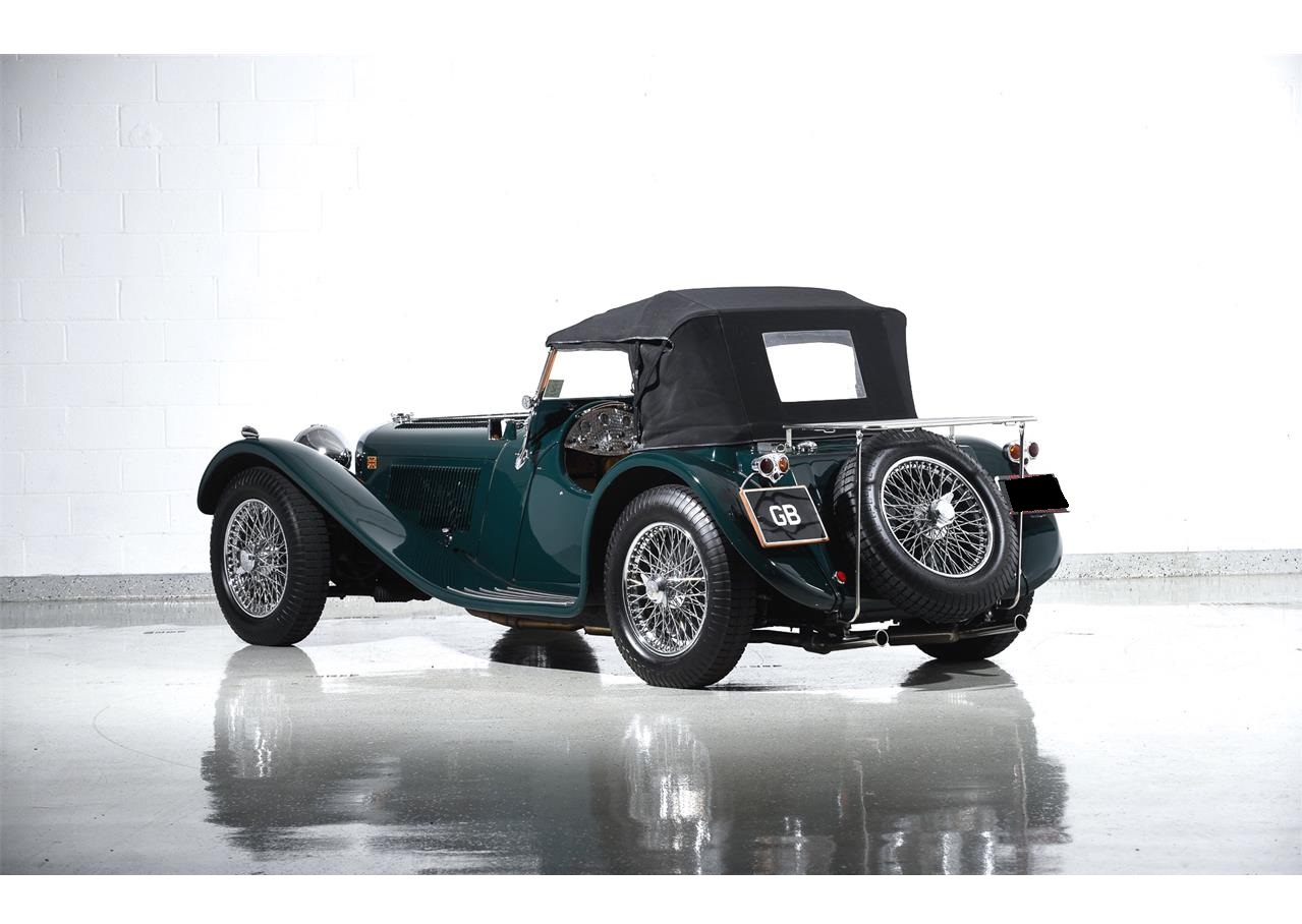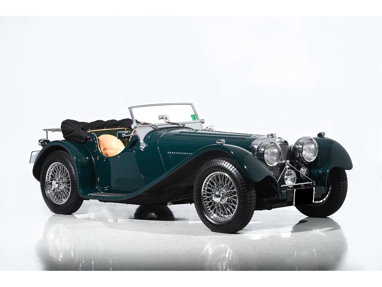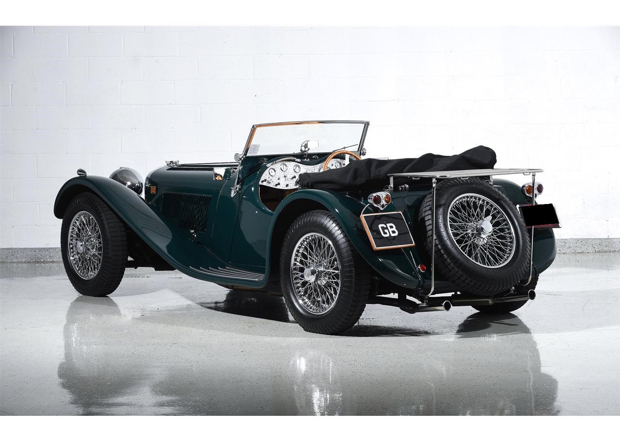 1937 Jaguar SS in classic British Racing Green on its fiberglass body panels with Tan leather trimming the cockpit. The engine-turned instrument panel and classic instruments lend a vintage feel to the cockpit. The car is fitted with a vintage 1965 Jaguar 4.2L DOHC XK engine mated to a compact short throw Jaguar 4-Speed box with overdrive on top gear. This lightweight car has the power and torque of an E-Type with lighter weight for truly impressive performance. Moto-Lita wood steering wheel, Lucas QK596 headlamps, and a single driving light. The car has full weather gear including a Black top and side curtains.