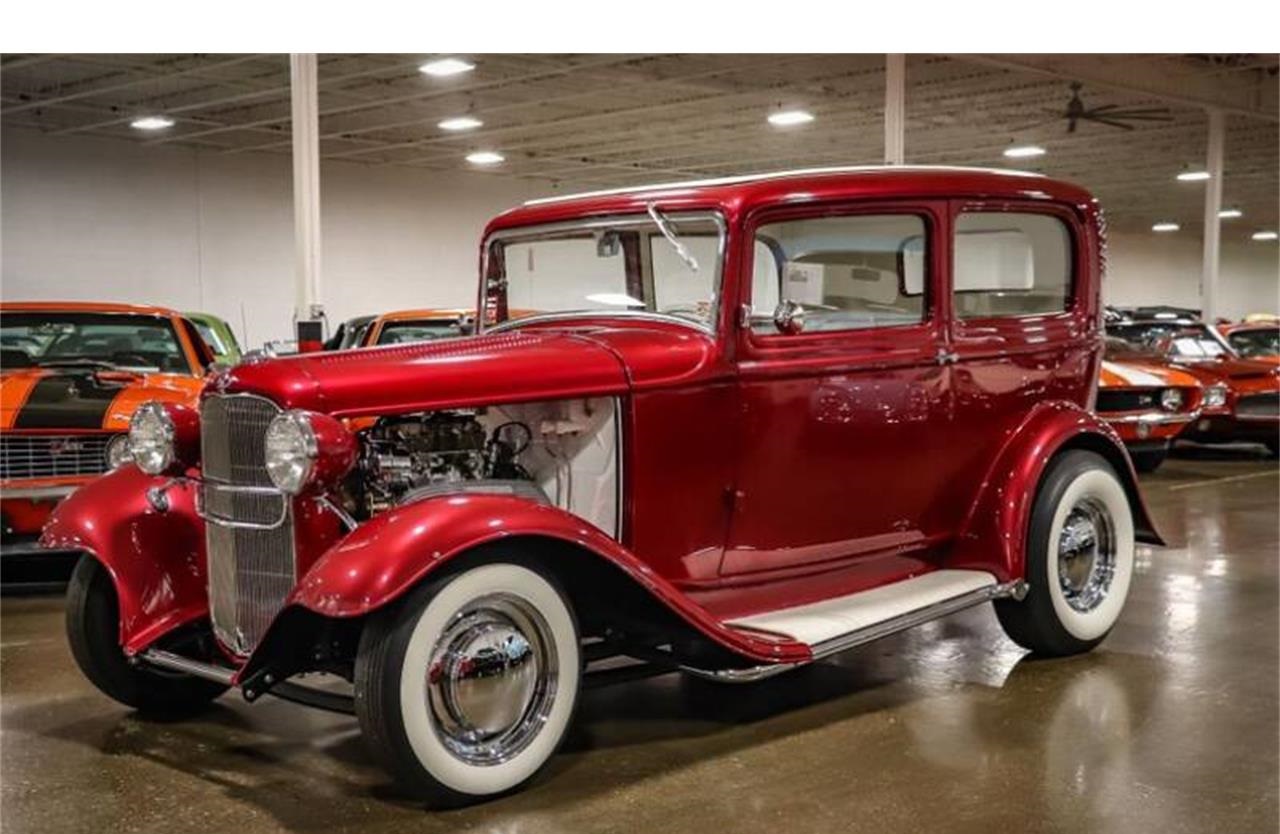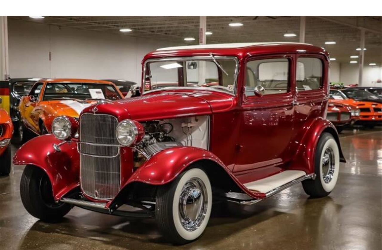1932 Ford 2 Door Sedan for sale. The paint color is Dark Cherry Pearl, which looks great paired with the chrome trim, and contrasting white interior.