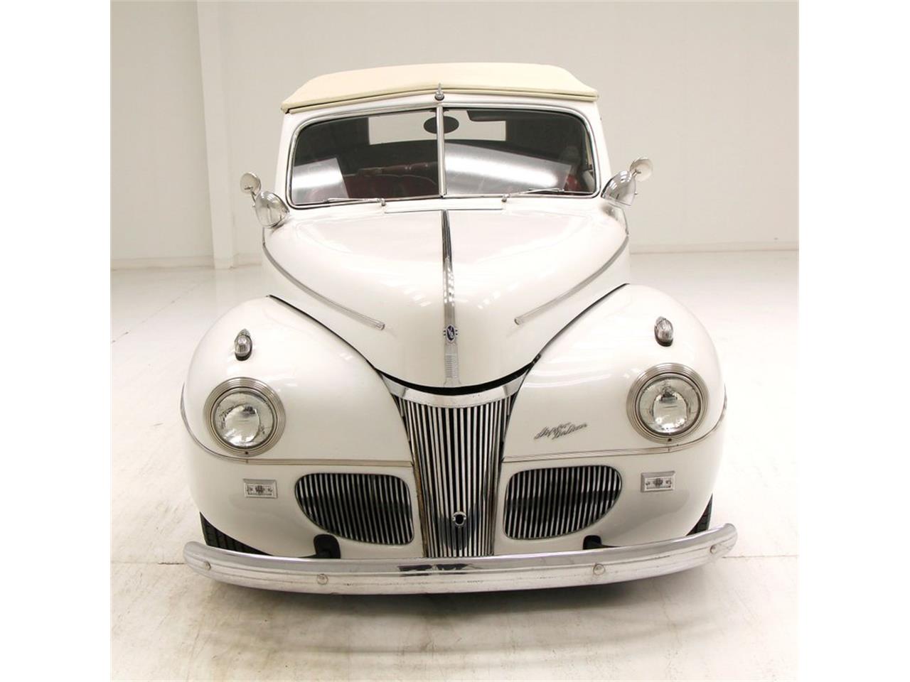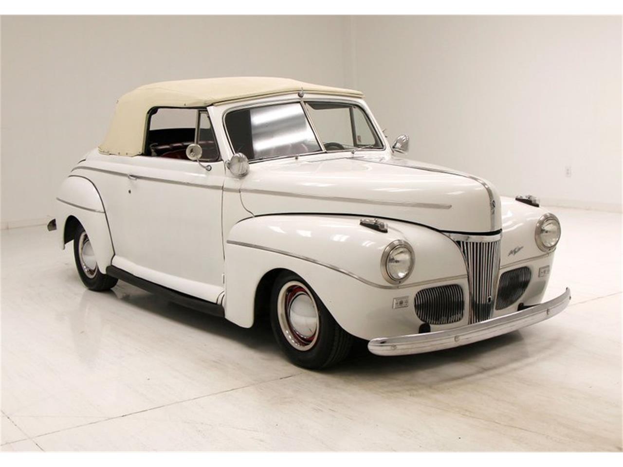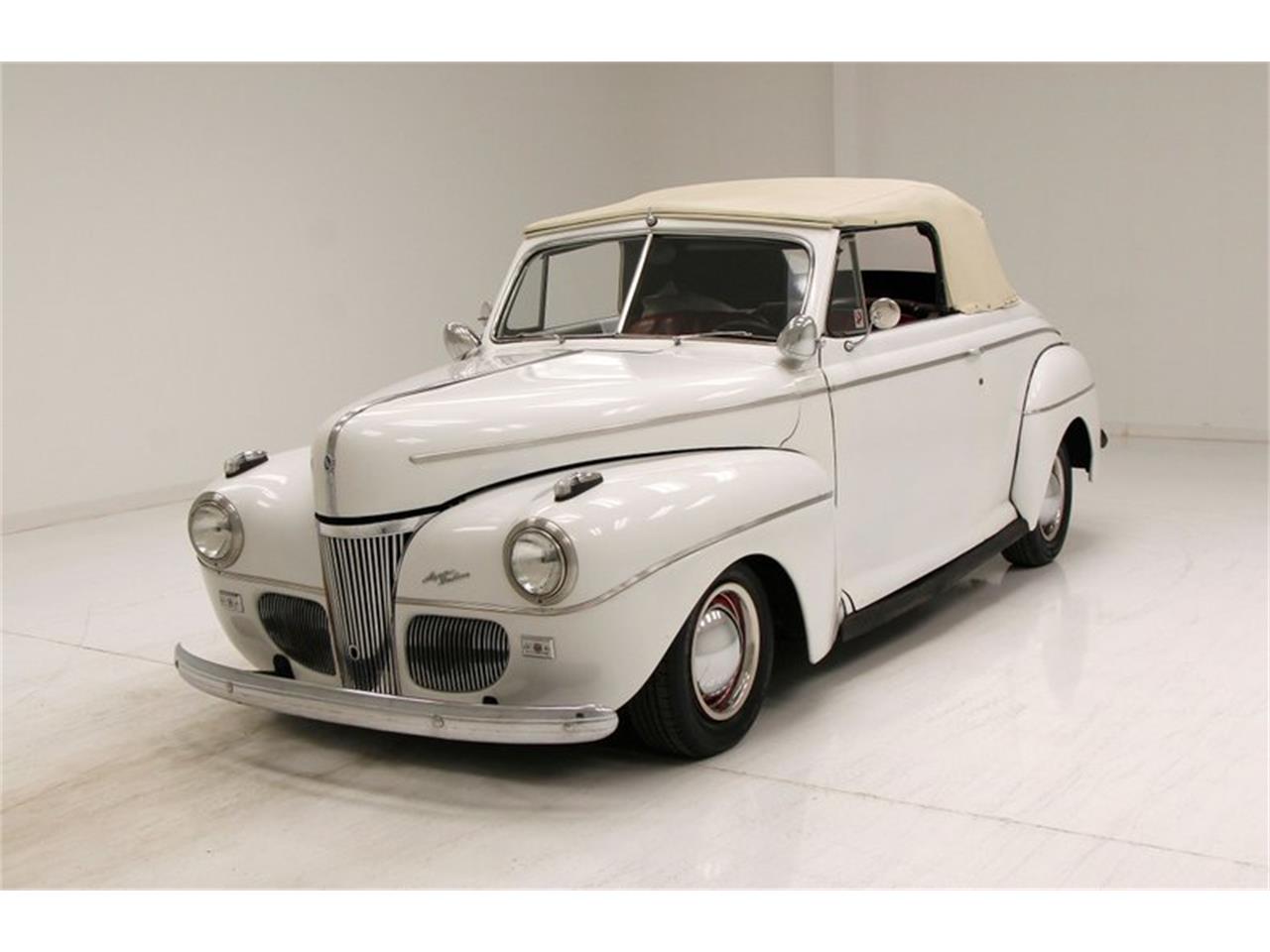 1941 Ford Super Deluxe Convertible - 305ci V8 - 1979 DNL coded engine. Up top is a Weiand intake and an Edelbrock 4-barrel carburetor to feed fuel and air to this newer mill. A TH350 3-speed automatic and a Ford 9-inch rear axle now finalize the drivetrain. This setup is now a 12-volt conversion electrical system. The original Art Deco inspired dash with simple layout and limited use of chrome accenting, now has a SONY aftermarket AM/FM/CD player neatly inserted into the dash top. All original knobs and pulls remain. Just below the dash is a digital readout tachometer, and digital gauge cluster which reads out in horizontal, green bar format. Door panels sport black shiny vinyl uppers which are nice and smooth, and below is a wild triangular patterned stitched oxblood red patterned panel to finish off the bottom of each door.