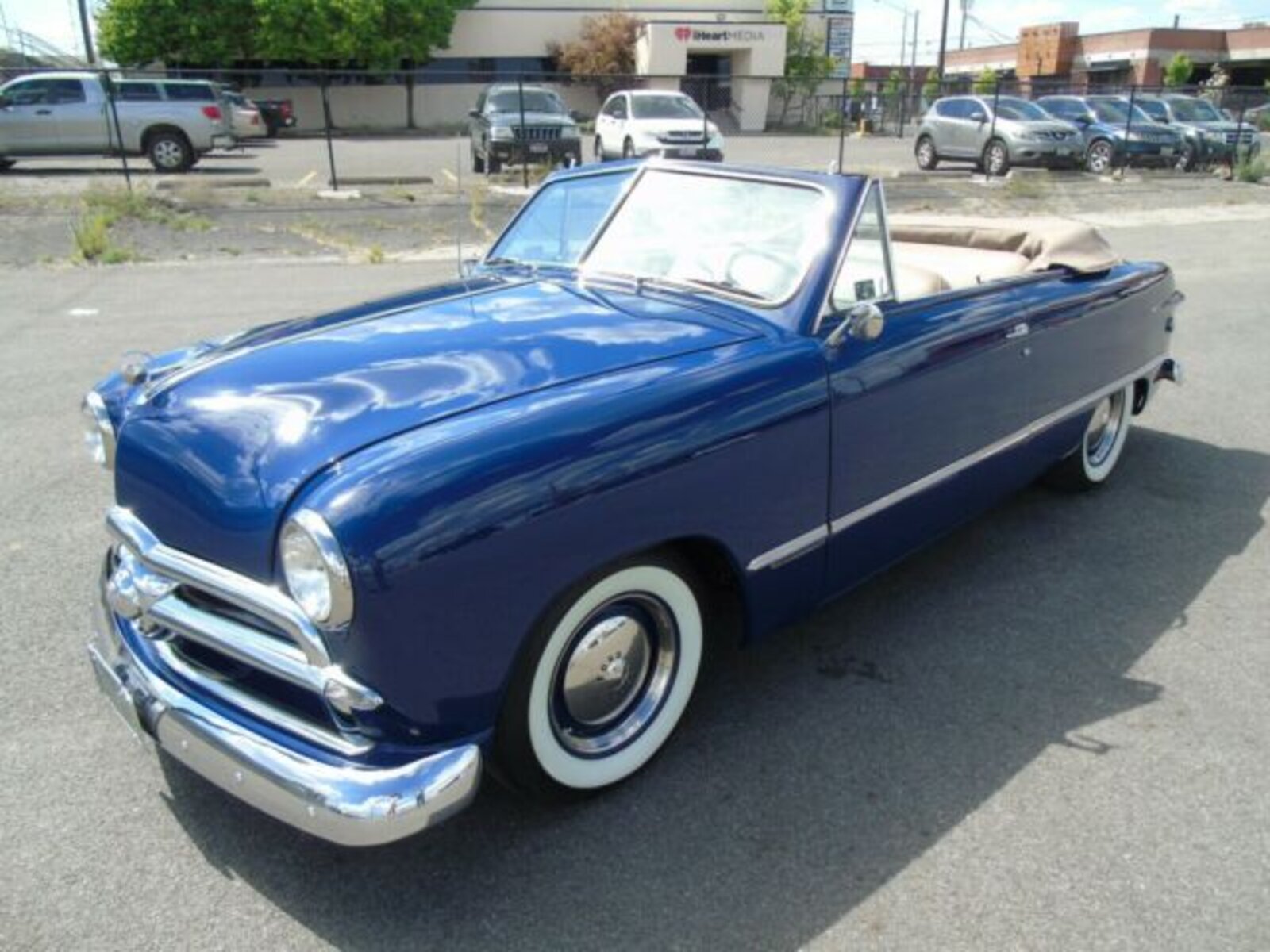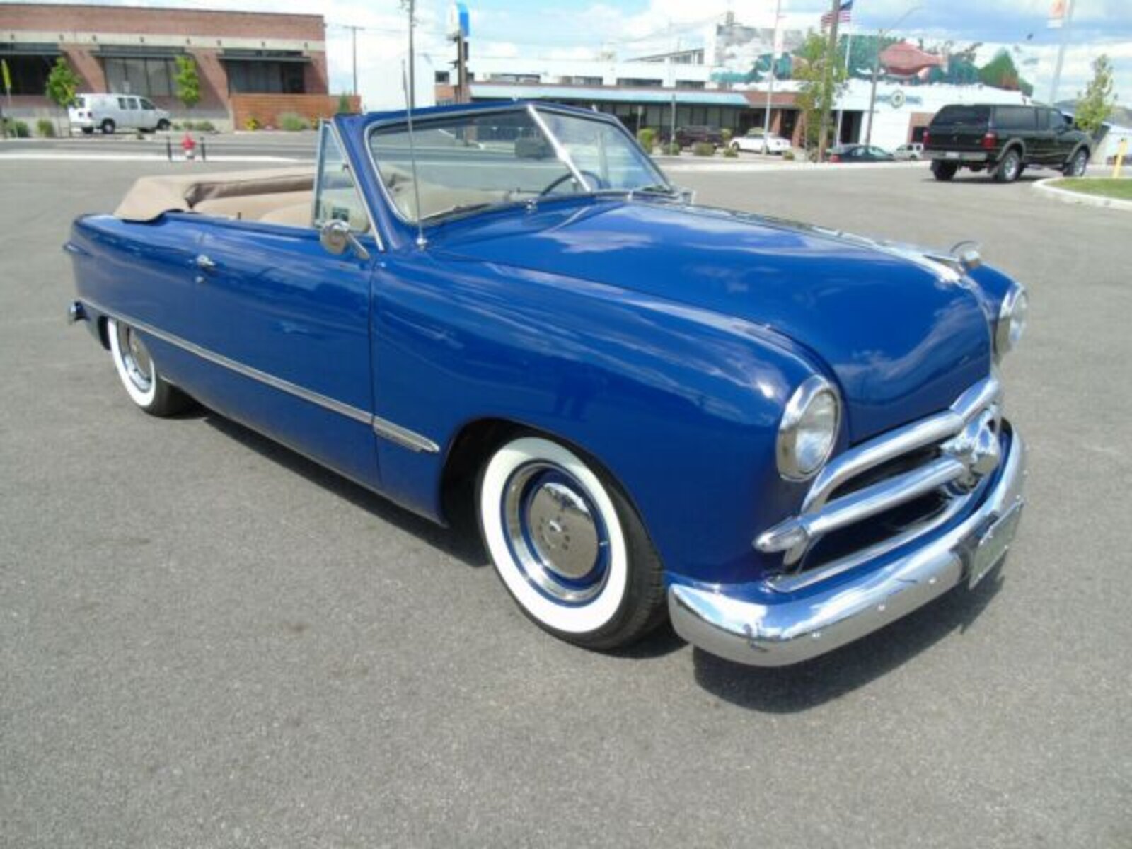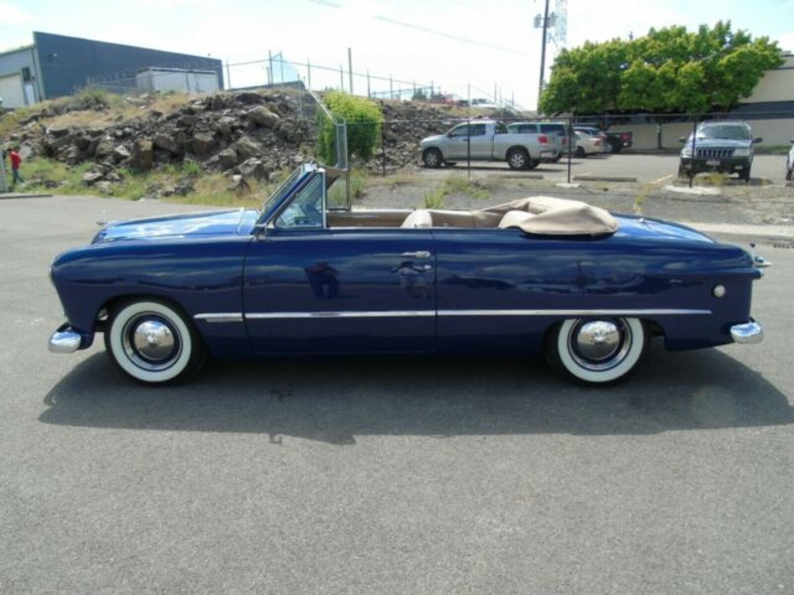 1949 Ford Convertible. Rust free. The top is tan high quality cloth with boot. The interior design is the same as original, but using a combo of high quality vinyl and cloth. The dash was customized with metal added to the bottom to accommodate the AC vents and blends really nicely. After market custom gauges, Cold AC with tilt column. Digital clock and AM/FM stereo with stock face. PS, PB and power top. Cut down steering wheel. 289 30 over, aluminum intake with Holley, MSD ignition with nice street cam. The trans is a C4 with an 8 inch rear end out of a Maverick with hiway gears. Power disc and drum rear with Master cylinder and booster mounted to frame. Factory 15 inch steel wheels with trim rings and caps. Radial tires are Coker 205/75 15 in like new condition. Great condition.