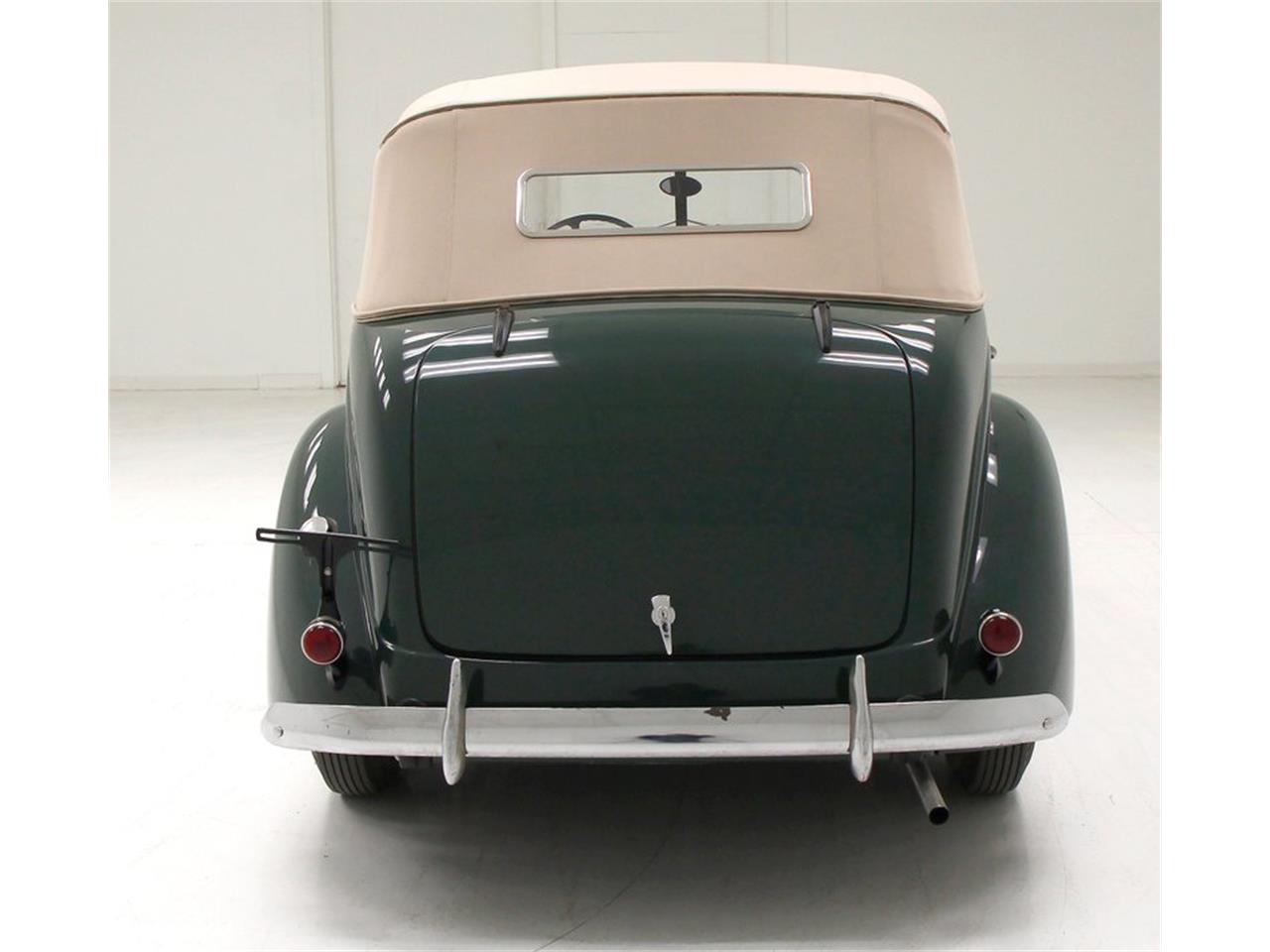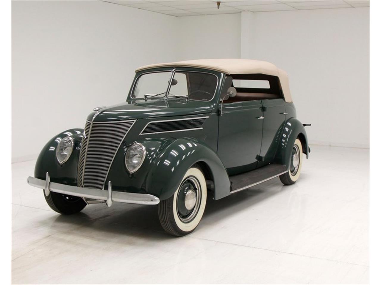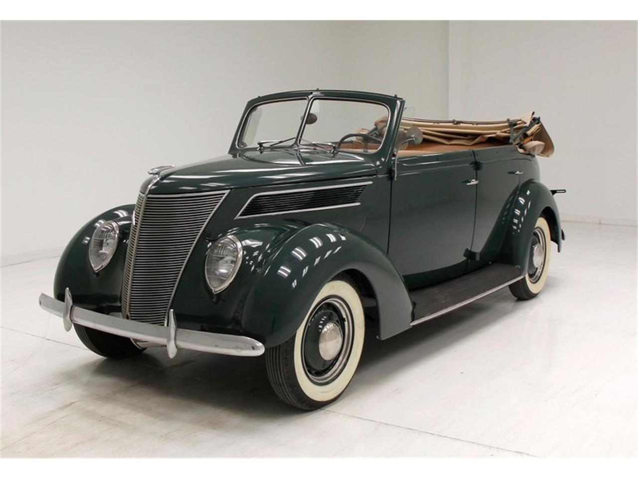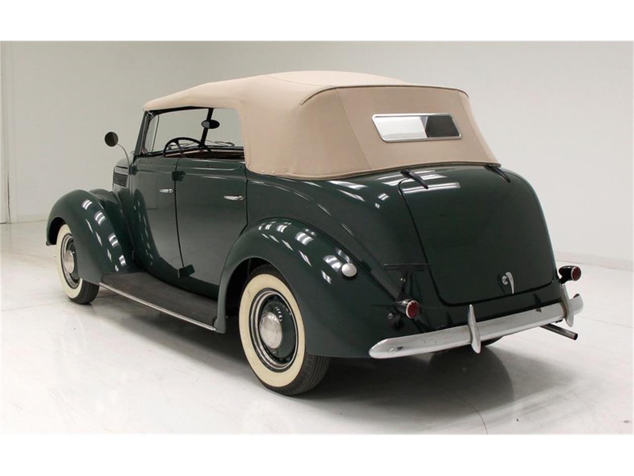 1937 Ford Phaeton. Exterior With its curved v shape swept back horizontal ribbed grille and teardrop headlights which are slowly evolving into one unit with the fenders, this running board style car is bathed in Bright Vineyard Green. Gently curving bulbous lines abound on this car, with nice gaps and deep paint. A tan convertible top with a clear glass window moves up and down effortlessly. Interior Wonderful warm wood pattern painted on the metal dash with aged cream gauges and saddle brown vinyl bench seats for the front and back and it just feels like an old friend. An original banjo style steering wheel fronts all this warmth. Plus, you 're going to need it if you venture out with no roll up windows to protect you! Unrestored side curtains come with the car and will help keep out the cold on a winter day. Beautiful clean warm carpet covers the floors as well as stitched saddle brown vinyl covering all the door and side interior panels. Like a cup of hot chocolate with some marshmallow on top, sitting right next to the fireplace. Drivetrain 221ci Flathead V8 is tucked neatly into a clean engine bay and presents nicely. A single 2-barrel carburetor is on top clean by an oil bath cleaner. There is a 3-speed manual transmission on this car as well as a 3.78 rear axle.