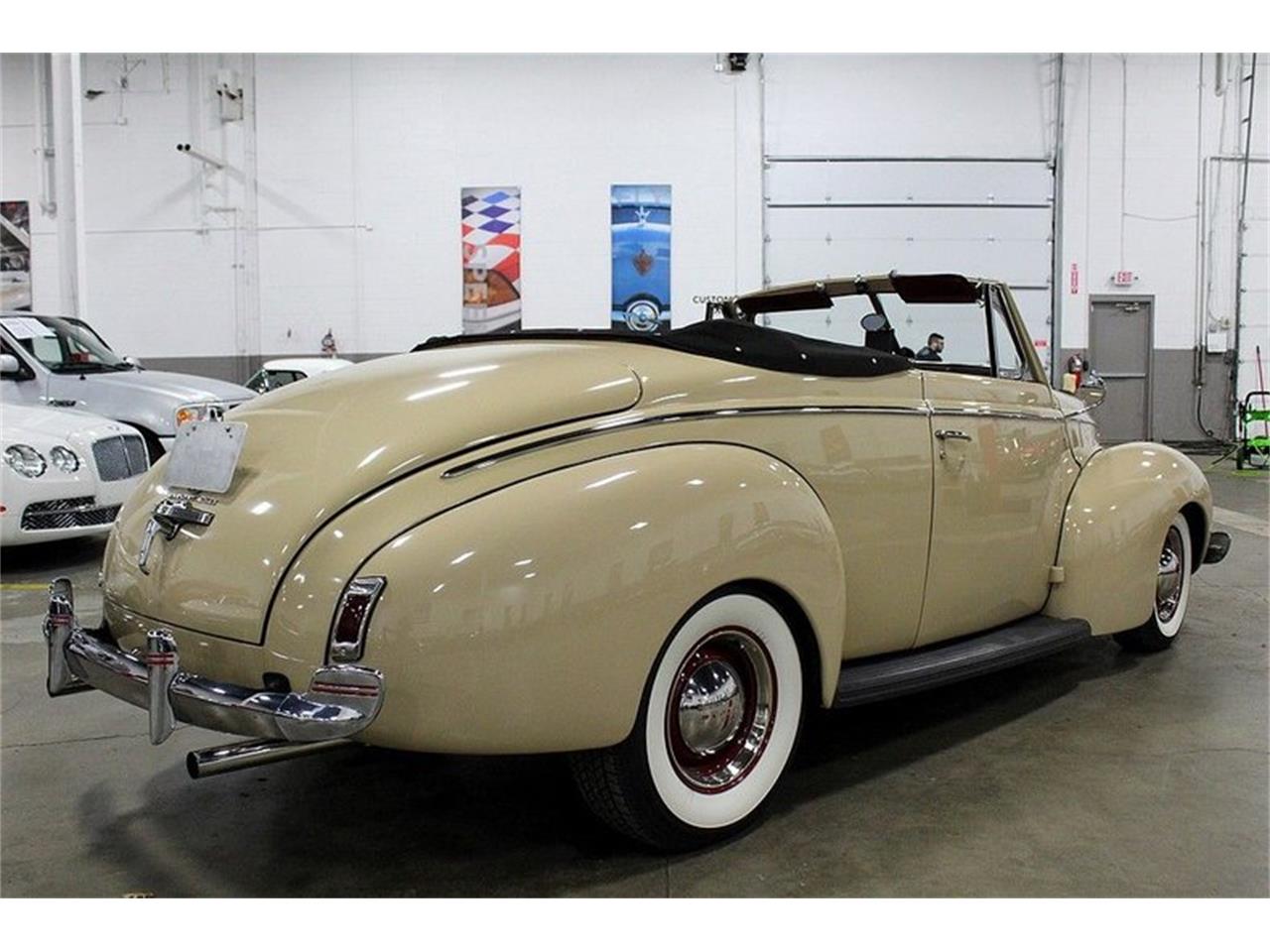 1940 Mercury Eight Convertible. This stunning vehicle comes in an immaculate tan paint job complemented by a spotless red interior and a clean brown convertible top. The convertible top is in exceptional condition and functions as it should. Powering this stunning classic is a 239 cubic inch V8 motor mated to 3 speed manual transmission with a Columbia 2 speed rear end with overdrive. Upgrades to the 239 include a 12v conversion, electronic ignition, Fenton headers, full stainless steel exhaust and more. Other upgrades include a back-up camera, tachometer, voltage gauge, vacuum gauge, turn signals, tube shocks, front sway bars and more.