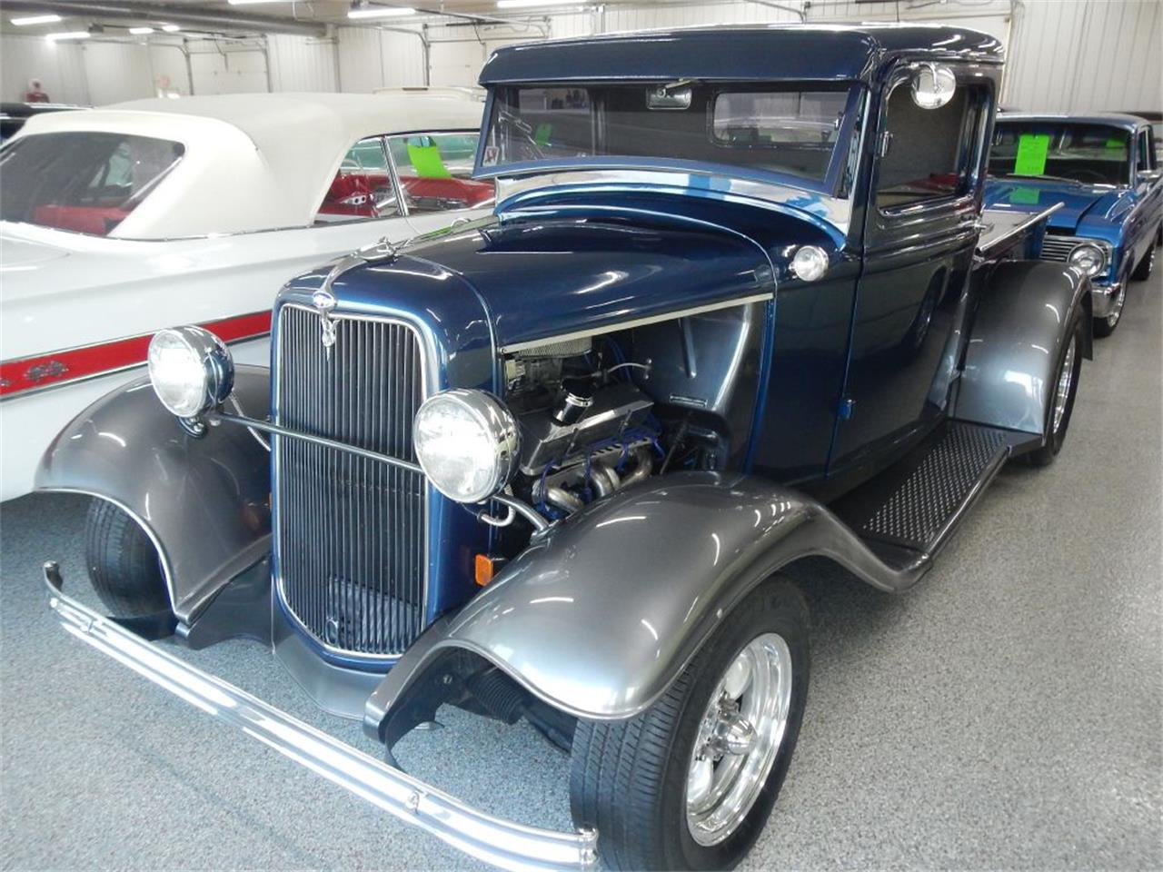 This stunning 1934 Ford Model BB Pickup is a prime example of a fully custom ride. Finished in a gorgeous deep blue metallic and gray accenting metallic paint along with a tastefully updated interior sporting two-tone grey and black paneling. Sitting on an aftermarket chassis, this truck boasts independent front suspension, aftermarket shocks, rear trailing arms, and power front disc brakes. A power rack and pinion has also been fitted to modernize the steering. This ride is powered by a 350 Chevrolet V8 engine, backed by a 350 Turbo 3 speed auto transmission. Under the bed of this pickup sits a GM 10-bolt rear end equipped with a 3:55 gear ratio. The engine was left no detail to spare as displayed by the aluminum valve covers, chrome alternator, and overall cleanliness of the engine and its bay. This engine sounds just as great as it looks, pushing power through true dual exhaust complimented by chrome exit tips.