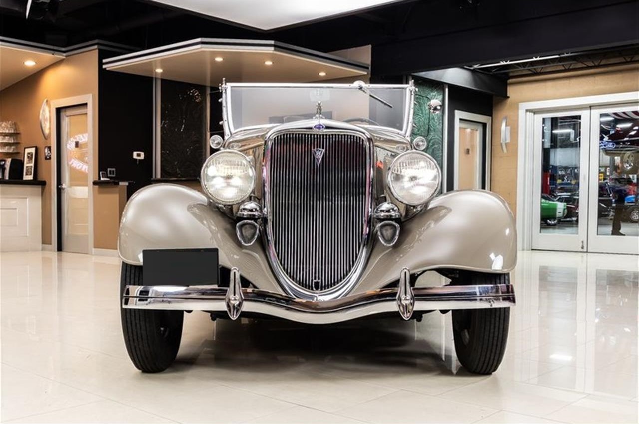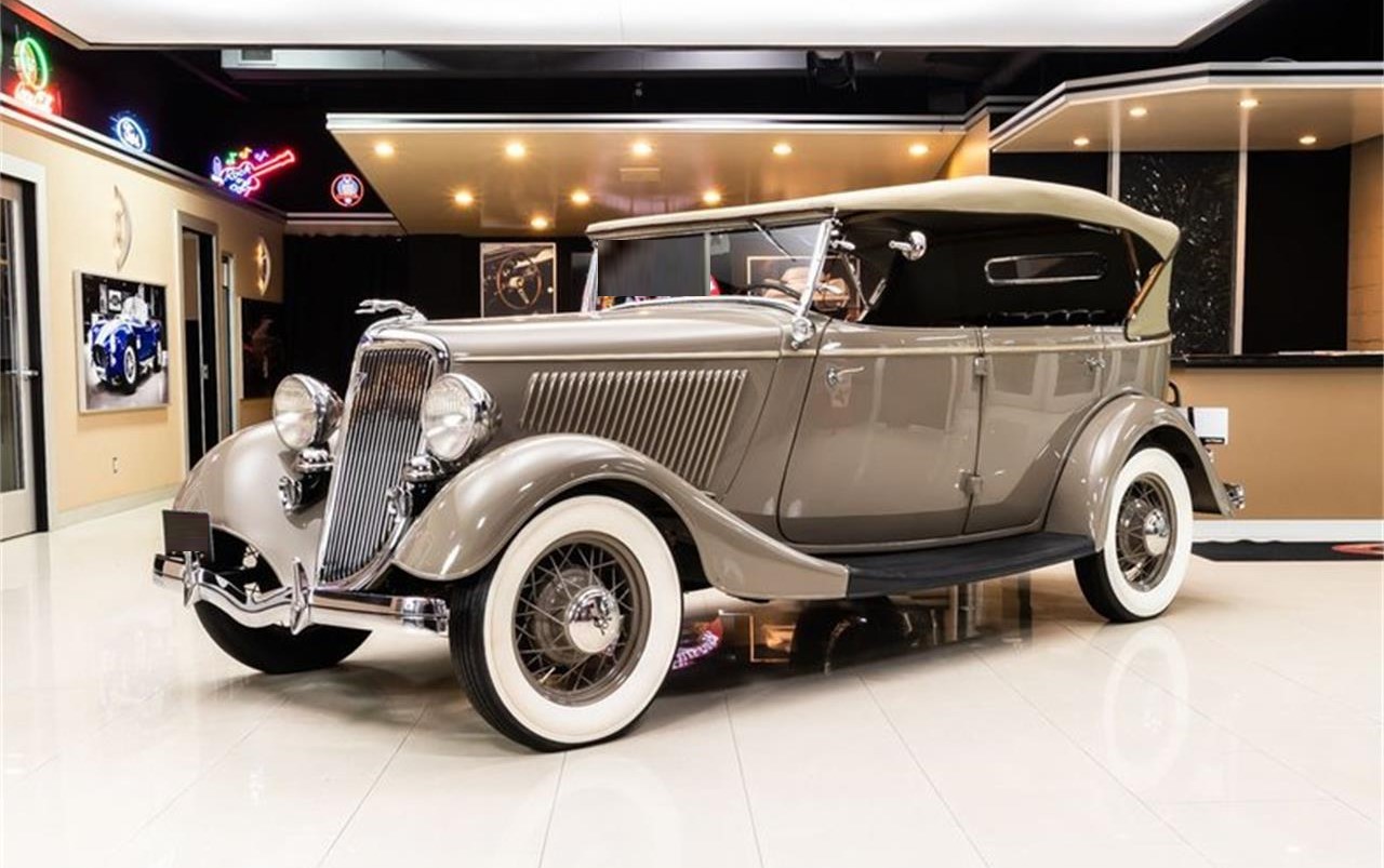 1934 Ford Phaeton. Check out this gorgeous 1934 Ford Phaeton. This Ford has a undergone a beautiful restoration and the Gray Paint Finish, Pinstriping along the body, Manual Covertible Top, Brown Interior, Wire Wheels, Whitewall Tires, Luggage Rack, External Spare Tire with Body Color Cover, Suicide Front Doors, Dual Horns, Greyhound Hood Ornament.
