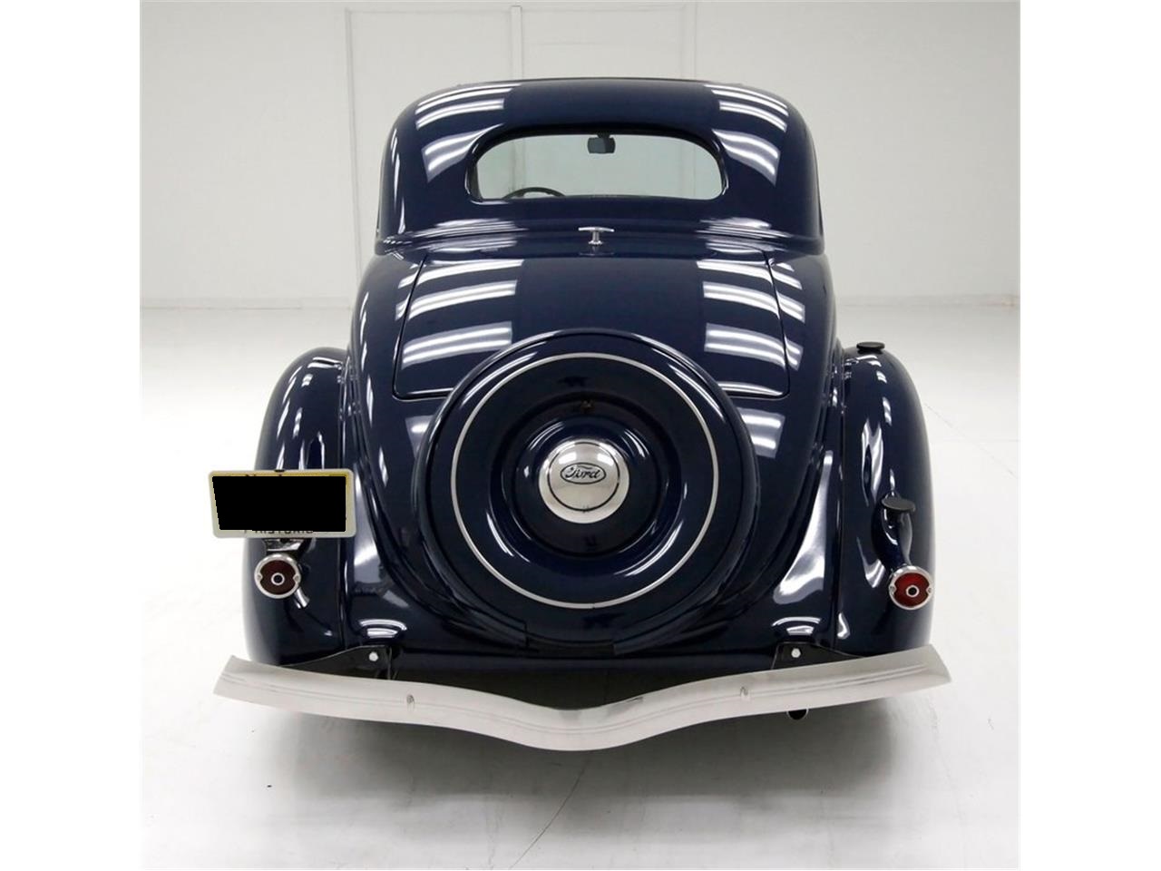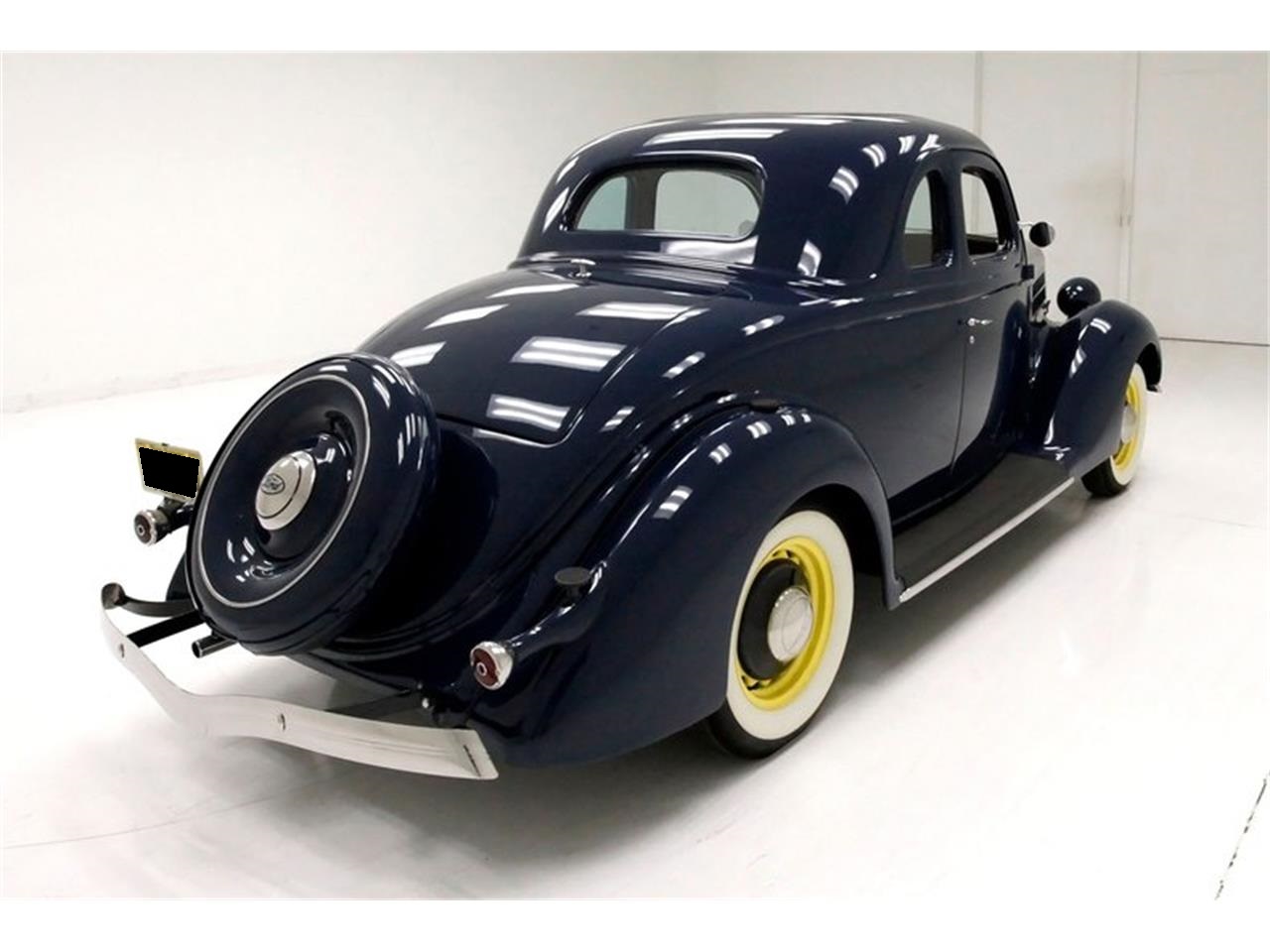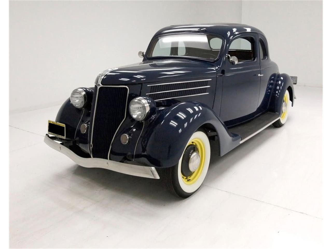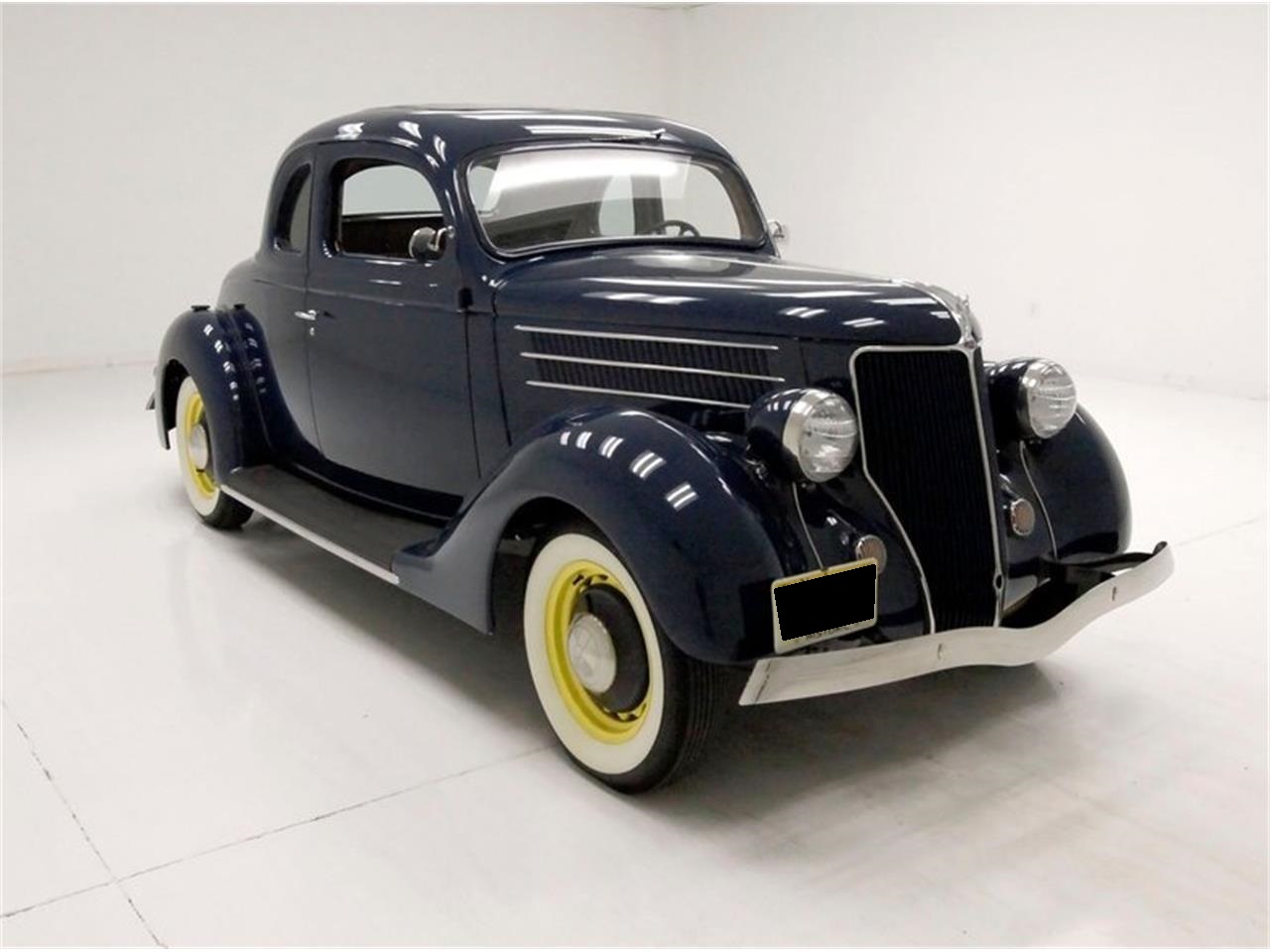 1936 Ford 5 Window Coupe. Washington Blue paint in nice condition bathes the exterior panels. Bumpers with their inverted eyebrow center dip, headlight bezels, handles and mirrors are all excellently restored with no dimpling or rusting. From its vertical ribbed "shield" style grille complete with blue oval and V8 hood adornment. A shout out to the curved back where a mother in law seat (rumble seat for the politically correct) is hidden but opens with the twist of a handle. This seat is covered with faux leather vinyl in tan. Nice running boards with excellent rubber connect the curvaceous fenders. A spare tire covered in steel and chrome rests above the rear bumper and hangs from the rear of this car. Nicely contrasting black and yellow painted steel wheels are topped with dog dish V8 engraved chromed center caps. These wheels are wrapped with correct and proper wide whites. Clean tan textured broadcloth covers the door panels, and tufted bench. A dark brown sprayed dash houses original Ford gauges and is trimmed in chrome in the art deco style. A single aftermarket gauge hangs below the dash, and fronting it is a restored banjo style steering wheel which is to die for...it's just beautiful. Black rubber covers the floors and mohair cloth is on the ceiling. A V8 with 239 Cubes in flathead form is buttoned up under the side hinged hood. A single 2-barrel carburetor tops this mill, and a 3-speed manual transmission and 3.78 gears make up the drivetrain.