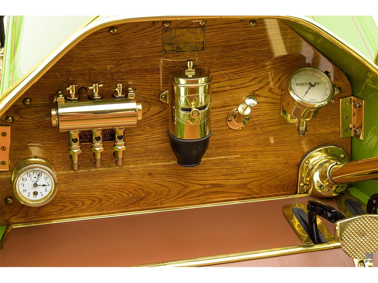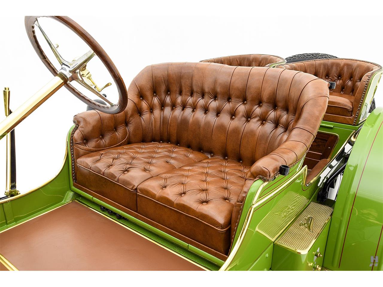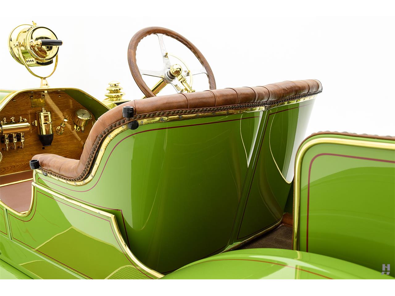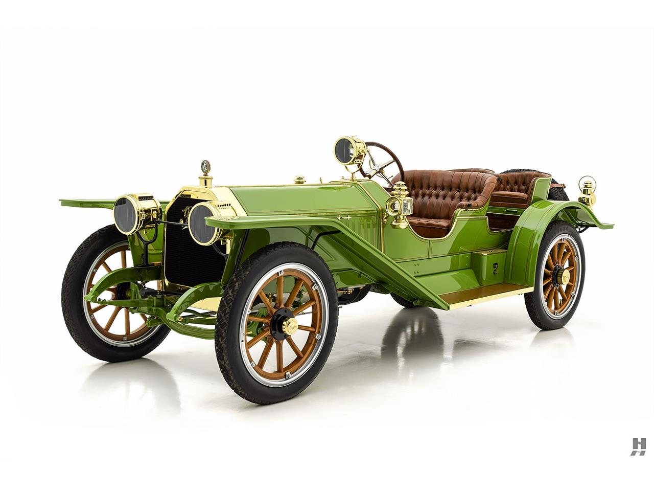 The incredible Peerless Model 25 presented here is a stunning Brass Era sporting motorcar, with power and presence in excess. This car wears evocative four passenger open coachwork of newer construction, crafted in the spirit of the factory raceabouts of the period. It presents in a bold and striking bright green livery with subtle deep red coach stripes and brightly polished brass accessories.