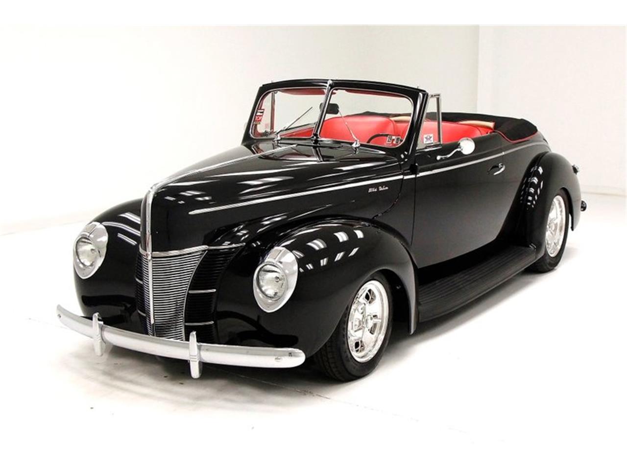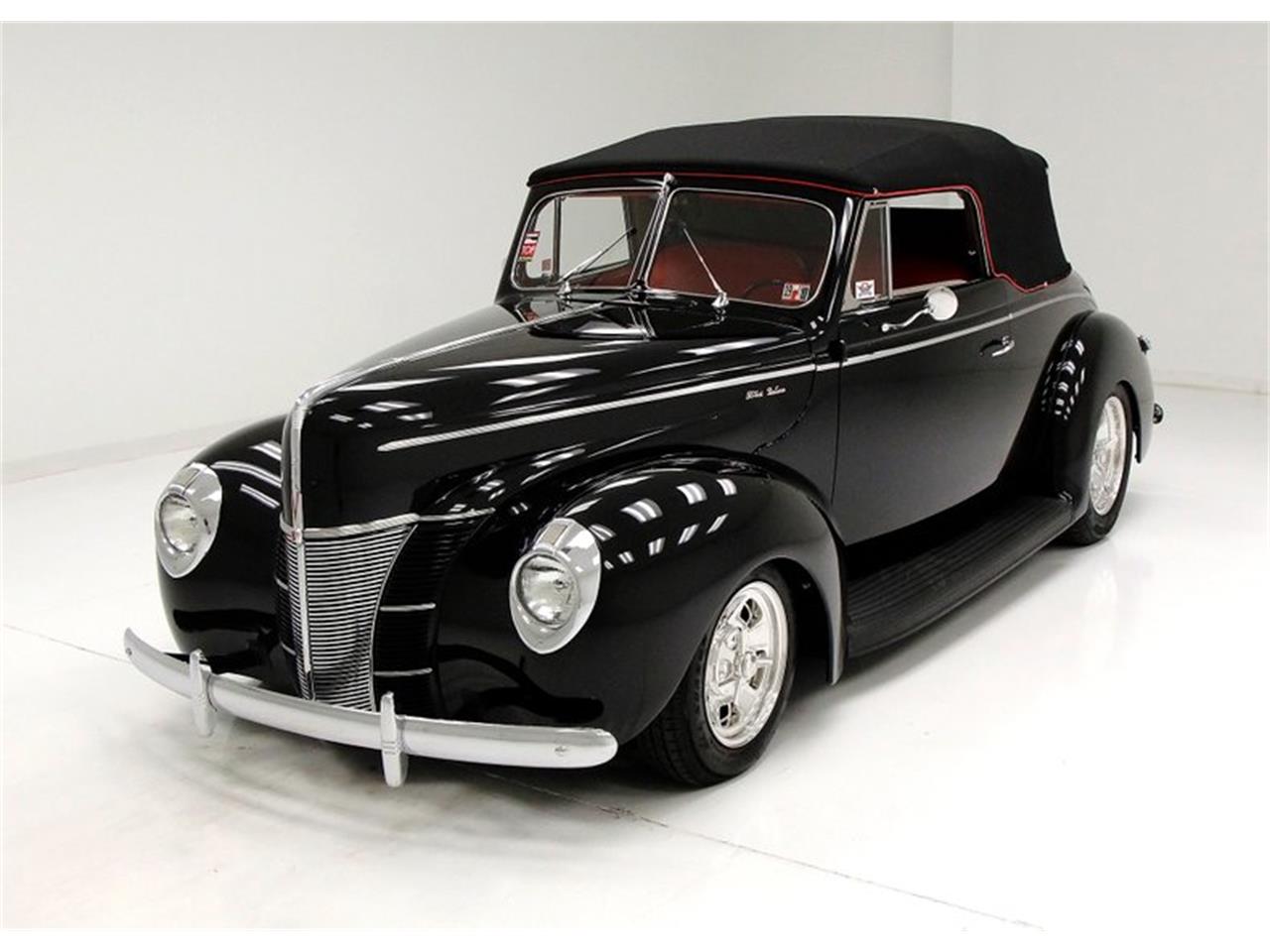 The clean styling of Fords 1940 offerings was one factor that drove sales to more than five hundred thousand units, a jump of more than fifty percent over the previous year. Part of this popularity could no doubt had to be attributed to Eugene Bob Gregories influence on the stylists who penned this design while he was chief of Fords design department, a post that he held from 1935 to 1943. It was a freshening up of a styling concept first introduced in 1939 by the addition of a new front end design. Sealed beam headlights were offered for the first time by the automaker on the 1940 model. Aside from being a major safety improvement, their design contributed considerably to the new look. Bathed in very nice black 2 stage paint, and adorned with near perfection chrome bumpers, badging, and britework, we have a rolling work of art. Very little was left unturned on this restoration, as lines are straight, gaps are really nice, and steel is straight. The large visored sealed beam headlamp bezels, flank a horizontal ribbed curved V grille and tall hood center. A nice chromed spear works its way back on either side along the belt line of the slightly curved sides. At the curved rear of this car we see 2 V shapes Sargent Stripe like taillights almost getting lost in the deep field of black paint. Gleaming billet style knockoff wheels are noted on all 4 corners. A pristine canvas convertible top with red piping prepares us for a gaze into the interior.