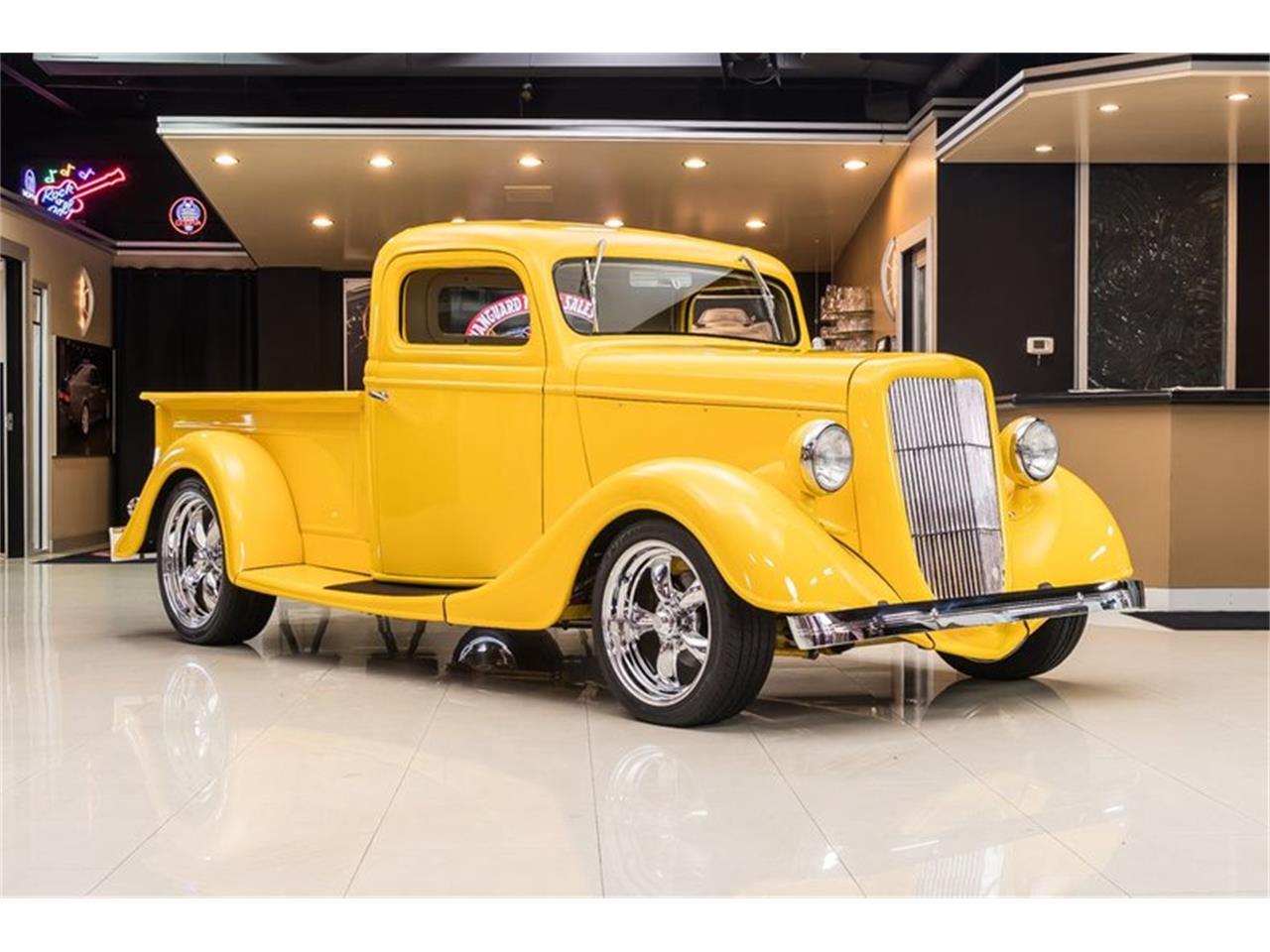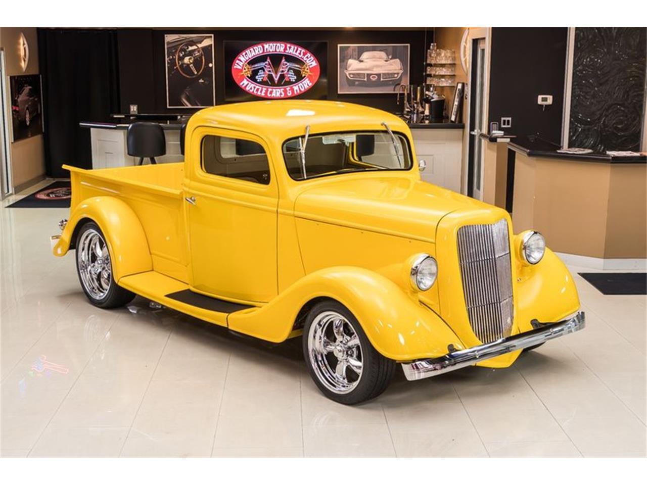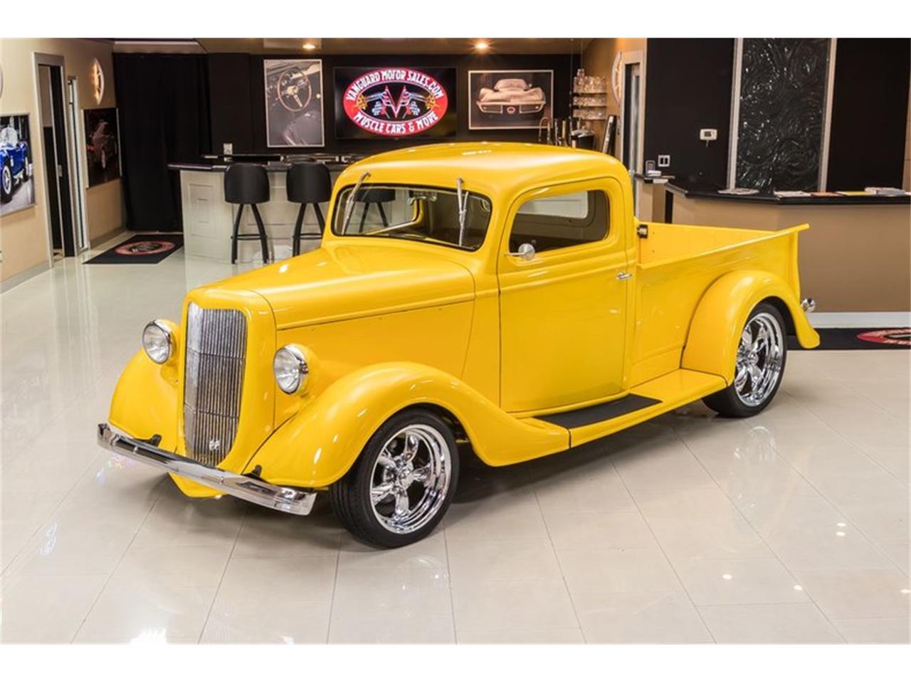 This gorgeous 1935 Ford Pickup! This Custom 35' Ford has a Fiberglass Body with a glossy Yellow Paint finish, Tan Leather Interior, Pinstriping throughout, Wooden Bed, and Polished Chrome Components all over that's sure to turn heads wherever you go! Under the hood sits an Electronically Fuel Injected Ford 4.6L V8 Engine mated to a T45 5-Speed Manual Transmission. Power is put to the pavement through a Ford 9'' Rear end with 3.73 Gearing. This truck drives great and you can cruise this 35' around town with ease thanks to the equipped Power Steering and Vintage-Air Air Conditioning!