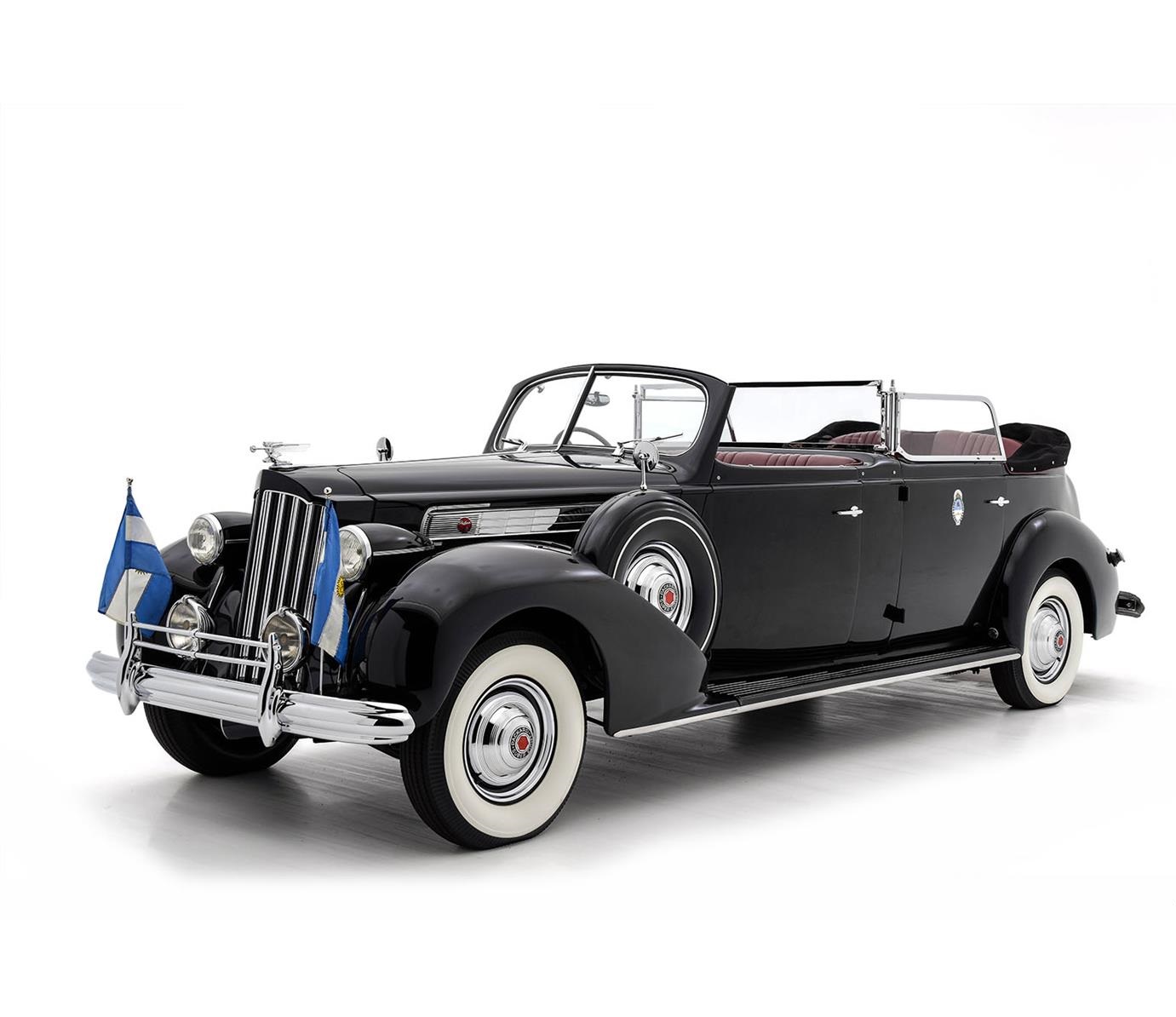 1939 Packard Super Eight for sale. Mechanically it is in good working order. The interior is especially marvelous, with intricate woodgrain work on the dash and the fabulous four-spoke steering wheel. The red leather has a subtle antique pattern to it, and it remains in very fine condition, with moderate character acquired from years of gentle use and care.