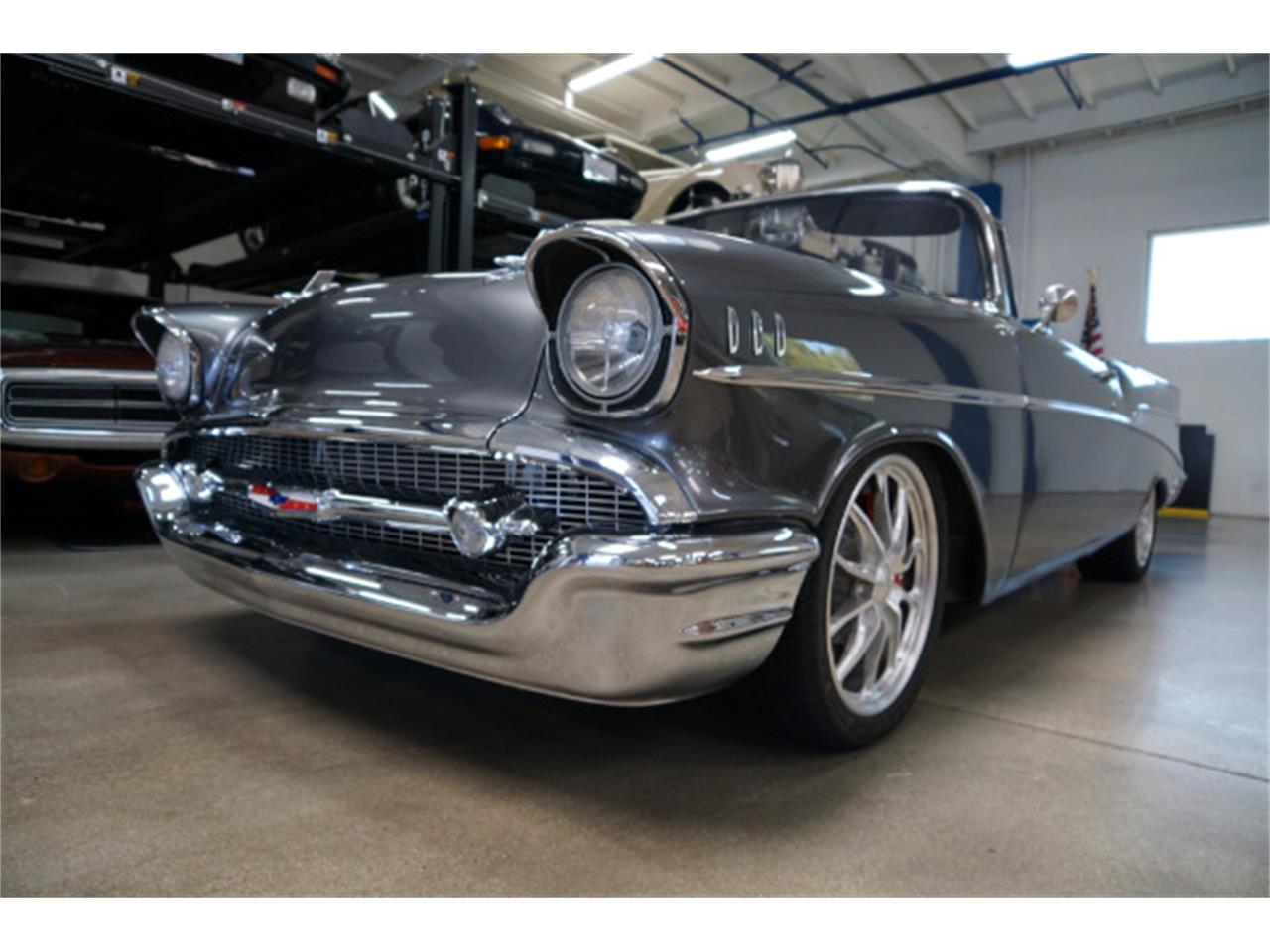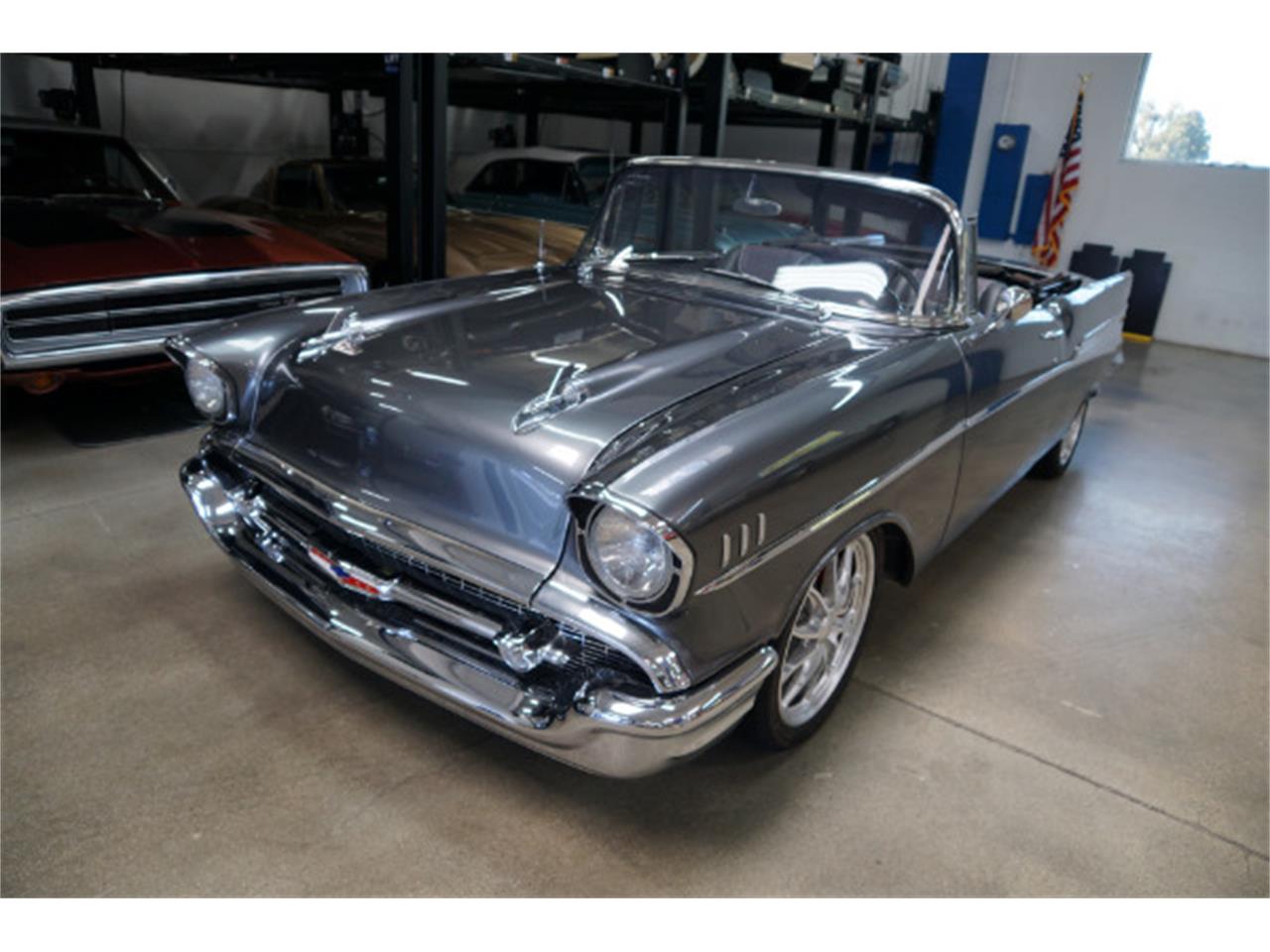 1957 Chevrolet Bel Air Convertible in a beautiful 'Dark Gray Metallic' color paint and with a striking 'Dark Gray' leather amp; cloth interior; with a LS3 6.2L V8 Corvette engine matched to a '4L80E' Corvette automatic transmission, Corvette suspension, Corvette rear end, Corvette 4 wheels disc brakes, air conditioning, stereo system, power top, power windows on a 'Newman' chassis.