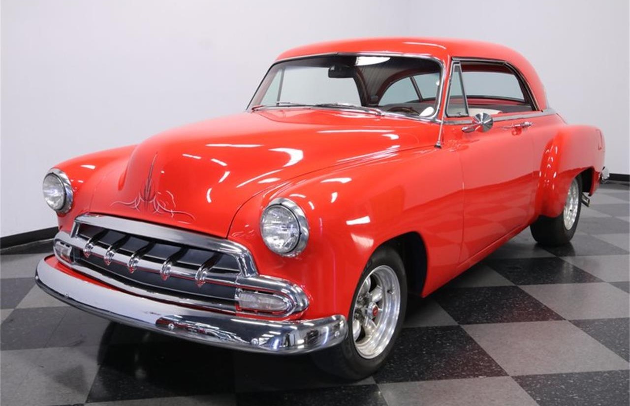 Sleek paint, pinstriping, V8 power, and plenty of custom details ,including an A C interior, all tell you that this 1952 Chevrolet Styleline Bel Air is a fun custom build.