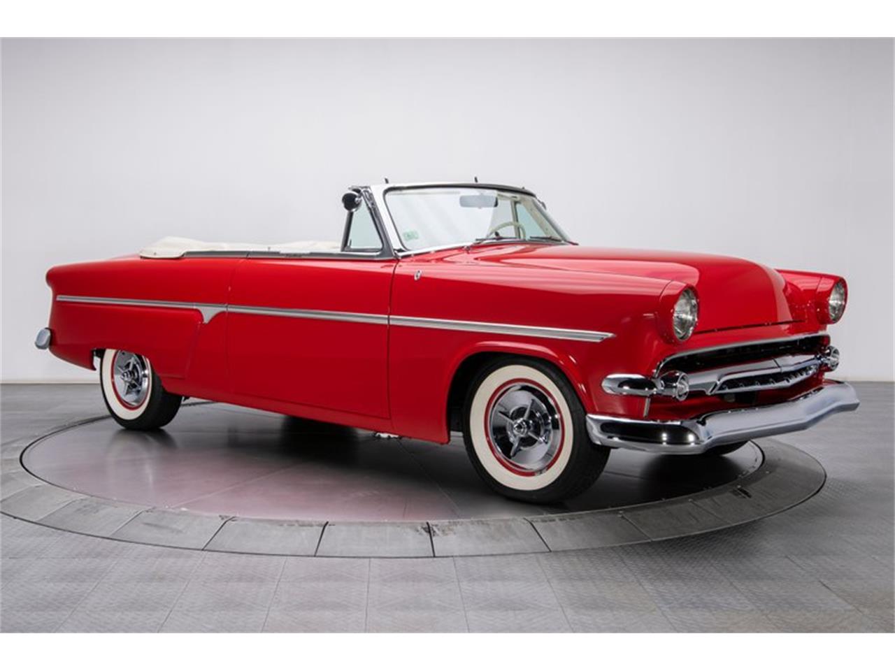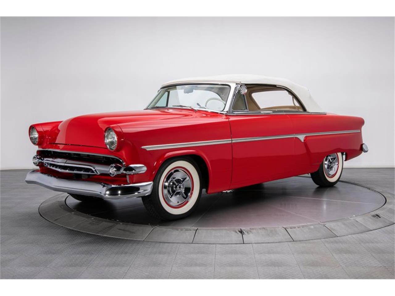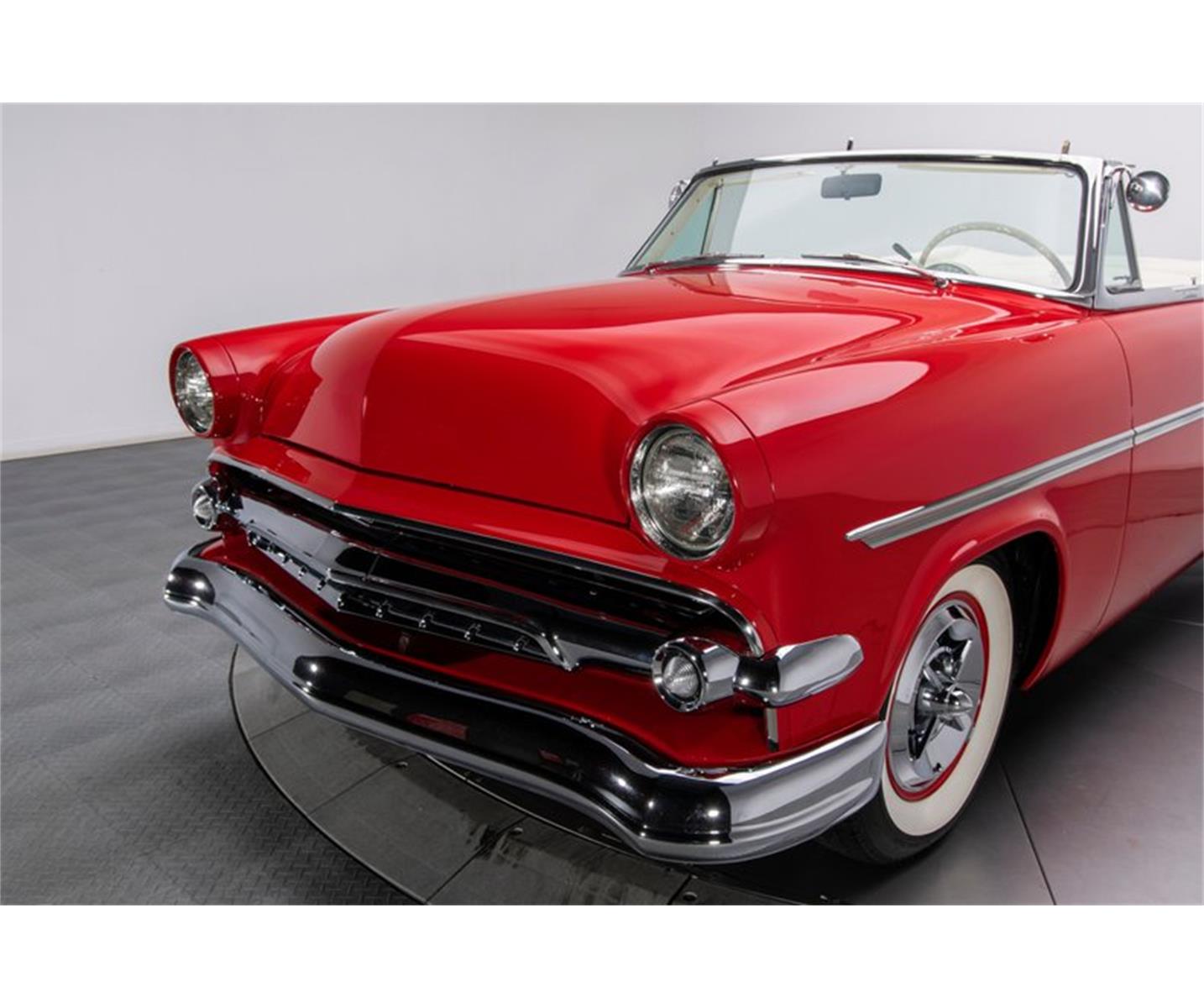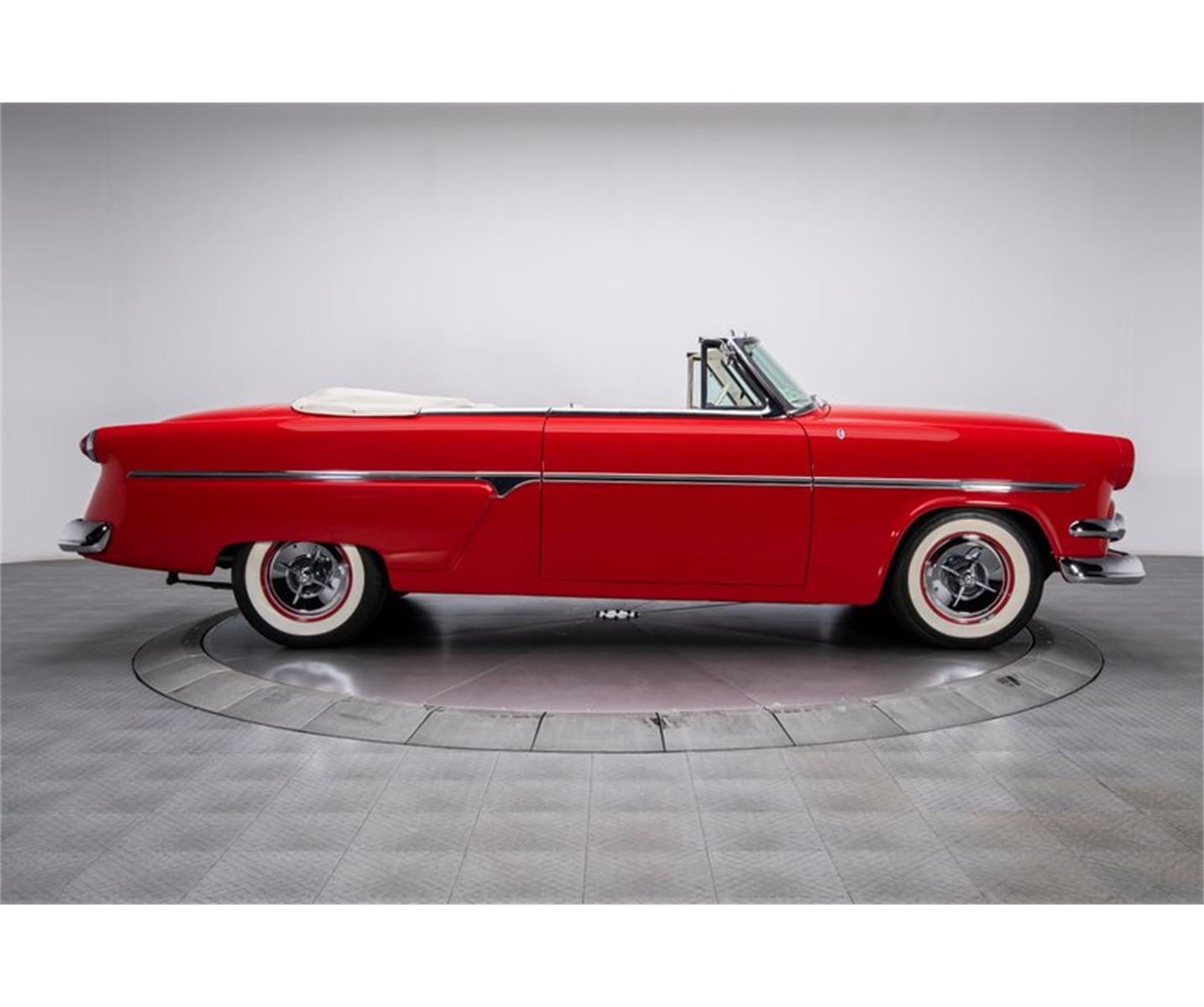 54 Ford Crestline. 351 cubic inch Windsor V8. C4 3-speed automatic transmission. Factory heat. Factory Master-Guide power steering. Upgraded suspension. Ivory vinyl interior. Tastefully customized body with a white convertible top. 15-inch steel wheels with Dodge Lancer-style covers.