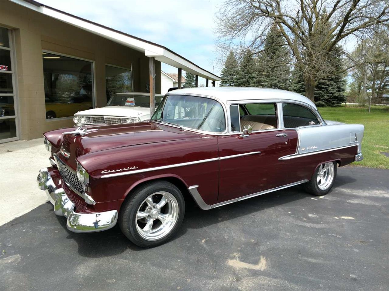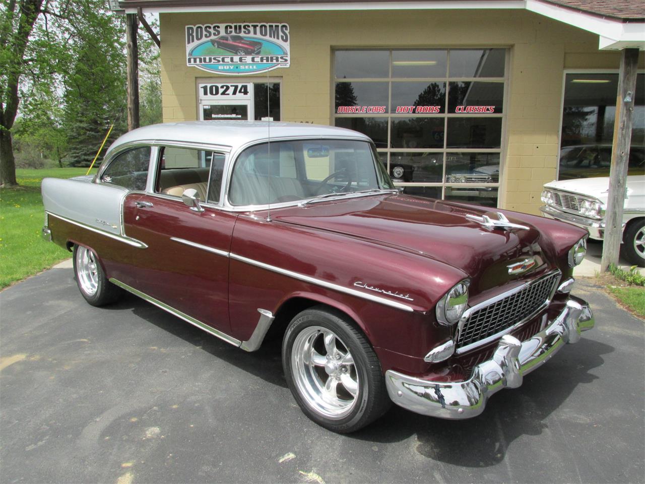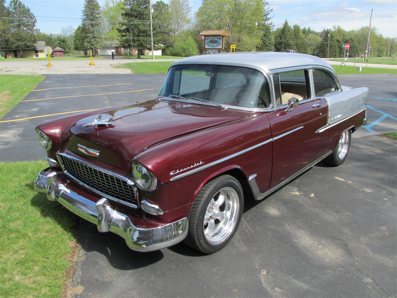 This is a beautiful 55 Bel Air 2 door post with lots of upgrades, painted Burgundy Metallic & Silver 2 tone base coat clear coat, new tinted windshield and rubber, new weather stripping and window felts, tinted side glass, all the original stainless has been re-polished in excellent condition, new door handles with accessory fingernail guards, new side view mirrors, new emblems, new parking light housings with LED lights, new grill and grill moldings, optional rocker moldings and accessory gas door guard, new taillight housings with LED taillights, front and rear bumpers are original in excellent condition - but do show some age.