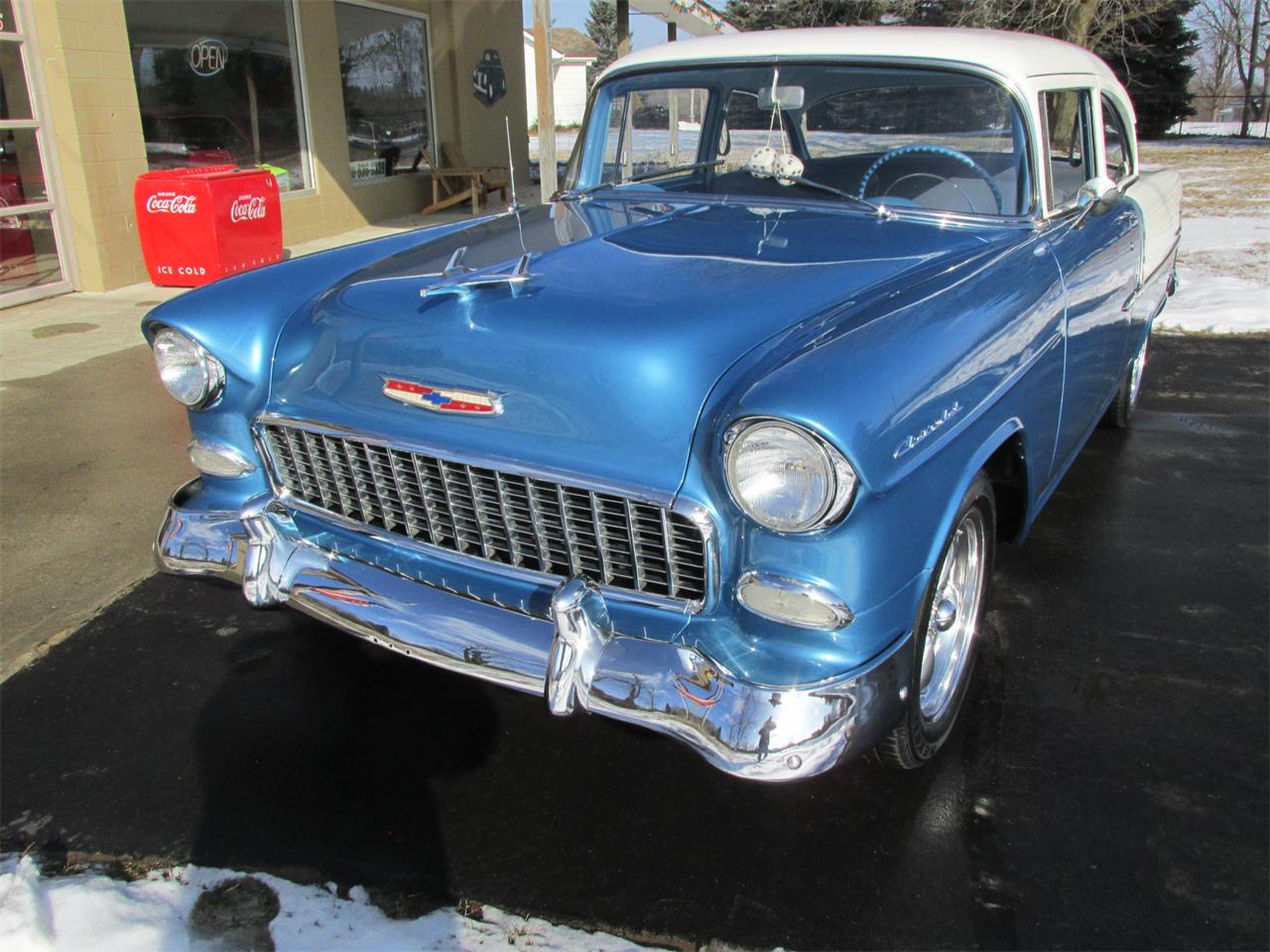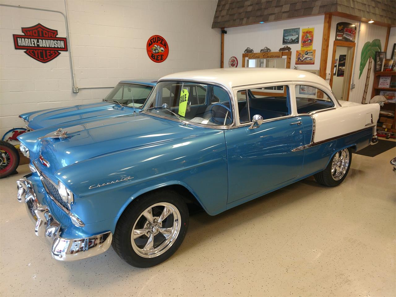 This is a beautiful 55 Chevy 2 door post, painted ,Show Quality.Marina Blue . White 2 tone base coat clear coat sanded and wheeled smooth, new weather stripping and window felts, windshield has been replaced, as well as side glass.