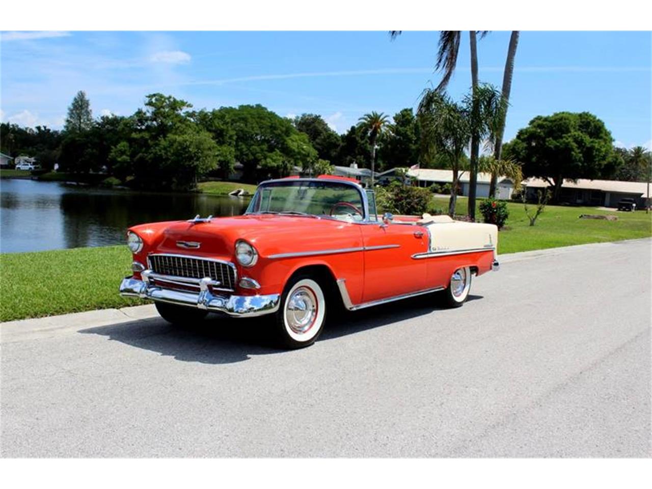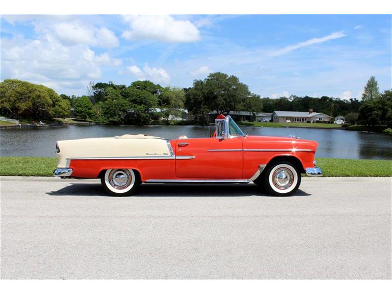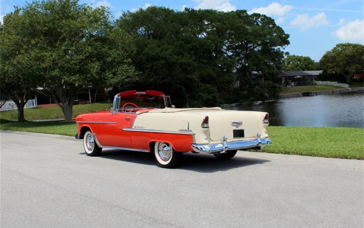 1955 Chevrolet Bel Air Convertible for Sale. True VC Code V8 Bel Air Convertible. HC suffix code 327 V8 engine factory rated at 275 horse power, Quadrajet 4 bbl carburetor, dual exhaust, detailed engine bay, polished copper radiator, 2 speed Power Glide transmission, 15 color keyed steel wheels with Coker wide white wall tires, Patina Gypsy Red and Shoreline Beige exterior, refinished in 1981, highly polished stainless trim, front and rear bumper guards, tan power convertible top with top boot, correct style two tone interior, rubber vintage style floor mats, under dash tissue dispenser, auxiliary gauges, upgraded AM FM auxiliary input radio, dual chrome sport mirrors, painted trunk.