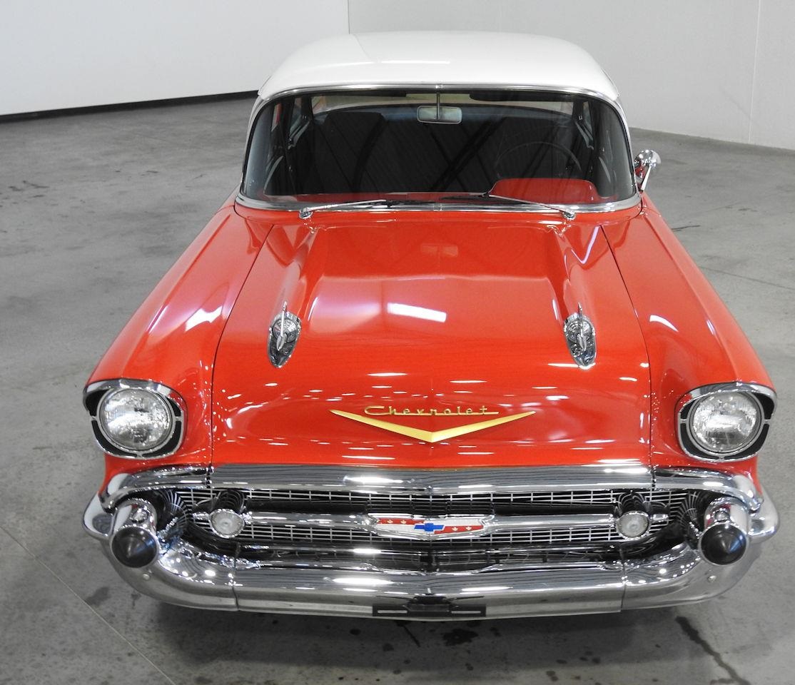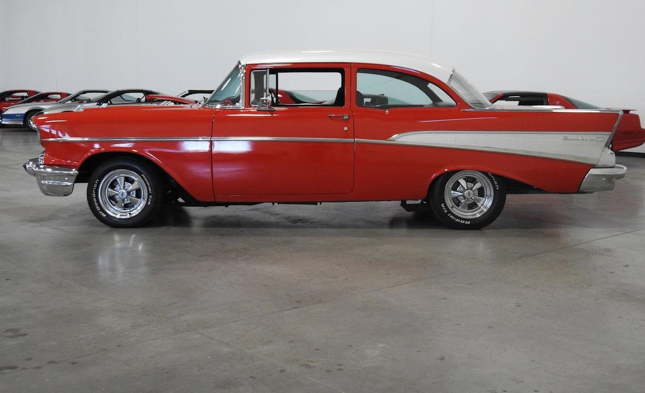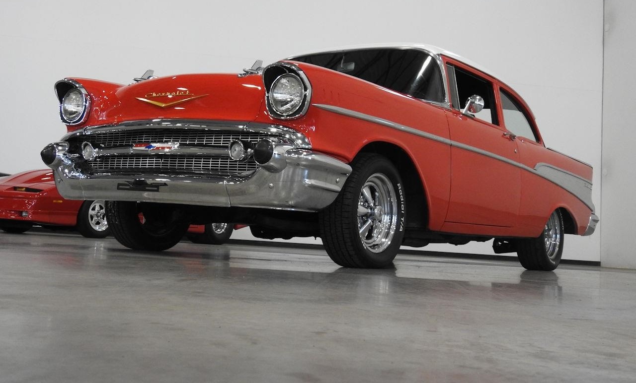 The talk is backed under the hood with a stroked 383 small block V8 topped with an aluminum Edelbrock intake manifold matched with the carburetor and chrome longtube headers supplying in the vicinity of 425 horsepower. The small block is backed by the every reliable TH350 3-speed automatic transmission which goes back to a 3:73 Posi rear end ensuring reliable amounts of tire burning fun. The Bel Air is also equipped with power windows, air conditioning, tilt wheel, power brakes, power steering, and a hidden kill switch for added security.