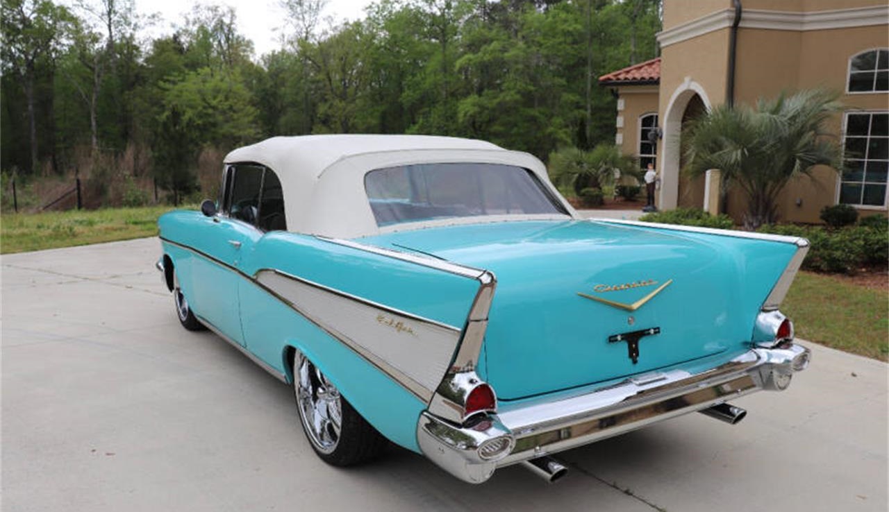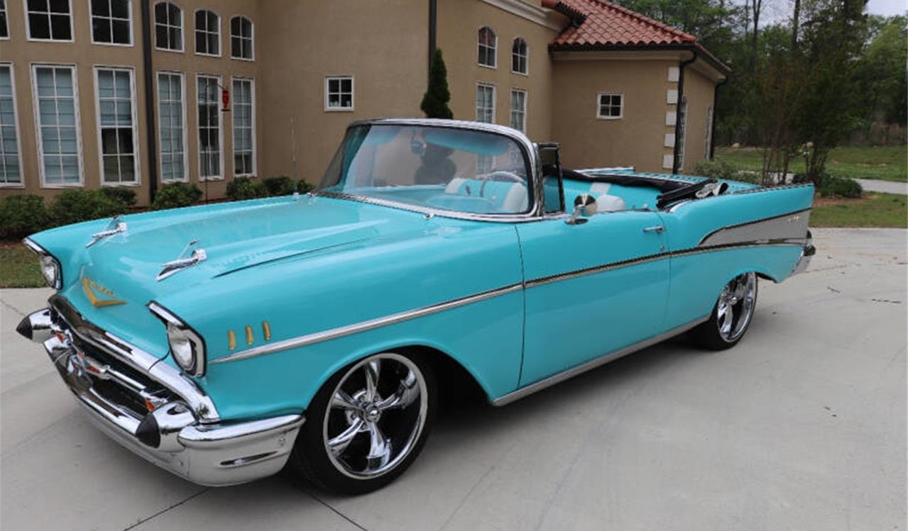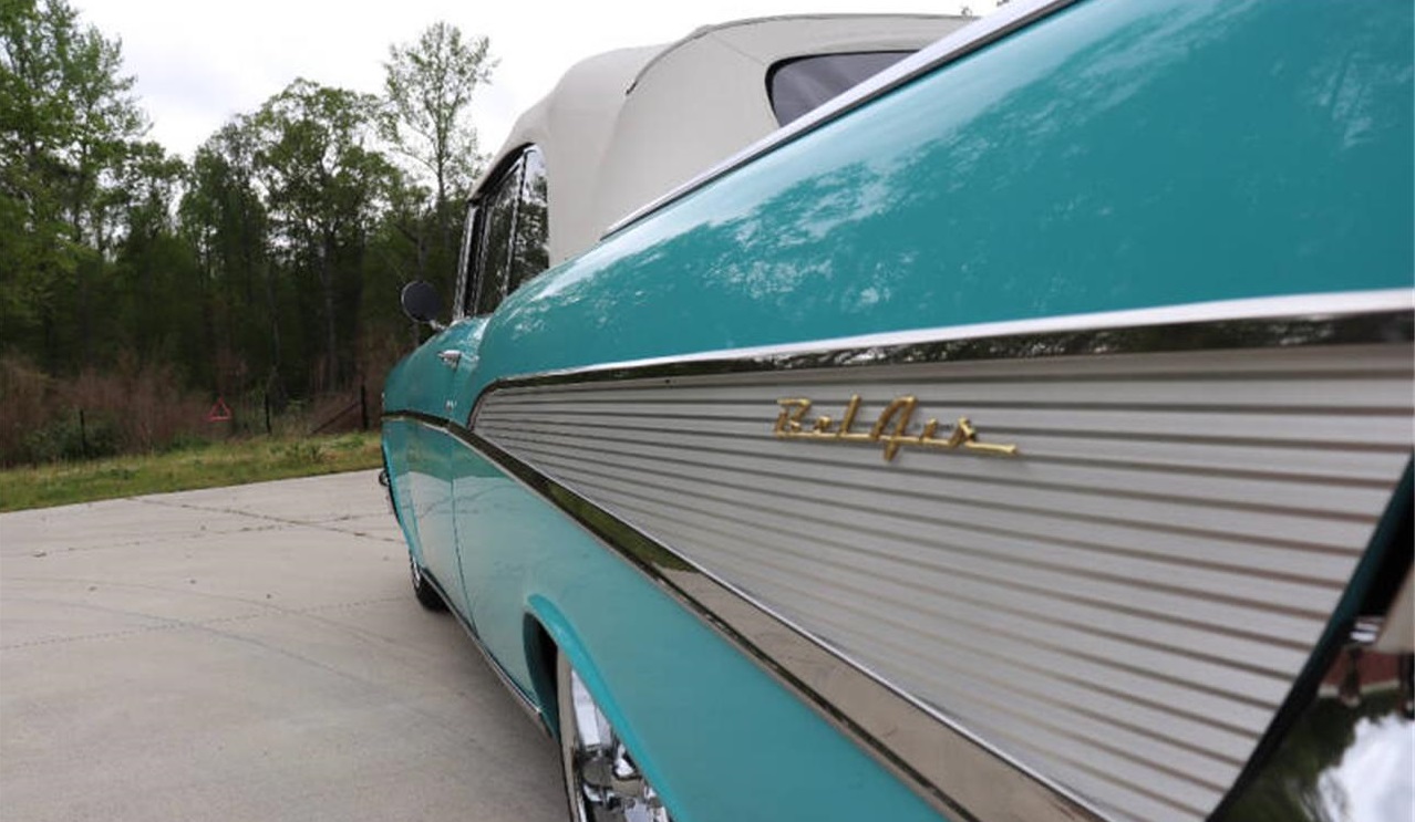 1957 Bel Air Convertible. Powered by Chevy 350 small block. 350 Turbo Automatic transmission. Original suspension, original chunk rear end Options. Power steering, power disc brakes. New Vintage AC. New Updated gauges. Power top. Tinted glass Interior.