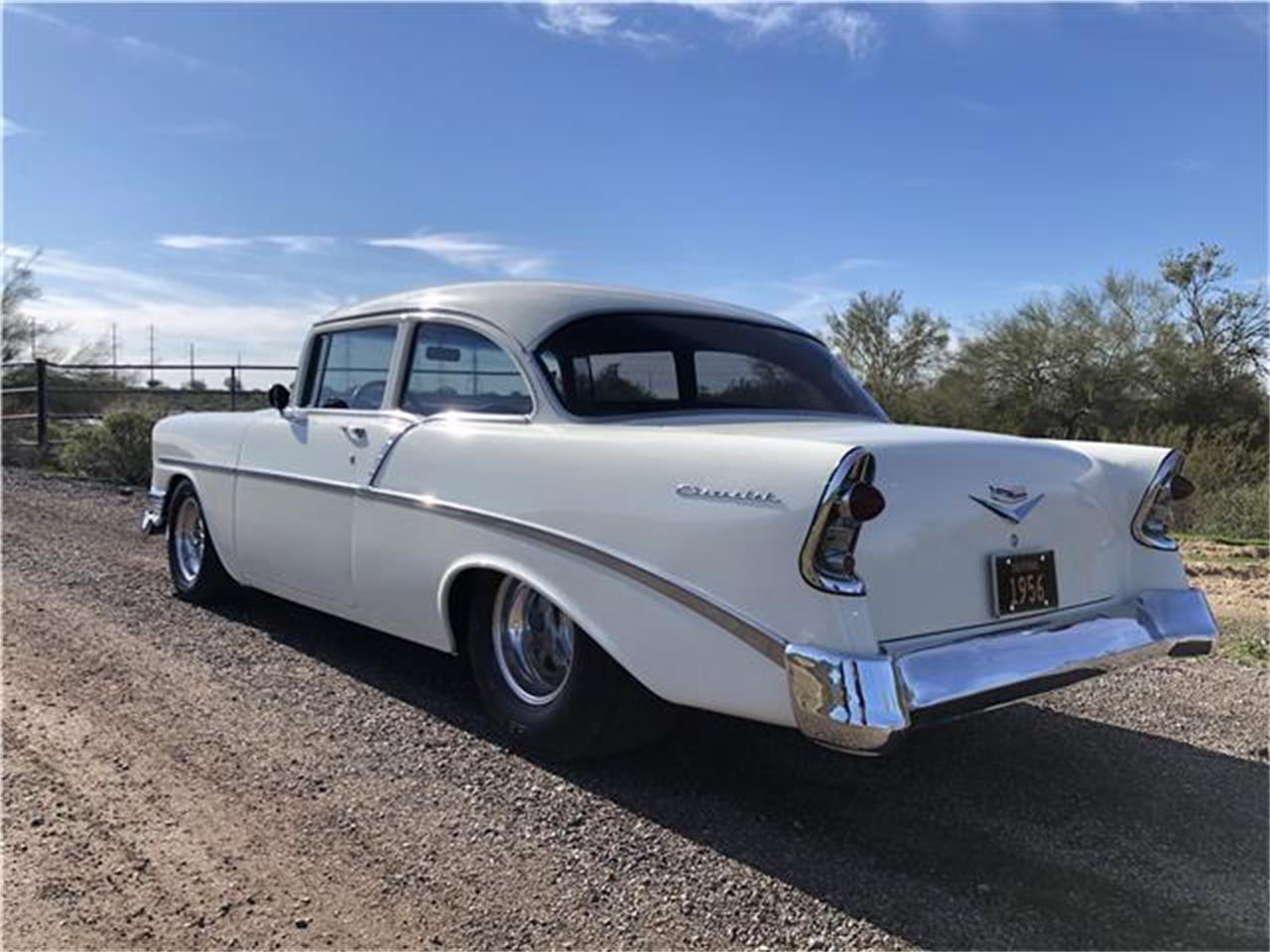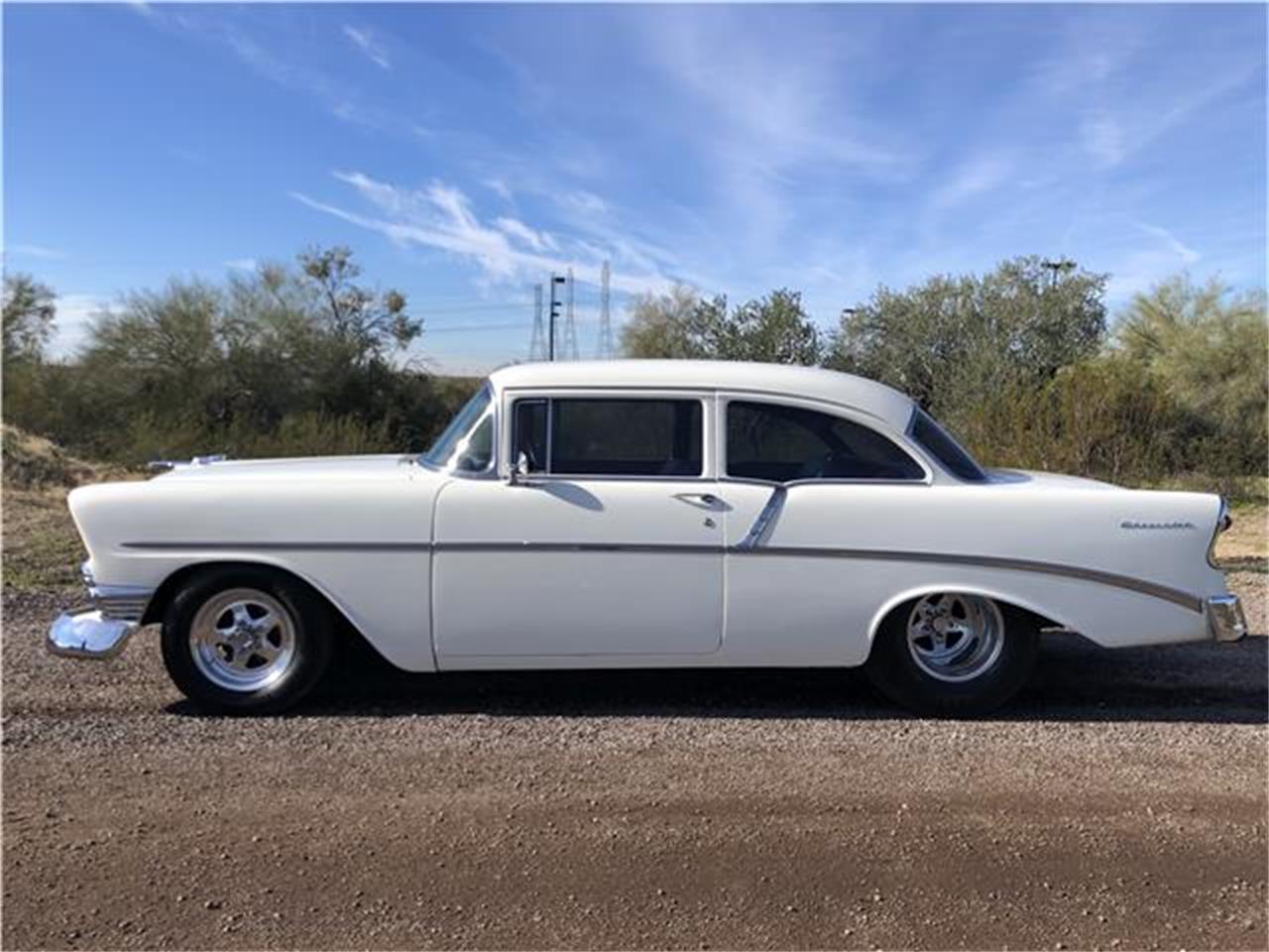 This 1956 Chevrolet 210 runs a built 396 big block engine, Edelbrock Performer Rpm intake manifold, and Edelbrock carburetor.