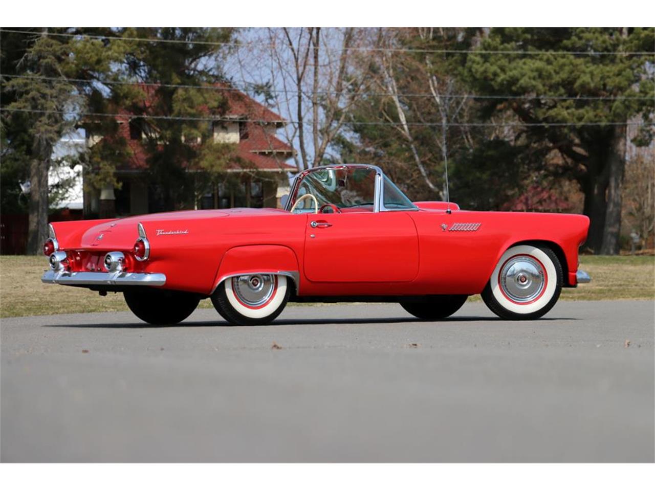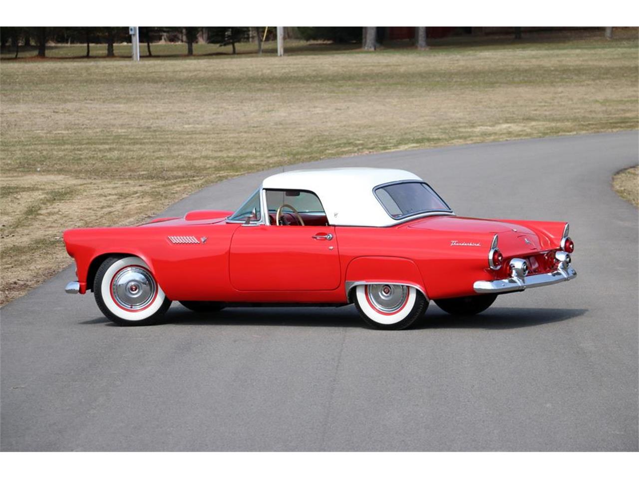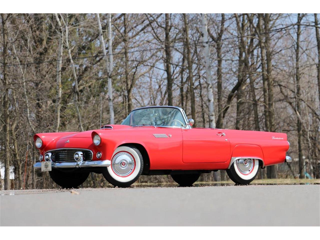 Beautiful Torch Red 1955 Ford Thunderbird. The 292 V8 engine, 4 barrel carburetor and 2 speed Automatic transmission were both rebuilt in early 2000s and only driven a few hundred miles. Fully converted to 12 volt electrical system. The interior is mostly brand new and is gorgeous. The white vinyl top is brand new along with a white hard top that is also in perfect condition. 15'' Goodyear Super Cushion White Wall tires go great with the Torch red paint. All the chrome is all in excellent to new condition as well. This is very well done and above average T-Bird that ruins and drives beautifully.