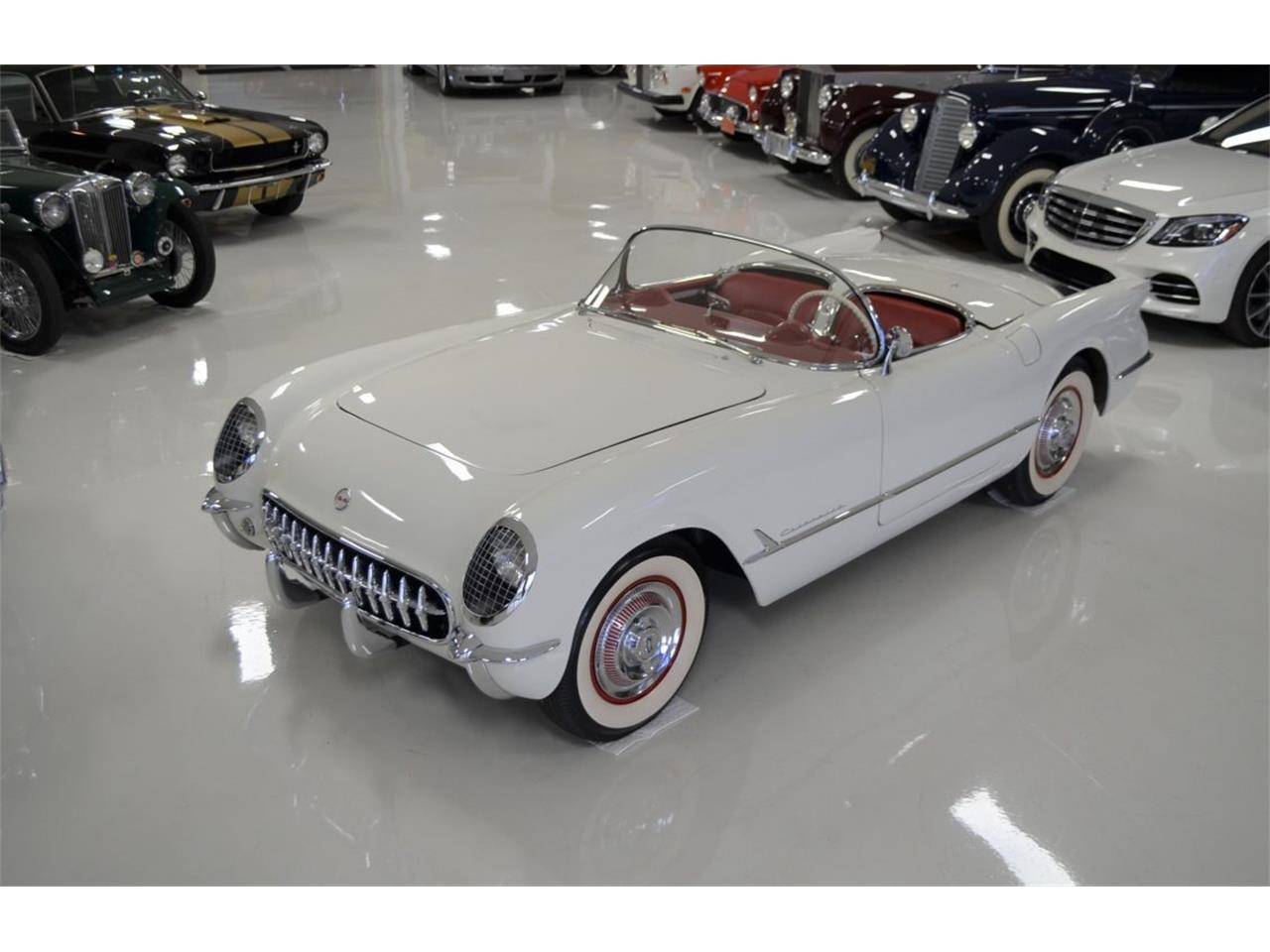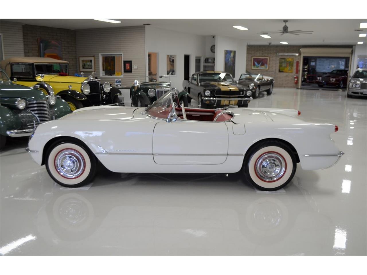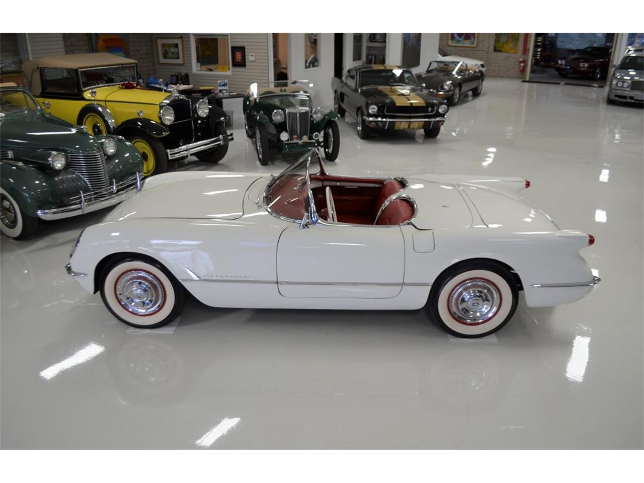 1953 Chevrolet Corvette. Cosmetically, No.087 is beautiful in its correct and nearly perfect livery of Polo White. The body finish has the correct fiber and seams showing throughout and it is as authentic as they come. The chrome is excellent and of top quality throughout. The Corvette has its correct bias ply tires, red painted wheels and the correct factory two-eared spinner hubcaps. The exterior quality of restoration is excellent in all regards. Both the panel fit and body finish is representative of the technology available to GM in 1953. The interior of No.087 is terrific and finished to concours standards. The interior and black convertible canvas top. The Sportsman Red vinyl interior is complimented with its correct two-tone white and red dashboard. The dashboard has gorgeous design cues, with ample chrome bezels surrounding the round gauges and tachometer and the V'd design for the speedometer and radio speakers. The red carpeting is beautifully fitted through the passenger compartment. It has its black canvas convertible top in its storage compartment. The engine compartment is also in excellent condition visually, with the beautifully detailed 235 CID "Blue Flame" straight six-cylinder engine and its triple Carter carburetors. GM's venerable two-speed Powerglide automatic transmission is used to supply the power to the rear wheels. The drivetrain is original from new.