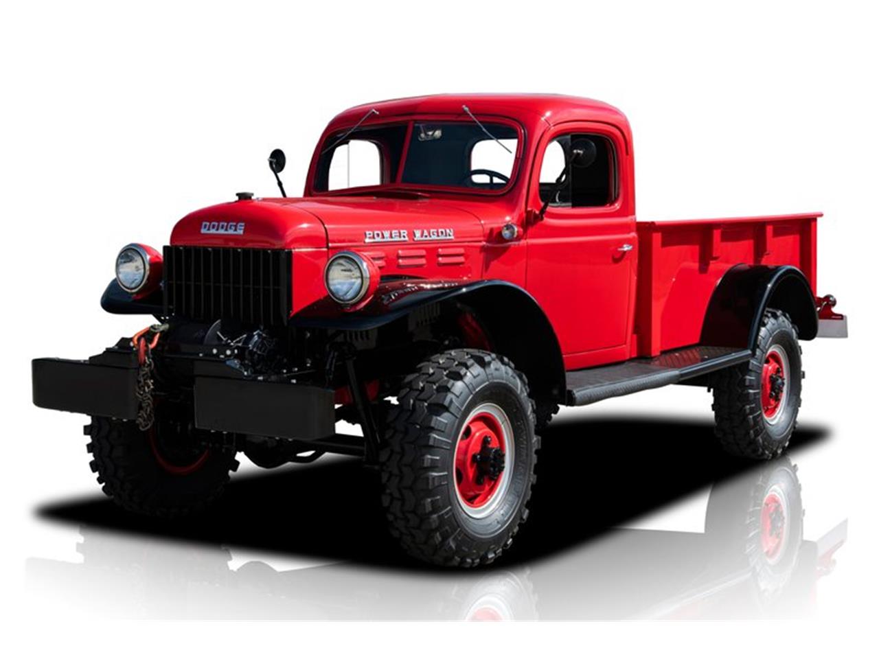 1952 Dodge Power Wagon. Fold the hood and you'll find 230 cubic inches of correct Chrysler T137 6-cylinder. At the top of that color-keyed mill, an oiled air cleaner feeds oxygen into a small Carter carburetor, which is seated on a web of cast manifolds. At the side of those manifolds, a factory cylinder head is wired to a traditional points distributor via 7mm Copper Cables. Cooling comes courtesy of a tall radiator, which frames a traditional pulley fan and an old school Chrysler generator. And the truck's simplistic engine compartment is clean and very well done, rounding out an otherwise impressive build. Power meets the pavement through a reliable 4-speed transmission, which rides between sturdy Chrysler axles. That drivetrain rolls on a factory frame, which stretches Gloss Black paint over heavy duty springs and shocks. Naturally, that frame is guided by manual steering, and stopped by manual drum brakes. Exhaust flows through aluminized pipes and a fresh muffler. And at the corners of the floor, painted Split-Rim Wheels twist Q78-16LT Interco Super Swampers. When you pop this pickup's doors, you'll find a crisp vinyl cockpit that's full of utilitarian charm. A wide bench seat complements small door panels, contoured cab panels and a tight headliner that frames one sun visor. A body-matched dash hangs tasteful stainless around a full suite of AutoMeter telemetry. The driver feels the terrain through a large steering wheel, a long shifter for the 4-speed and short sticks for the truck's 4-wheel drive. And purposeful yet stylistic touches include polished door handles, polished window cranks, a polished cowl pull and a retro VSM 900 turn signal switch.