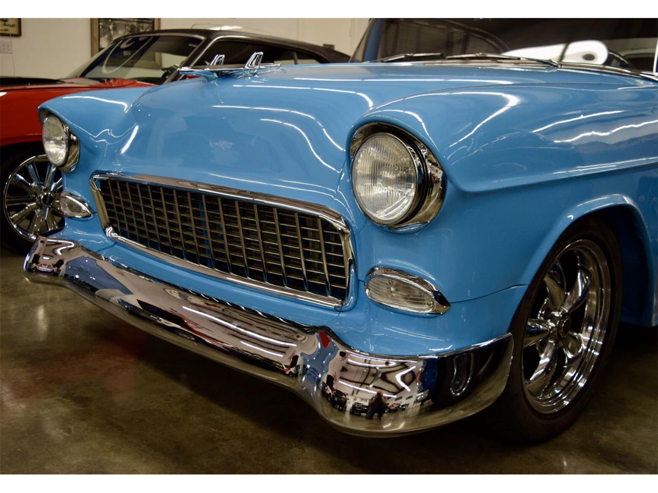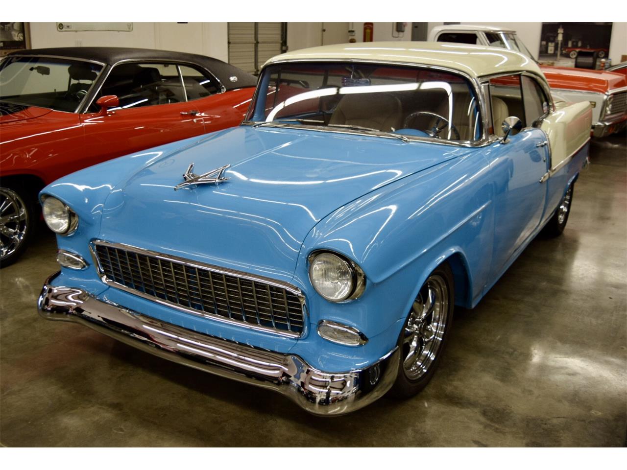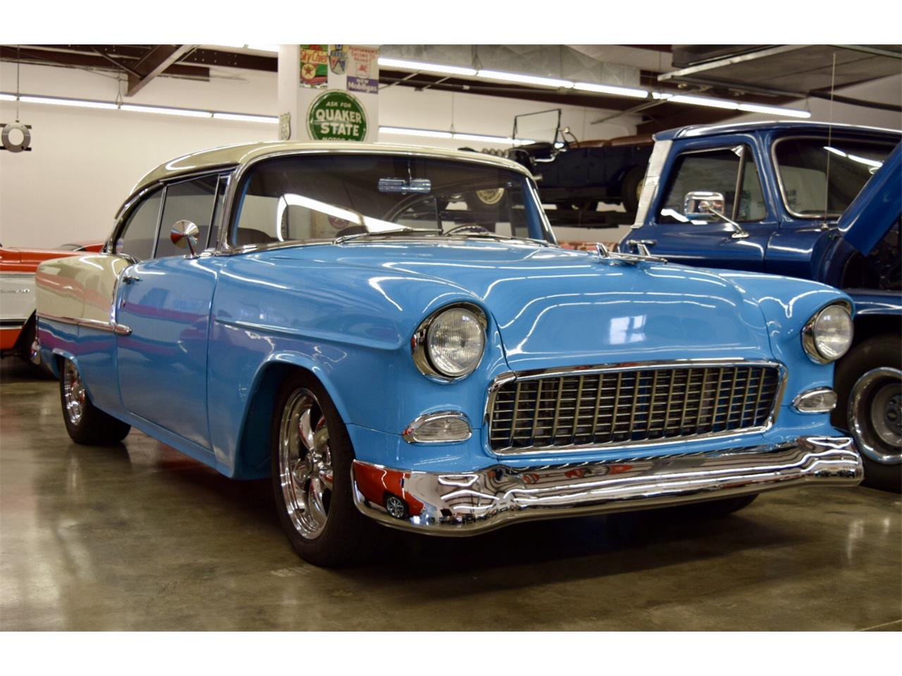 1955 Chevrolet 210 Custom 2 Door Hardtop. Features such as modern suspension, steering, 4-wheel disc brakes, and Vintage Air A/C. Under the hood is finished to show quality and there is no shortage of power. A brand new Chevrolet Performance crate 350 with dual quad carburetors was installed cranking out an impressive 425 hp. Under the hood The engine was mated to a brand new 700r4 transmission with Currie rear end. An all new custom tan interior with buckets seats, center console, and stereo system finish off the interior nicely.