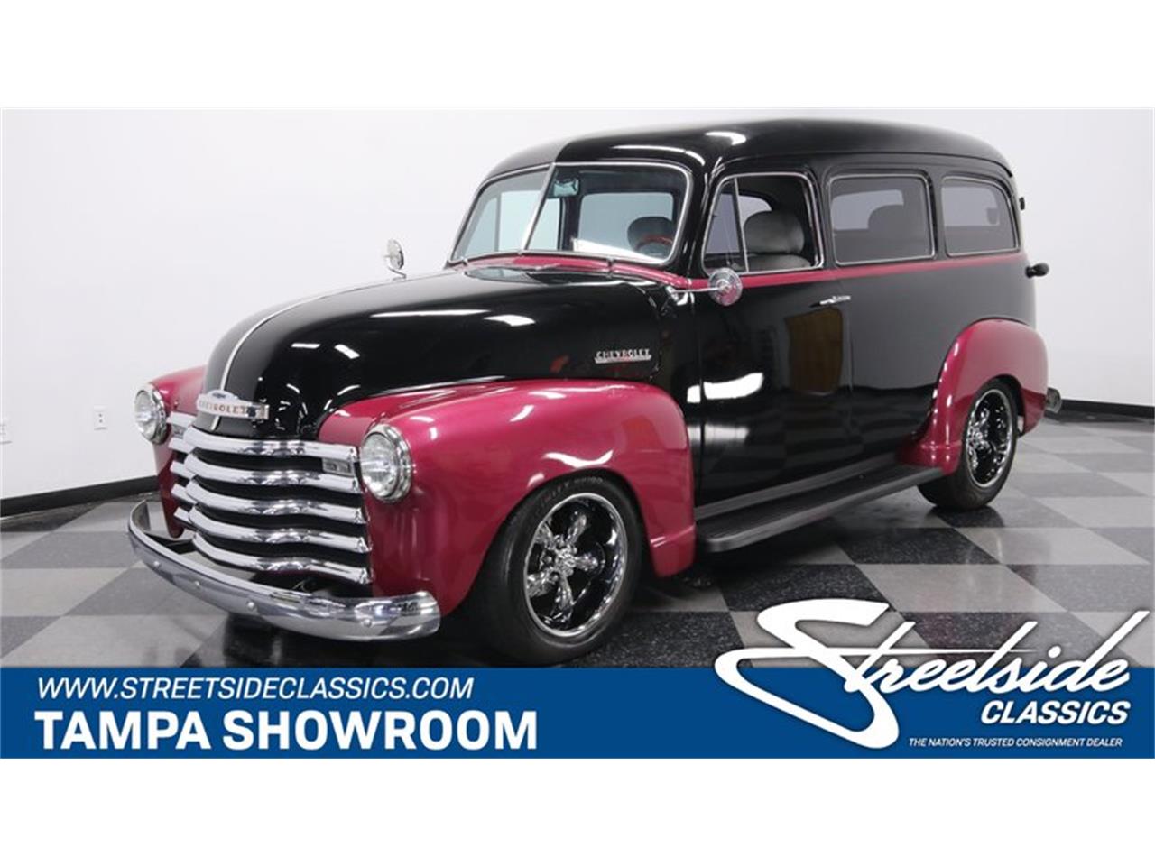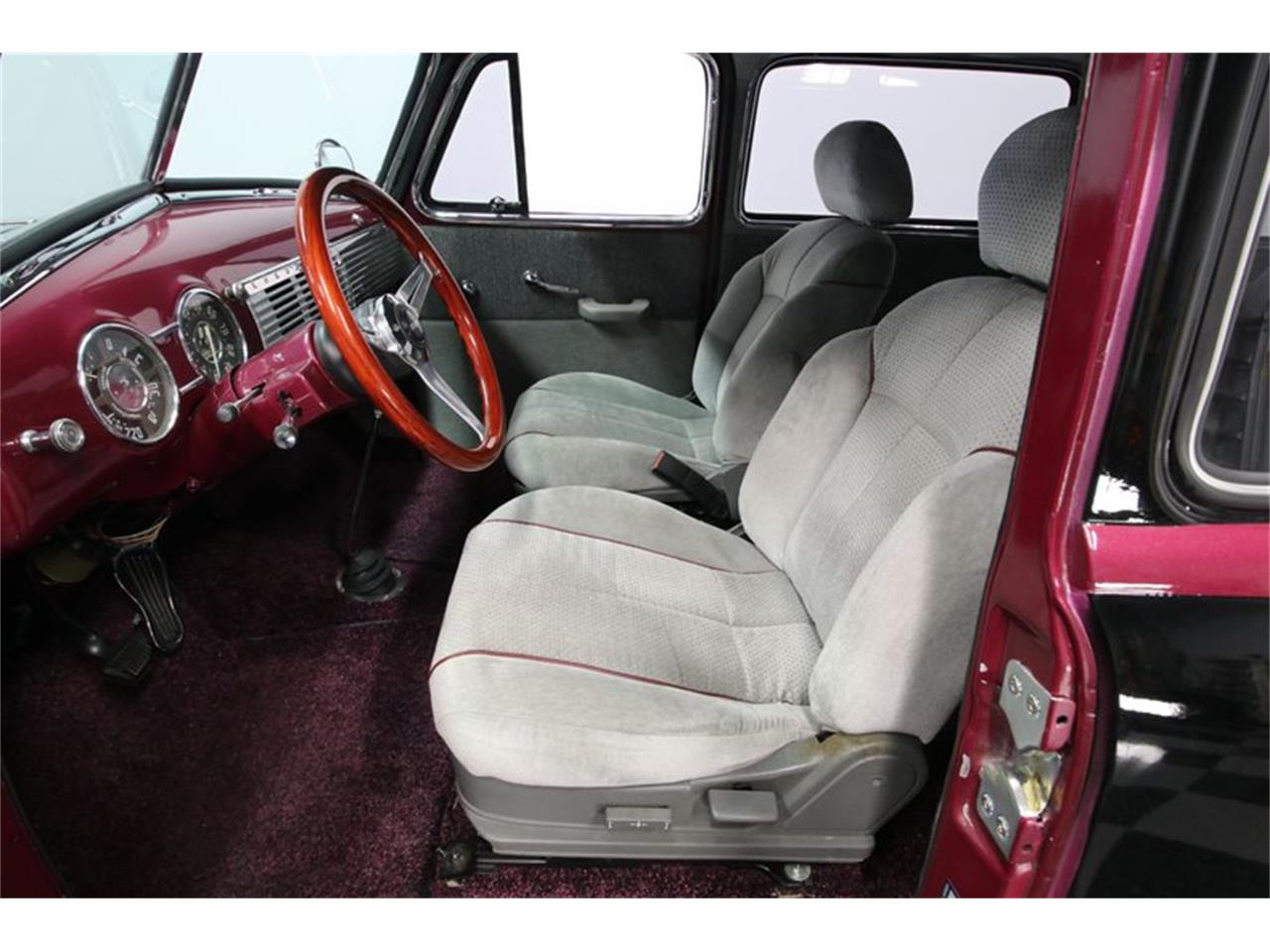 This 1951 Chevrolet 3100 1/2 Ton Suburban Carryall has been upgraded with a two-tone look, V8 power, overdrive transmission, and an all bucket seat interior.