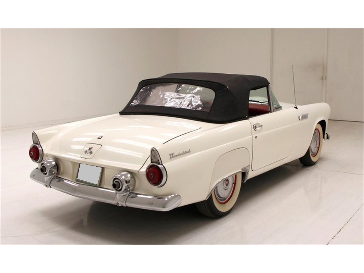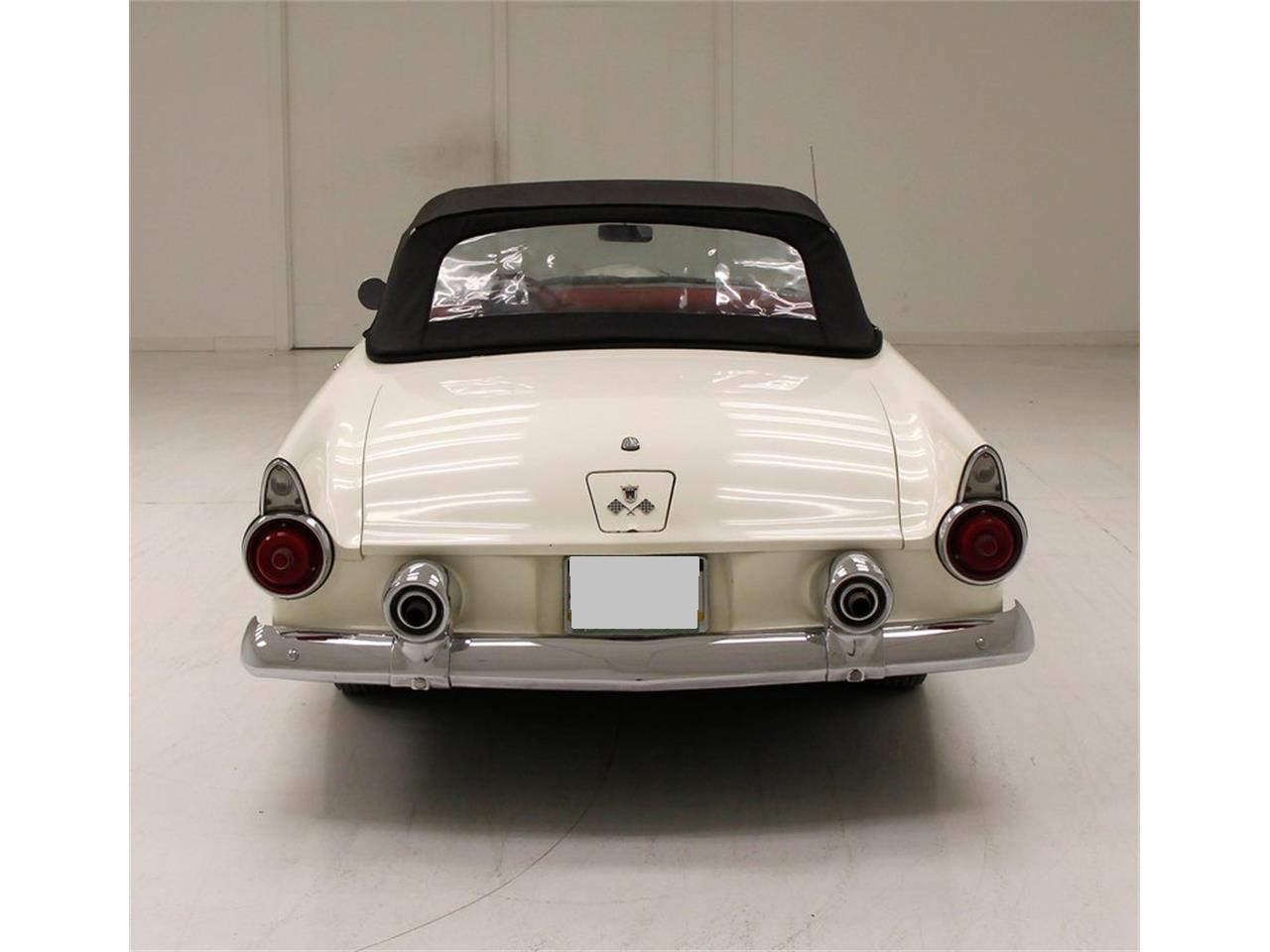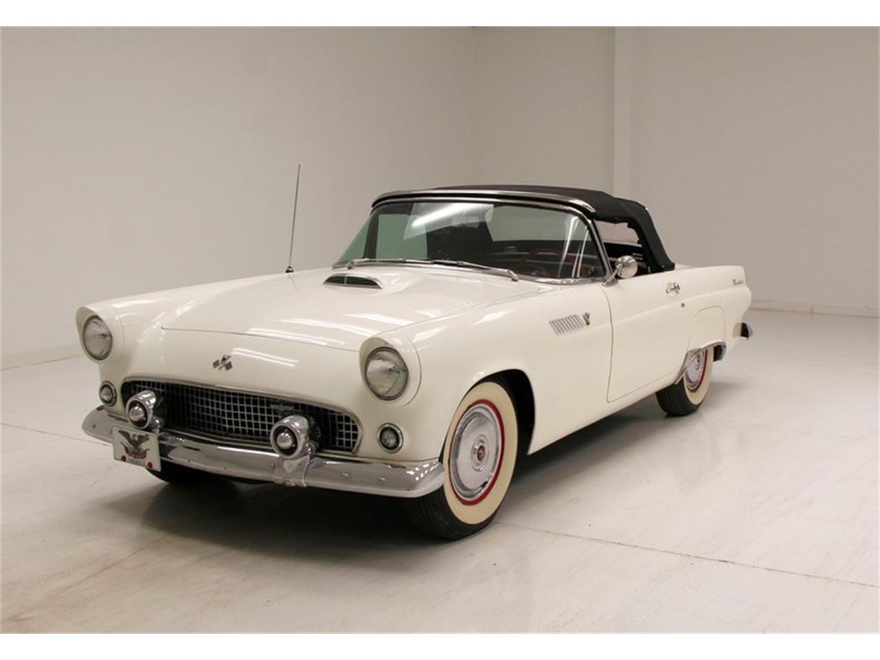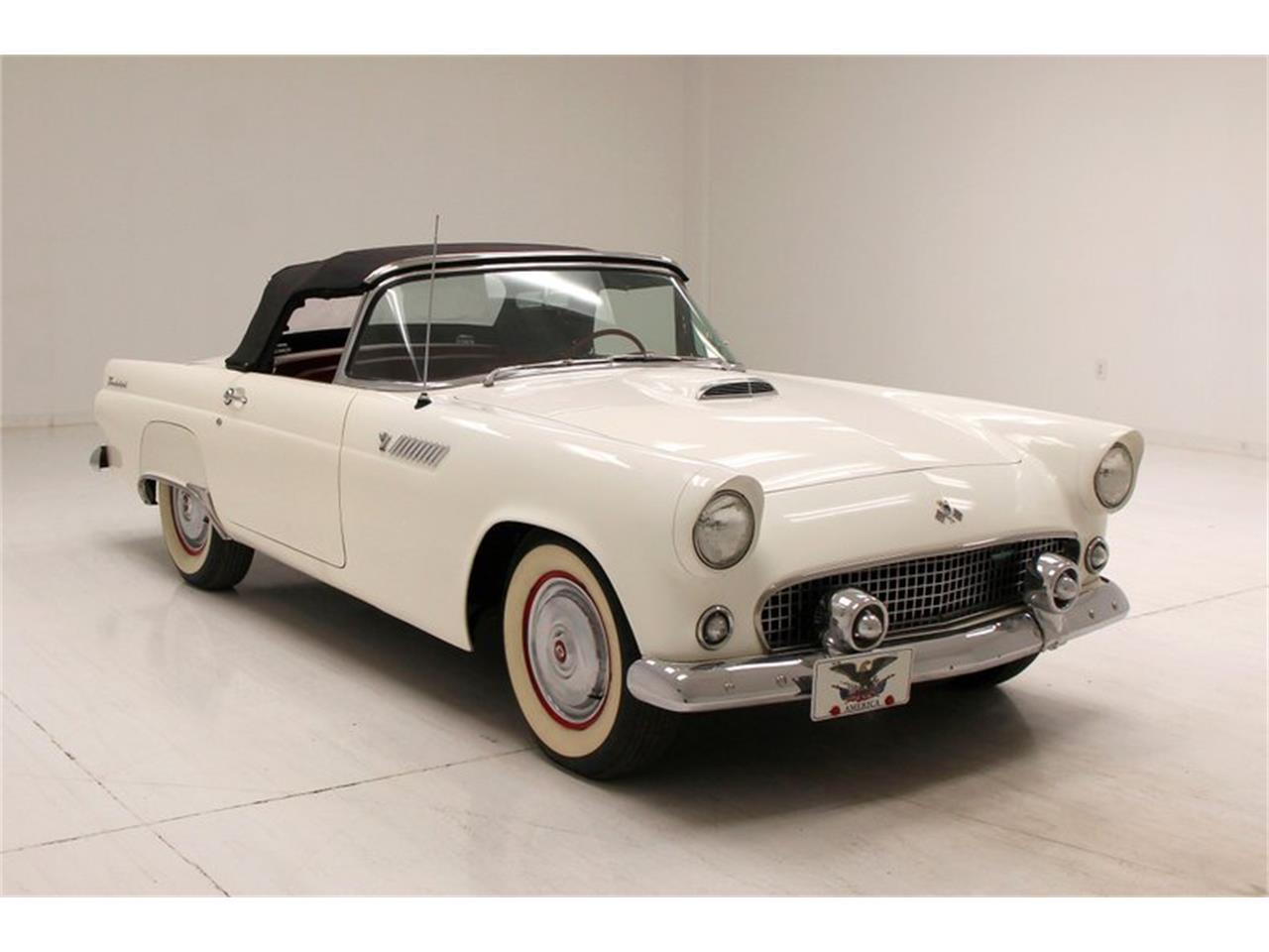 1955 Ford Thunderbird Convertible. 292ci V8 engine clean and shiny engine bay. It is topped with a 4-barrel carburetor, and a chromed air cleaner cover. 3-speed manual transmission, and a 3.73 rear axle complete the drivetrain.