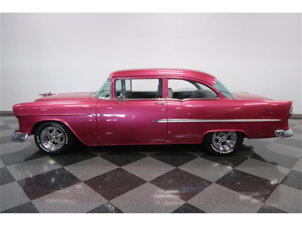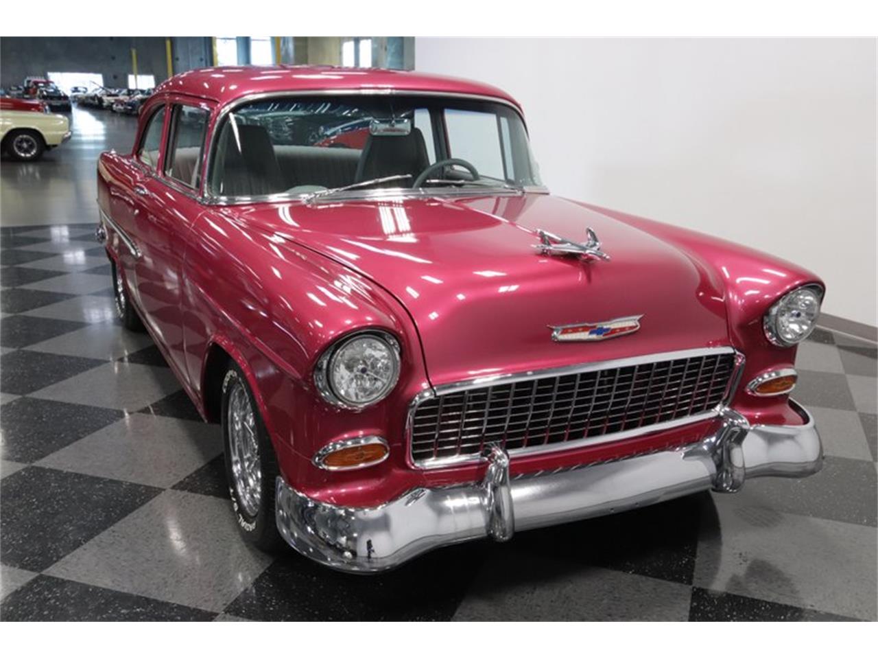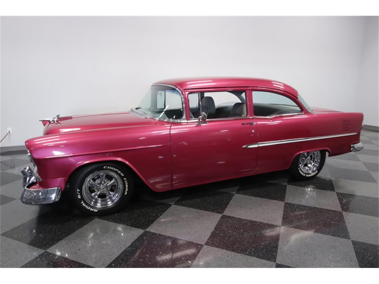 This 1955 Chevrolet 210 has the instant bold appeal of a street machine, but you'll love this for more than just the paint. Style package is quite nice, you'll also really love the substance within. It's a 350 cubic-inch crate V8 with a Carter four-barrel carburetor, aluminum intake, and shorty headers feeding the dual exhaust. This has all the right supporting components, too, like upgraded pulleys w/serpentine belt, MSD ignition, and an aluminum radiator w/electric fans. And so if this is starting to sound like a thoughtful total package, then you'll also like the easy driving features, like power steering, four-wheel power disc brakes, and a 700R4 four-speed automatic transmission with highway-friendly overdrive.