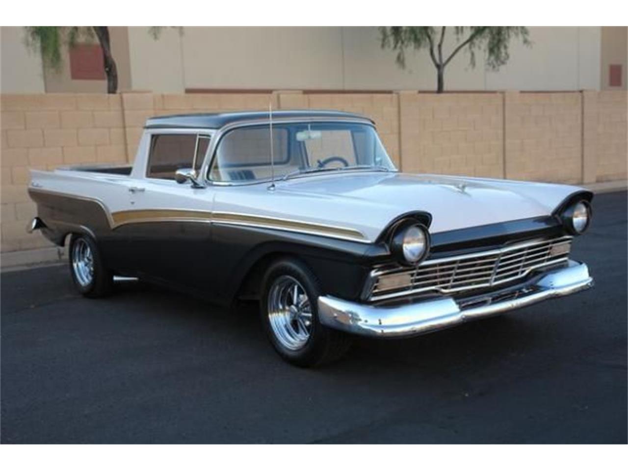 This 1957 Ford Ranchero is in stunning two tone pearl white over grey paint.