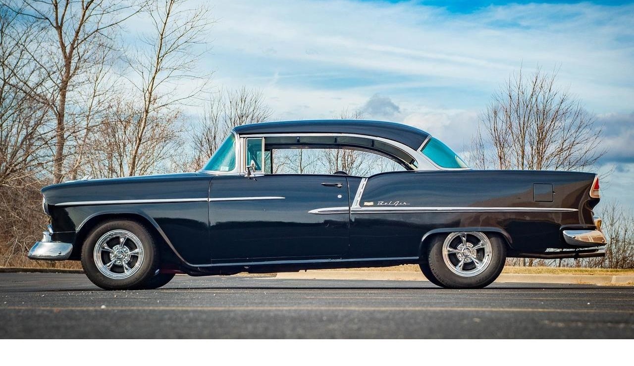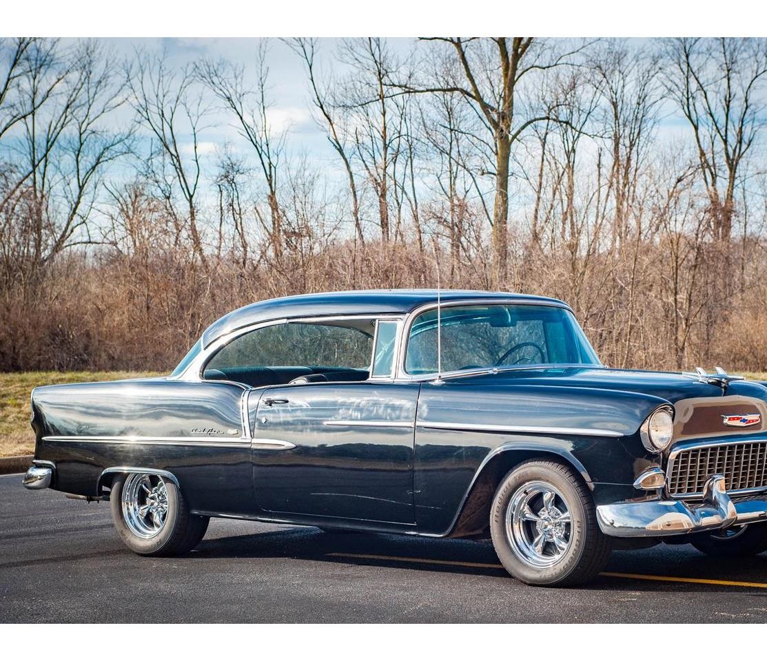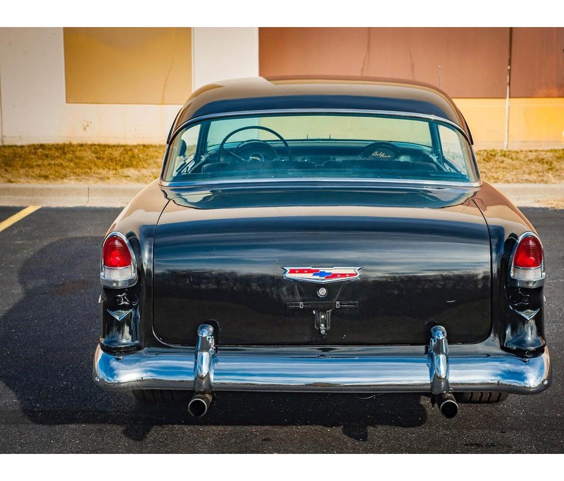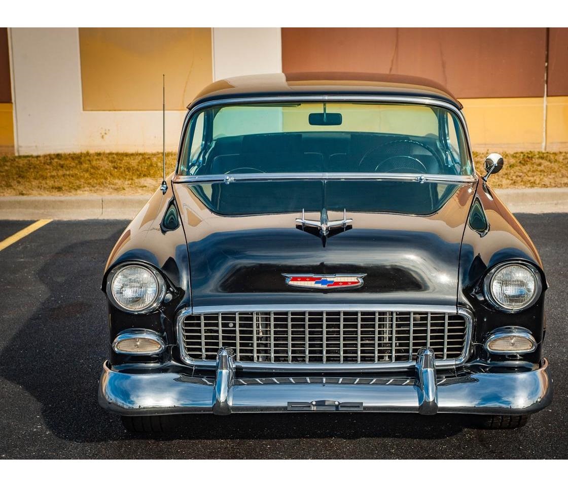 1955 Chevrolet Bel Air for sale. The engine is a 383 stroker that sounds amazing and makes plenty of power to get this thing moving down the road. Muncie 4 speed manual transmission and a posi 373 gearset in the rear. Luxurious black interior with Air Conditioning. Black on black is one hell of a color combination for the 55 Chevys and this one looks tough!