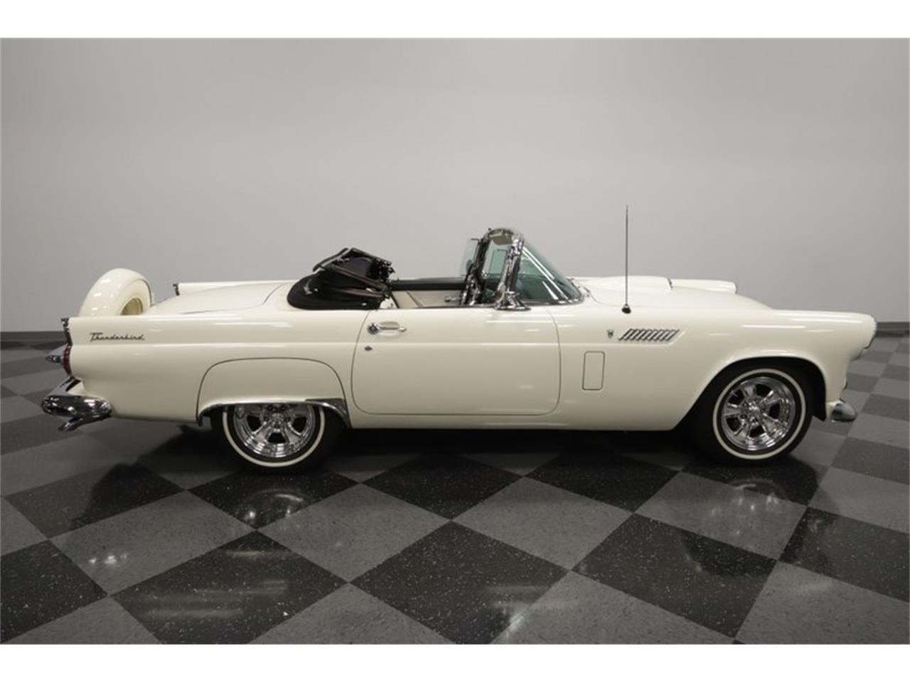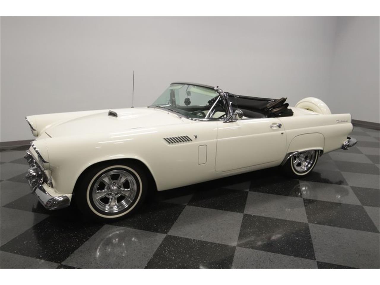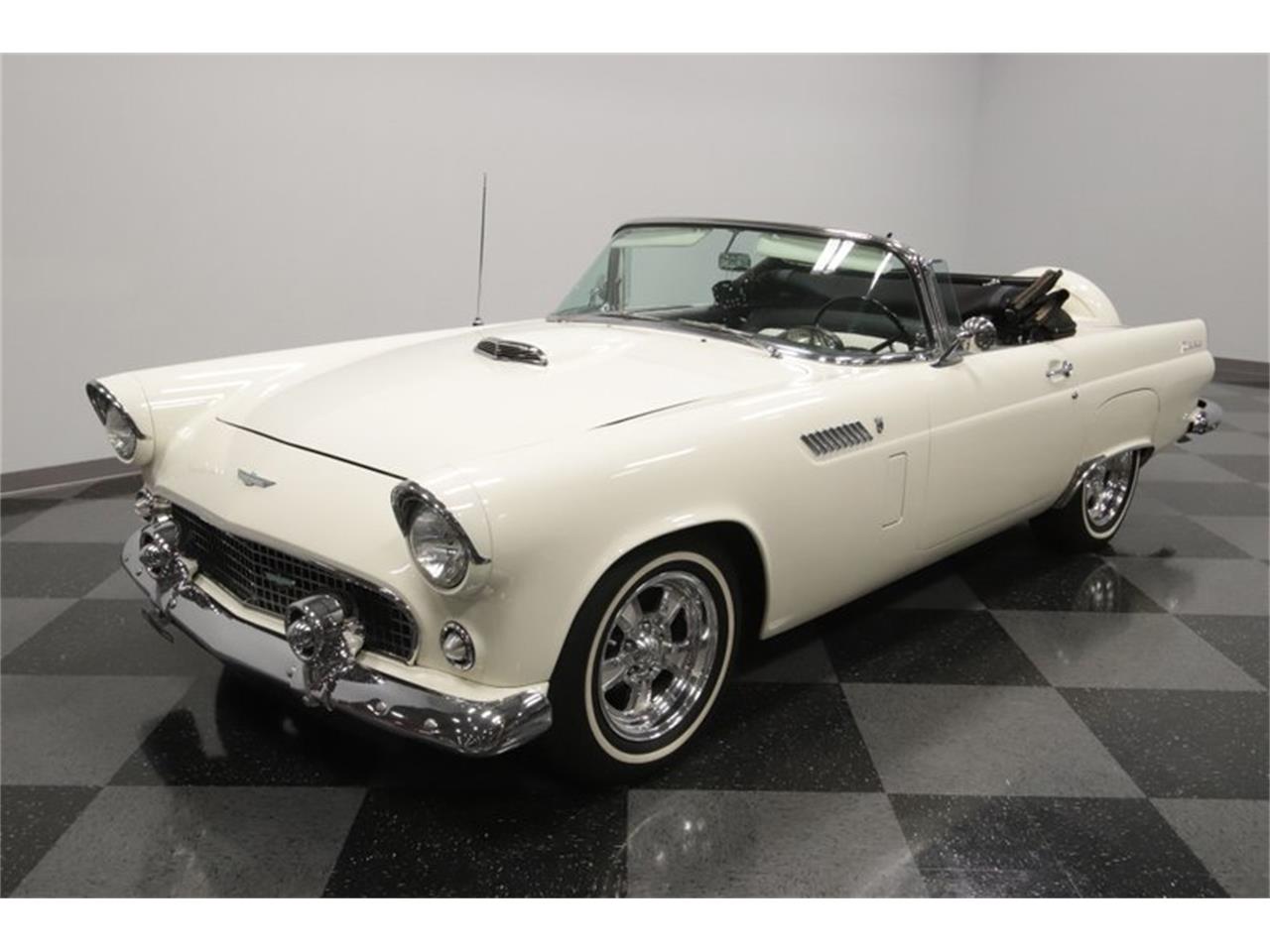 1956 Ford Thunderbird - 312 cubic-inch V8 - three-speed automatic transmission, power steering, and power brakes w/discs up front. If you like the color combo of the roof and the exterior paint, then you're going to love the interior. That's because this has the factory-correct black and white two-tone inside. And just like the exterior, they invested in quality to keep it looking its best. You'll love all the vintage touches, like the artful steering wheel and the AM radio in the dash. And as a true luxury cruiser, you also have some rare features for the '50s like power windows and a power seat. Plus, the T-bird was meant for driving. That's why you have a cool machine-turned dash panel, a large speedo flanked by a working tach and clock, and there are even auxiliary readouts cleanly installed under the dash.