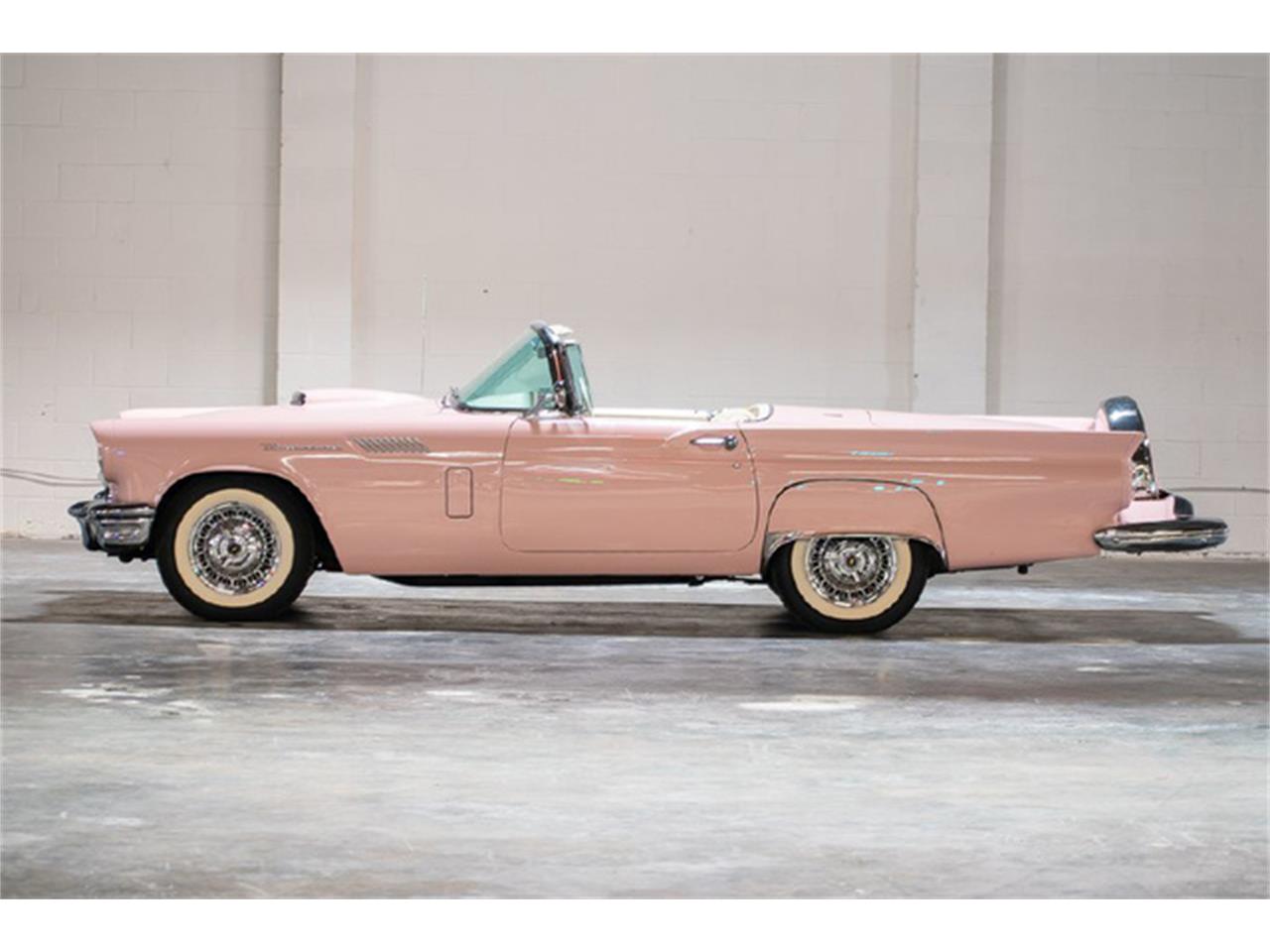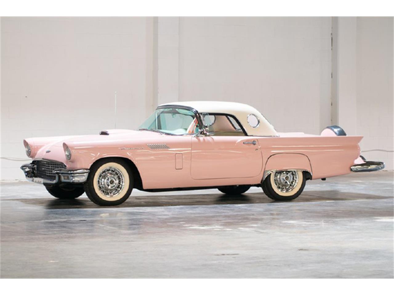 1957 FORD THUNDERBIRD. DUSK ROSE EXTERIOR WITH WHITE INTERIOR. POWERED BY A 312 CID ''THUNDERBIRD SPECIAL'' OHV V8 WITH 245 HP AND A 4 BARREL CARBURETOR MEANT THIS BABY BIRD RUNS AND DRIVES WITH NO PROBLEM. IT WILL CERTAINLY GET OUT OF ITS OWN WAY, WITH NO PROBLEM. THE ''FORD-O-MATIC'' AUTOMATIC TRANSMISSION AND OPTIONS LIKE POWER SEAT, POWER WINDOWS, POWER BRAKES, ENGINE DRESS KIT, AND KELSEY HAYES-TYPE WHEELS MEANS THIS IS A REAL HEAD TURNER. ADDED TO THE ALREADY STUNNING LOOKS, IS A FACTORY CONTINENTAL KIT WITH SPARE TIRE.