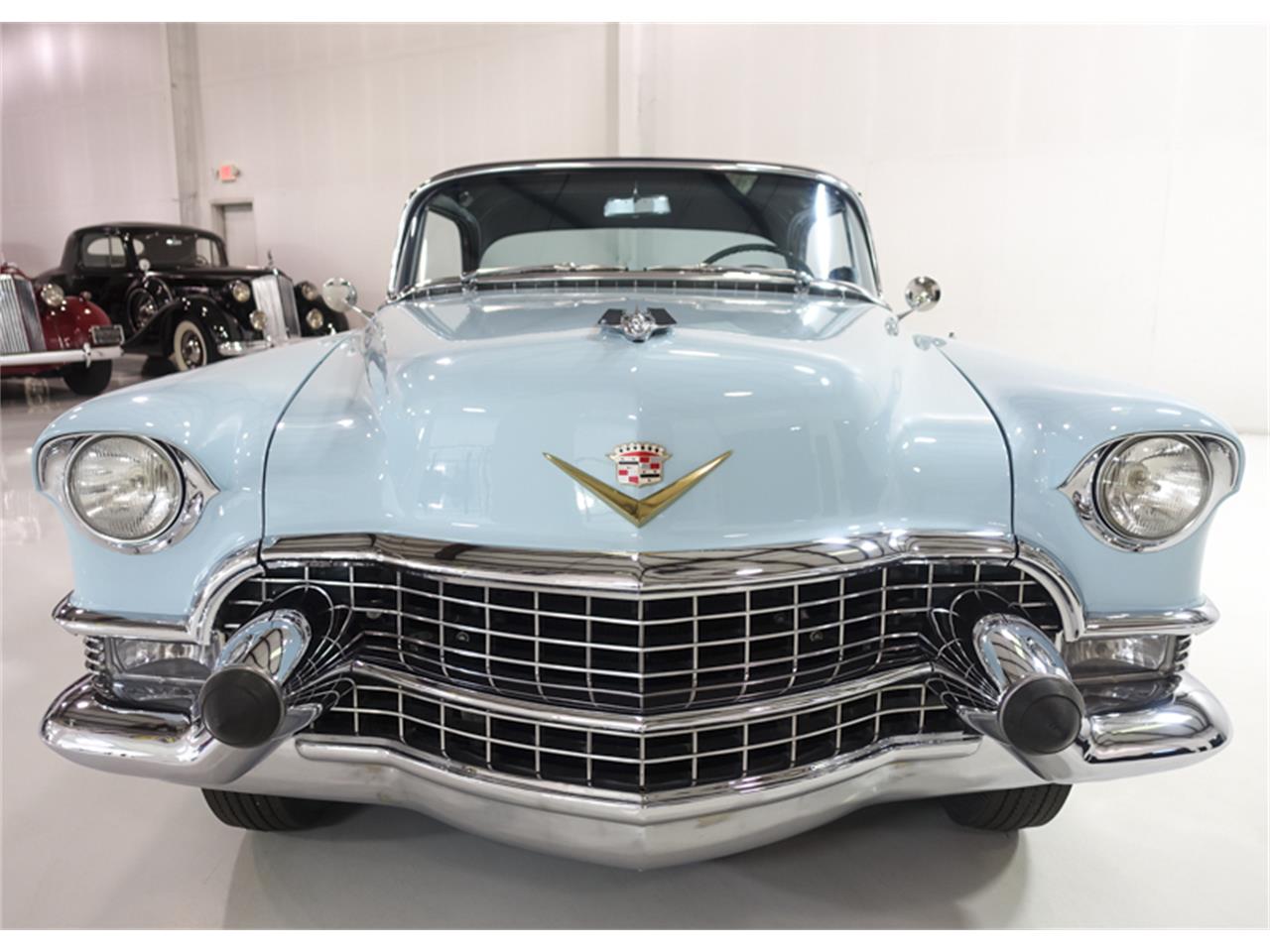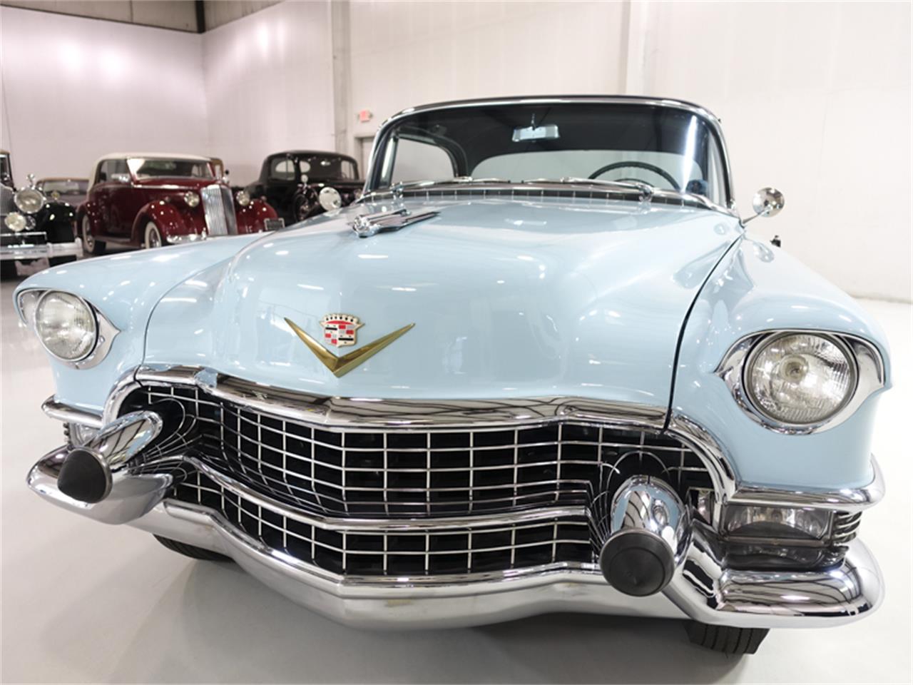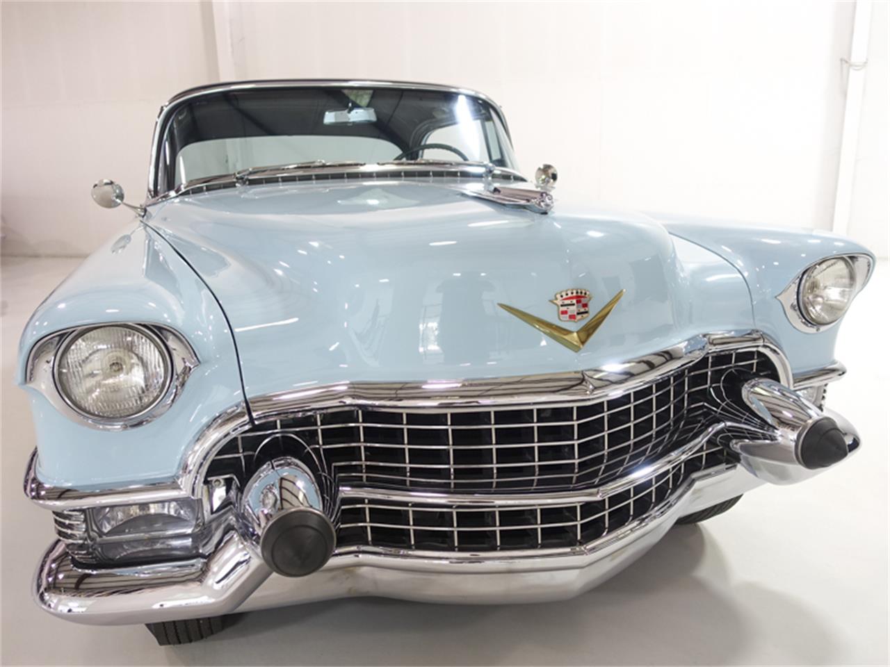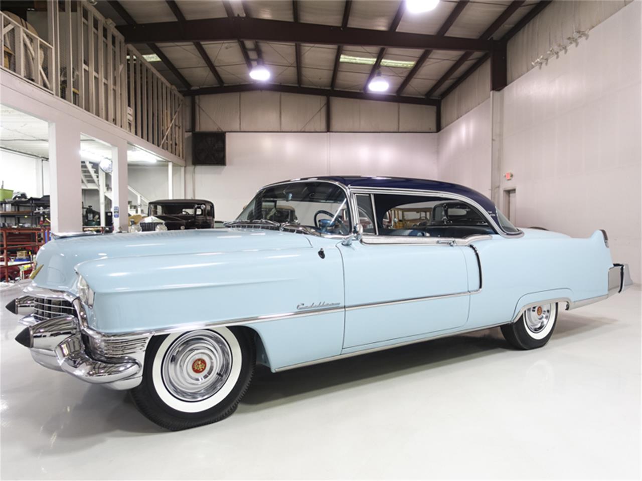 The 1955 Cadillac Coupe deVille featured here is finished in the stunning factory color combination of Cobalt Blue Metallic over Ruskin Blue with a matching light blue cloth and leather interior.