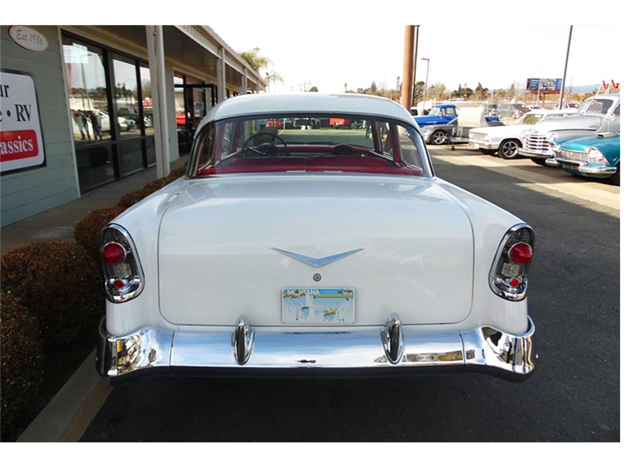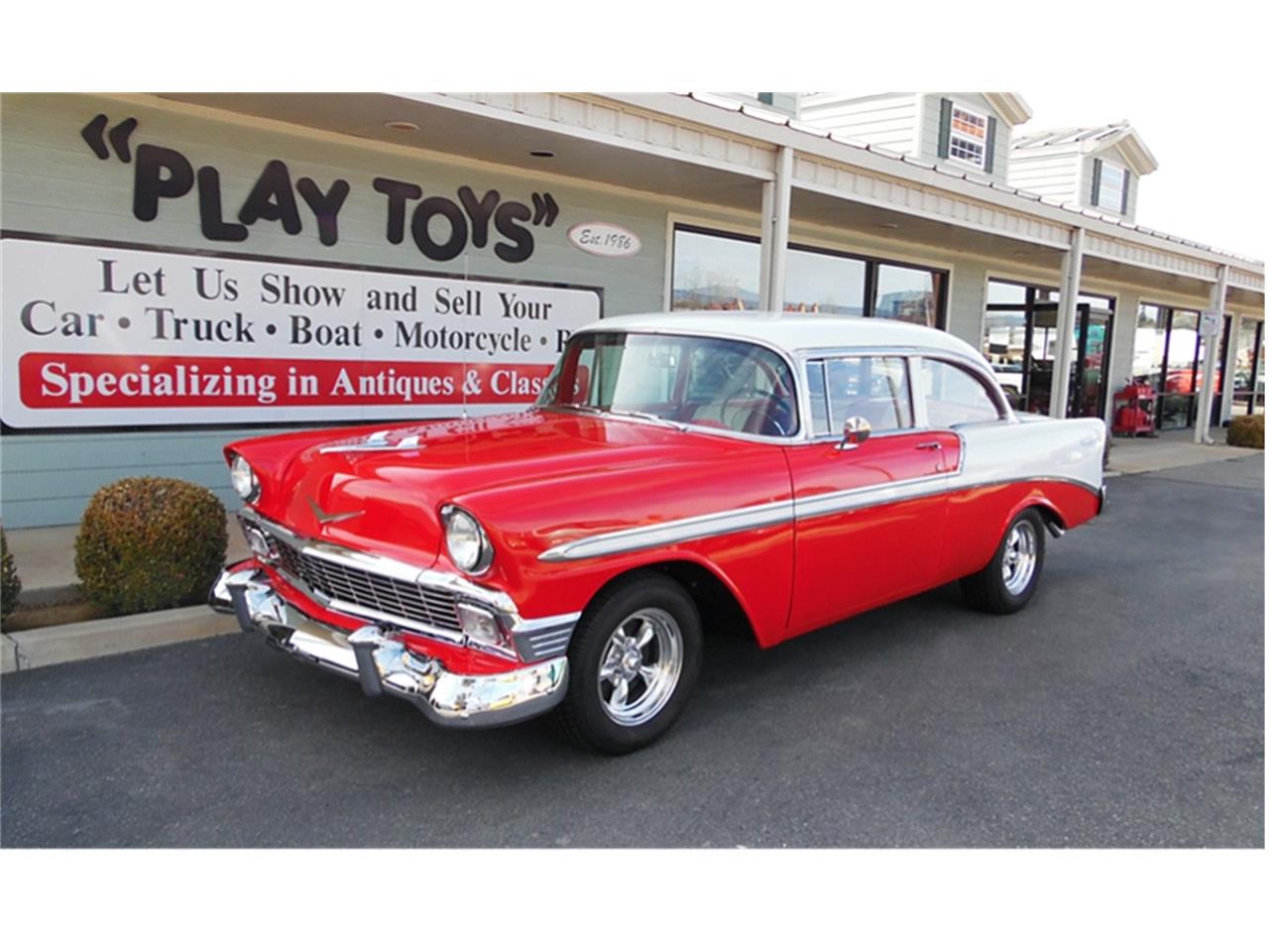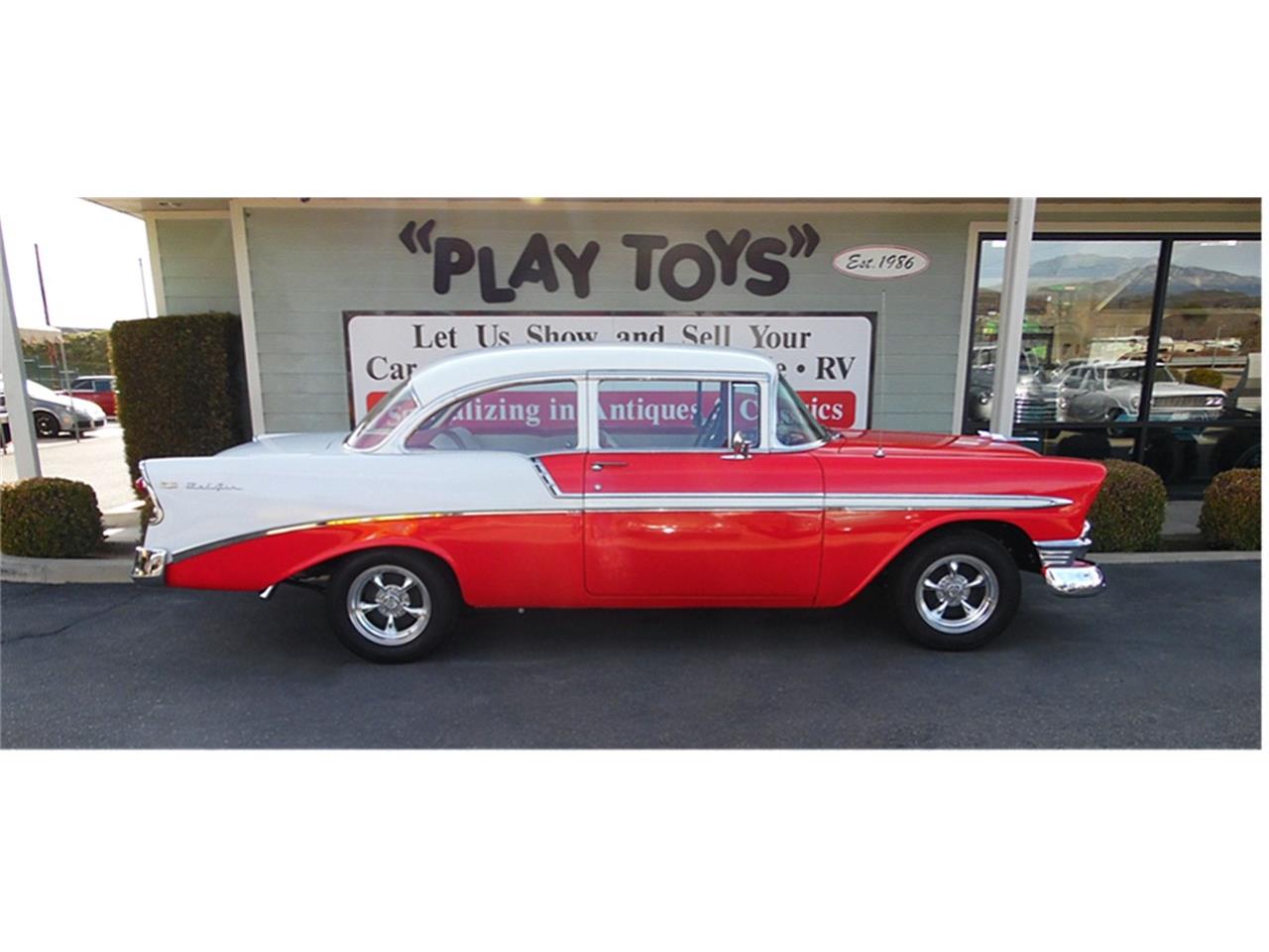 This 1956 Chevrolet Belair 2 Door has had a Frame On Restoration and comes equipped with a 400 V8 (replaced 2018), Automatic Transmission (rebuilt 2018), Mild Cam, New Radiator and Fan, New Master Cylinder, New Drum Brakes, New B&M Floor Shifter, Replaced Dash Gauge Cluster, Sun Pro Gauges, Bench Seat with Seatbelts, Custom Red/White Interior, Newer Vinyl Upholstery and Carpet, Rebuilt Front Suspension, 15" Chrome American Racing Wheels with Cooper Cobra GT Tires - P235/60R15, Dual Flowmaster Exhaust, and New Windshield.