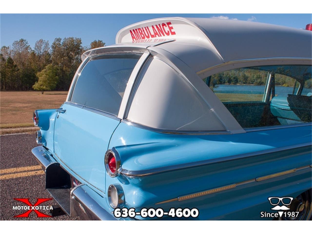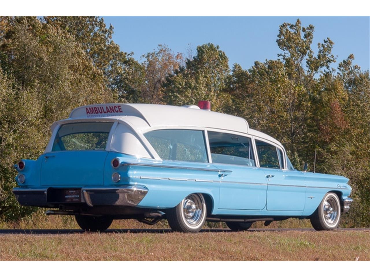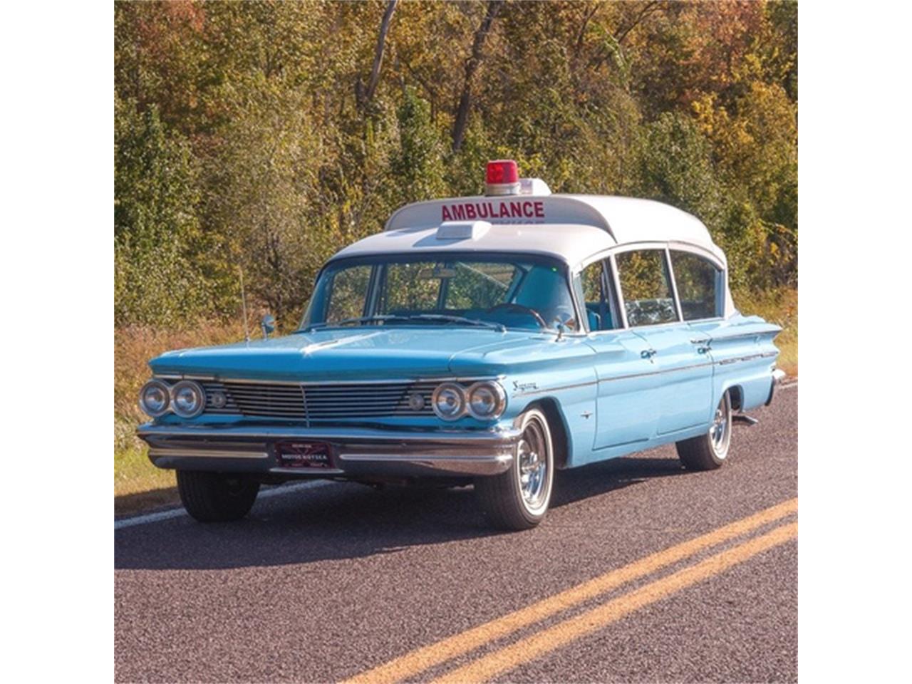 1960 Pontiac Bonneville Superior Custom Ambulance ? Pontiac ?Rescuer? model ambulance from the Superior Coach Company #2307-G ? 1979 Chevy 454 CID V-8 engine ?Turbo Hydramatic 400 three-speed automatic transmission ?White over Skymist Blue exterior, very nice straight body with a quality paint job ?Blue cloth-vinyl interior ?Vintage air-conditioning, power steering, power brakes with front discs and a new, four-core aluminum radiator ?All suspension parts have been replaced ?New parts rear brake drums and shoes, brake cylinders, front disc brakes, master cylinder, brake diaphragm, fuel pump, fuel line, carburetor and air cleaner ?Functional red swivel light on roof and Chevrolet rally wheels with Toyo double whitewall tires ? Retro Sound Zuma AM/FM stereo with USB, MP3 and WMA Haven?t you ever wanted your own Pontiac Superior Coachwork built ambulance with a 454 big block motor? While it is not exactly the Ectomobile from the ?Ghostbusters? film, this is still one clean and cool custom medical transporter and it?s here, at MotoeXotica Classic Cars.