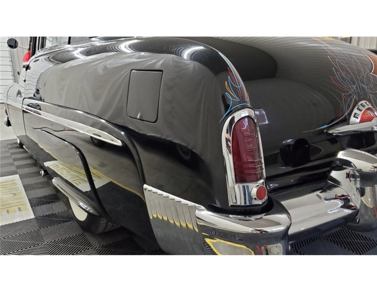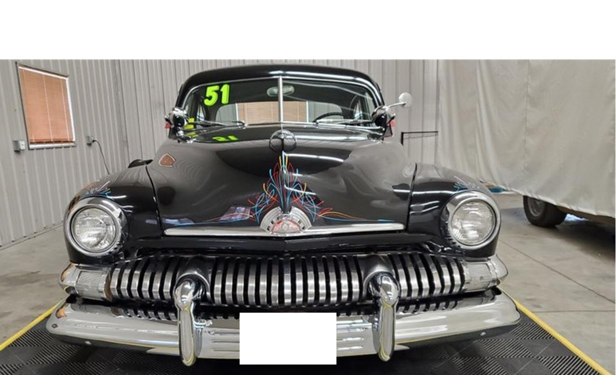 1951 Mercury Eight Coupe finished in gloss black with pinstriping highlights.