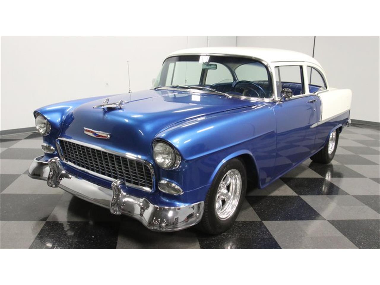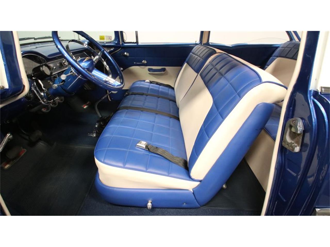 1955 Chevrolet 210 Big 400 cubic-inch V8 power, four-on-the-floor, and a comfy A/C interior make this instantly attractive. Plus, it has been upgraded further with performance components like an Edelbrock 650 CFM four-barrel carburetor, Weiand intake, and ceramic-coated heads feeding an H-pipe dual exhaust. FGour-speed manual transmission. Plus, power steering and power brakes w/discs up front deliver an all-around great driving package. The blue and white theme from the exterior is continued on the seats. These have the classic Del Ray pattern, but the plushness and freshness let you know it's a far more recent investment. This coordinates with the door panels, capering, headliner, and dash to create a terrific uniform feeling inside and out. Upgraded retro-style AM/FM/cassette stereo and cold-blowing R134a air conditioning.