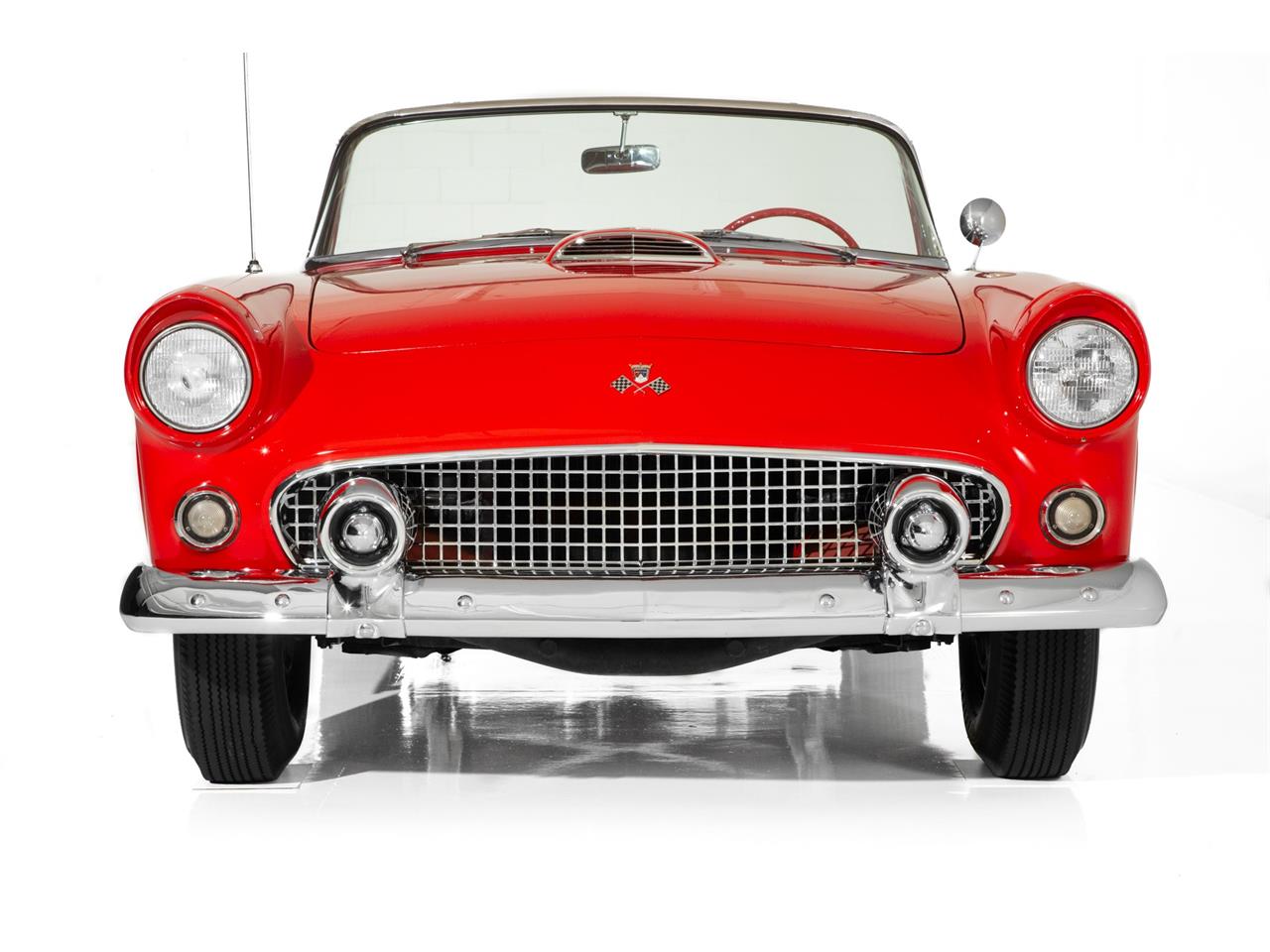 Red 1955 Ford Thunderbird convertible with V8 power and automatic transmission. The paint is smooth with a deep glossy finish and covers a super solid body with very good metal structure. The convertible top is great and bright white. 292 V8 engine Correct chrome air cleaner Finned aluminum Thunderbird valve covers Automatic transmission Stock rearend with highway gear.