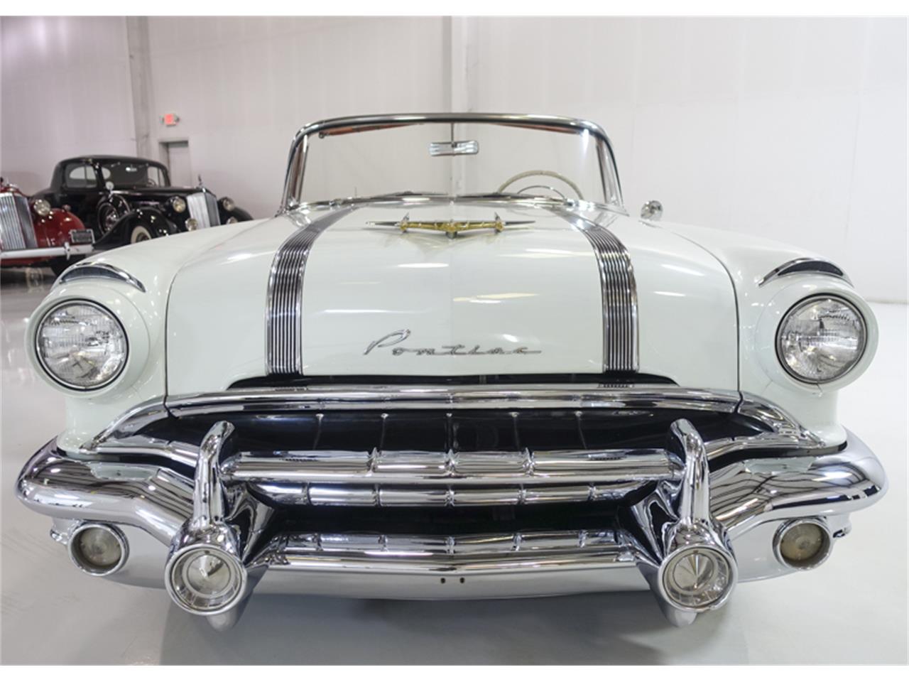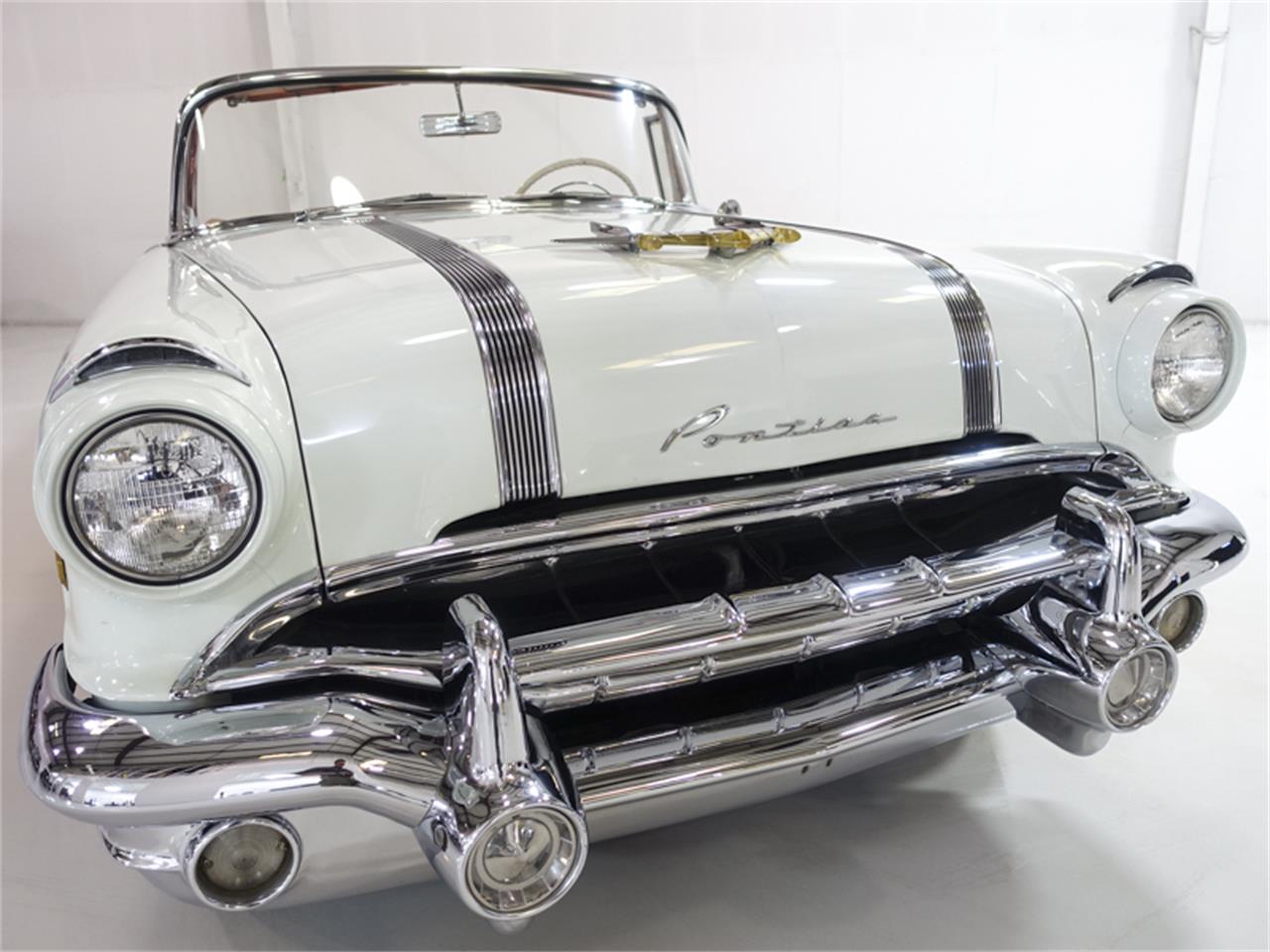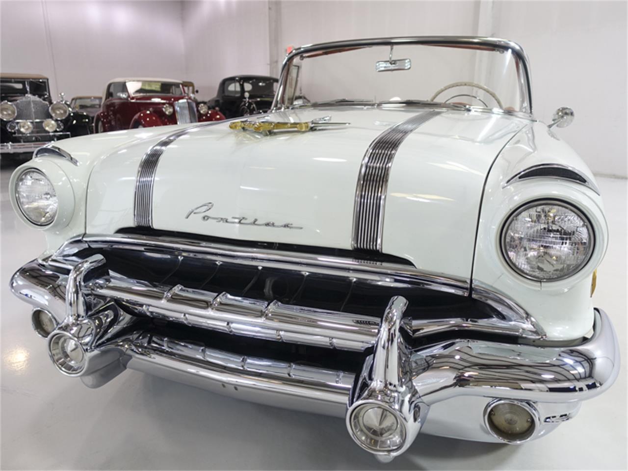 The stunning 1956 Pontiac Star Chief Convertible featured here is finished in the stunning color combination of Polo White over Bolero Red with a matching ivory and red interior and white power folding convertible top.