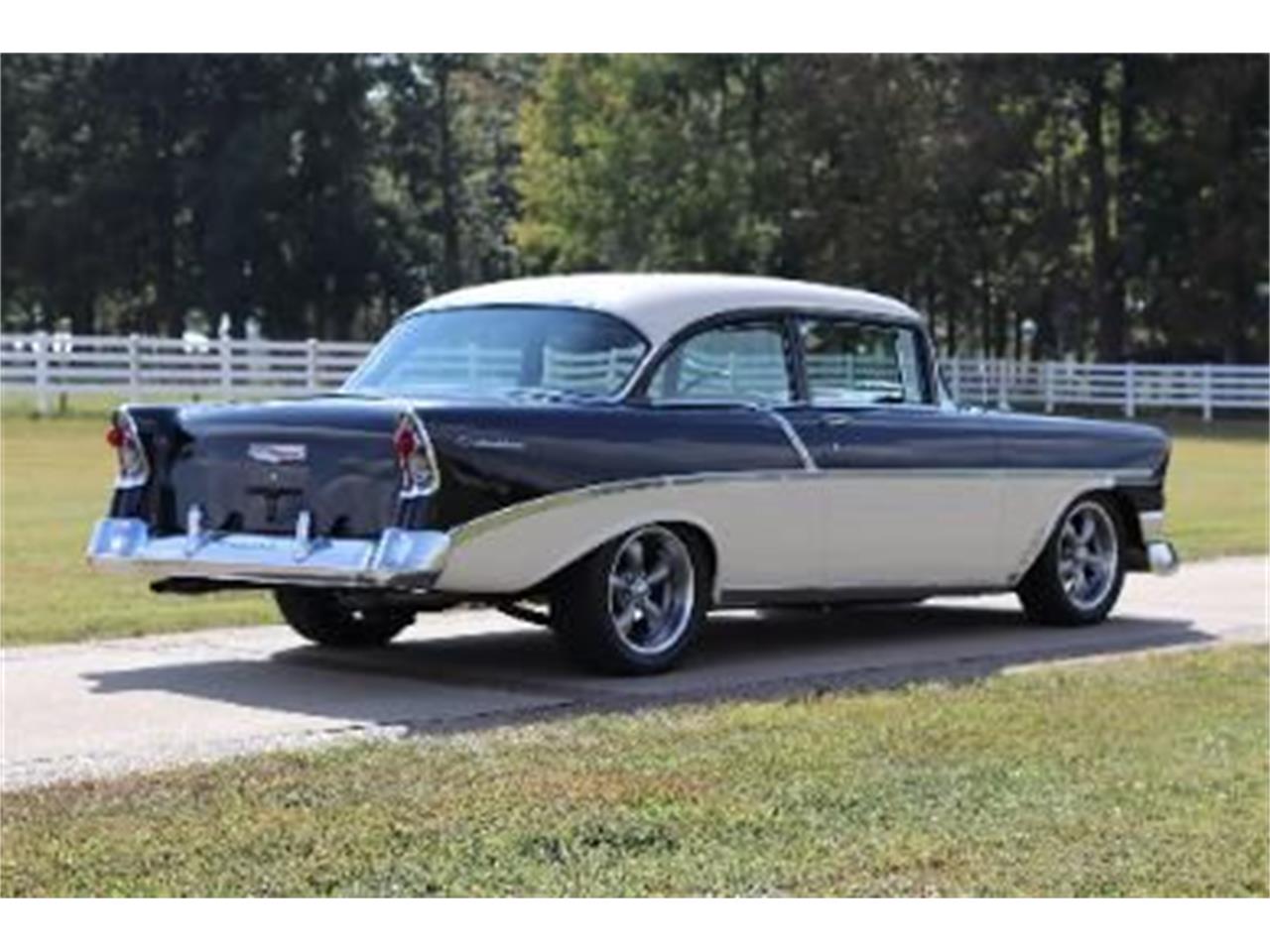 This 1956 Chevrolet 210 2 door sedan with 28,421 miles. The interior is Black and White and the exterior is Onyx Black over India Ivory. 350 with Edelbrock intake & carburetor, HEI distributer, 350 Turbo automatic Transmission, 10-bolt rear with 3.08 gear, headers with dual exhaust, chrome steering column with tilt, GM comfort grip wheel, rocker panel trim with front fender rock guards, aluminum radiator, 605 power steering box, 4 wheel disc brakes, electric wipers, am/fm cassette player, air conditioning, heat, 17' Allow wheels, new tires, front and rear bumper guards.
