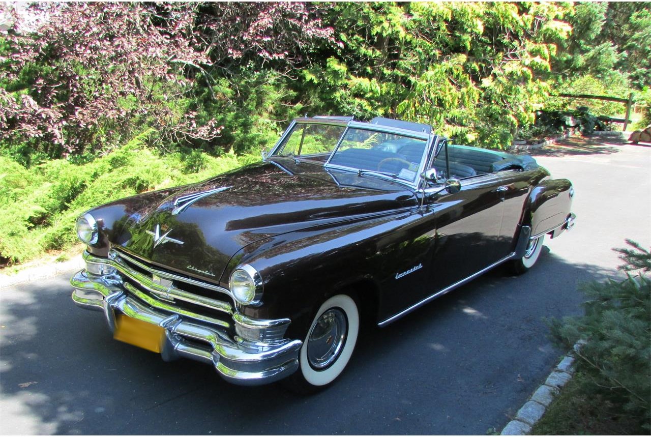 1951 Chrysler Imperial Convertible. One of only 650 total built. HEMI 331cc V 8 engine. 180 horsepower. Fluid torque drive transmission. Full body on restoration with original metallic brown body and metallic green interior colors. Full leather interior. Tan Hartz cloth top.