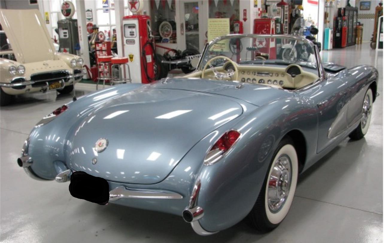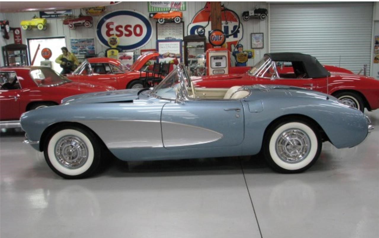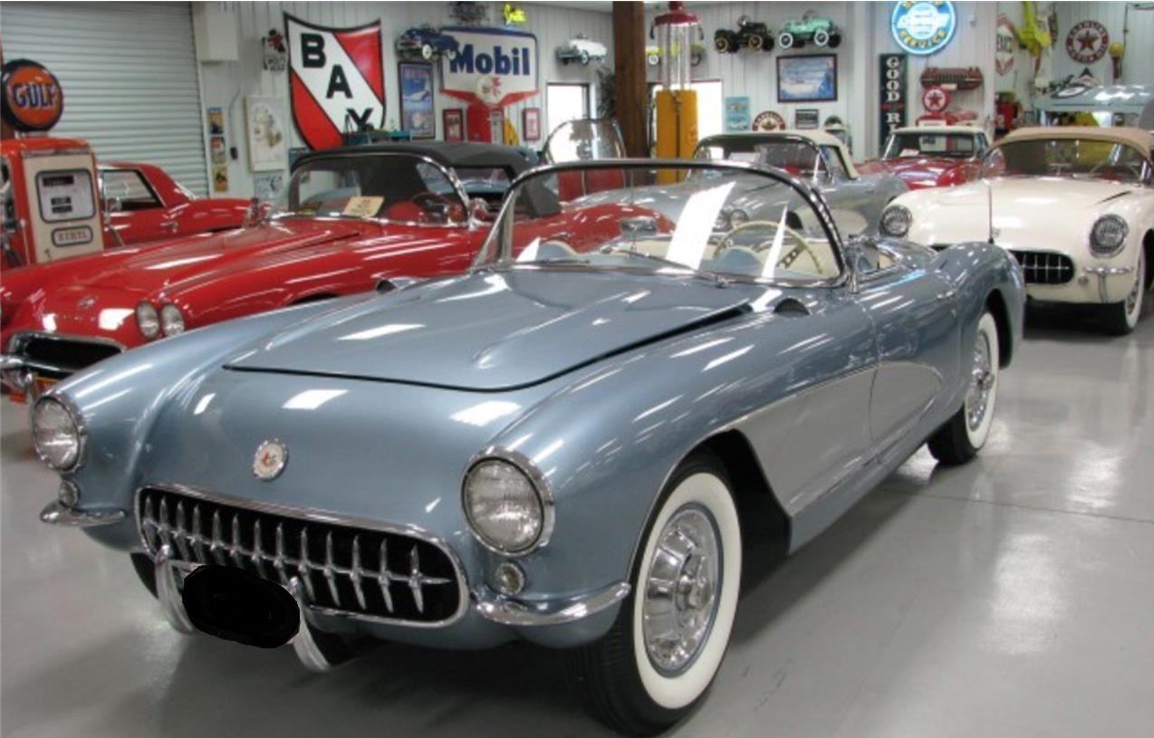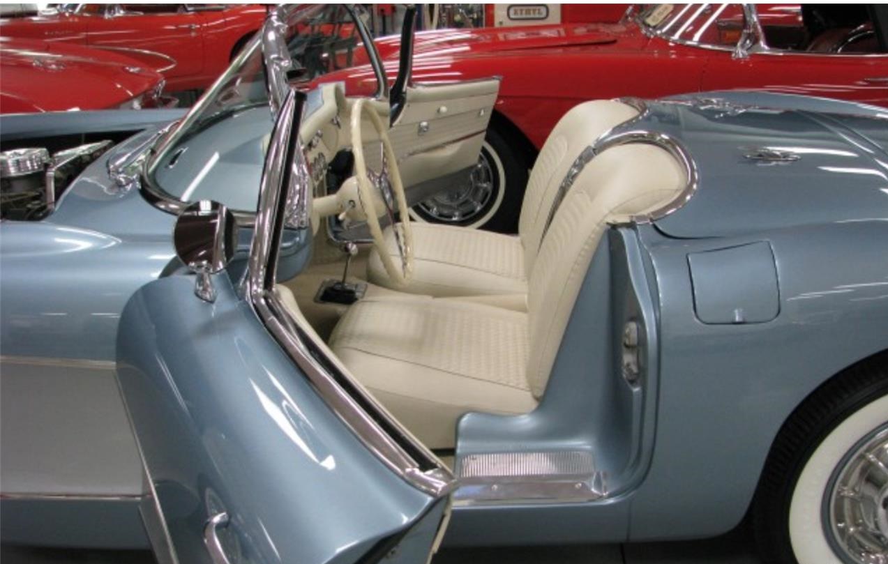 1956 Chevrolet Corvette Arctic Blue with silver cove, white soft top and beige interior.
