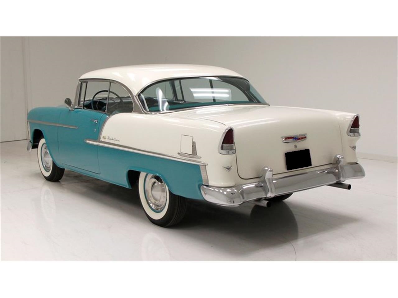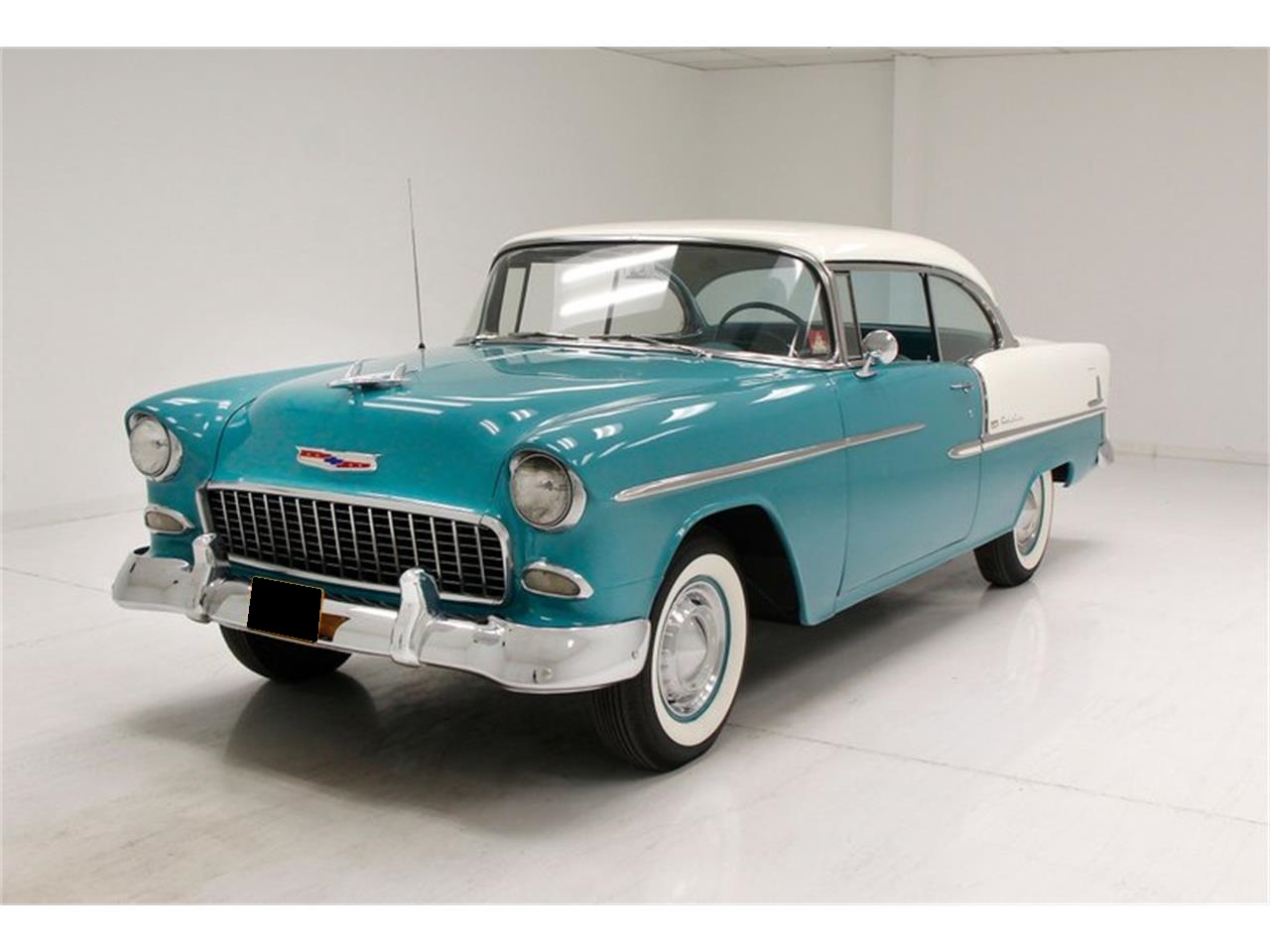1955 Chevrolet Bel Air. Under the hood is a nice patina environment with orange block and valve covers and faded to dull black air cleaner and attachments. A 265ci V8 Powerpack engine is present and correct, and a Carter 4-barrel carburetor is sitting on top. A nice one! A Powerglide 2-speed automatic transmission backs up the engine and 3.55 gears are in the rear axle. Bathed in Regal Turquoise with an India Ivory top and back and can be described as an excellent job. A dual fan shaped dash with speedo on the left and speaker with badging on the right, complete with round clock below, is bordered by the stamped aluminum trim strip with bowtie cutouts. Turquoise is on top and below in metal. All this is in very good condition. Sitting in front of the dash is a nicely preserved original split back bench which uses the turquoise as bolsters and the ivory as tuck and roll inserts. Noted the seat is power controlled another rare option for 55. The rear bench is also well preserved. On the door panels a swoop pattern also in the turquoise and ivory frames the interior on either side. The doors show power window toggles which was a seldom ordered option for this year. The AM radio is inserted into the center of the dash, and above is a beautiful headliner with chromed strips to border each panel. This shows off very well with the completely trimmed windows, and a sea of turquoise carpet in good condition below.