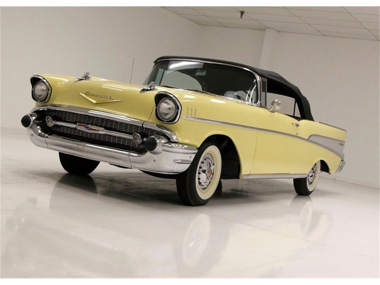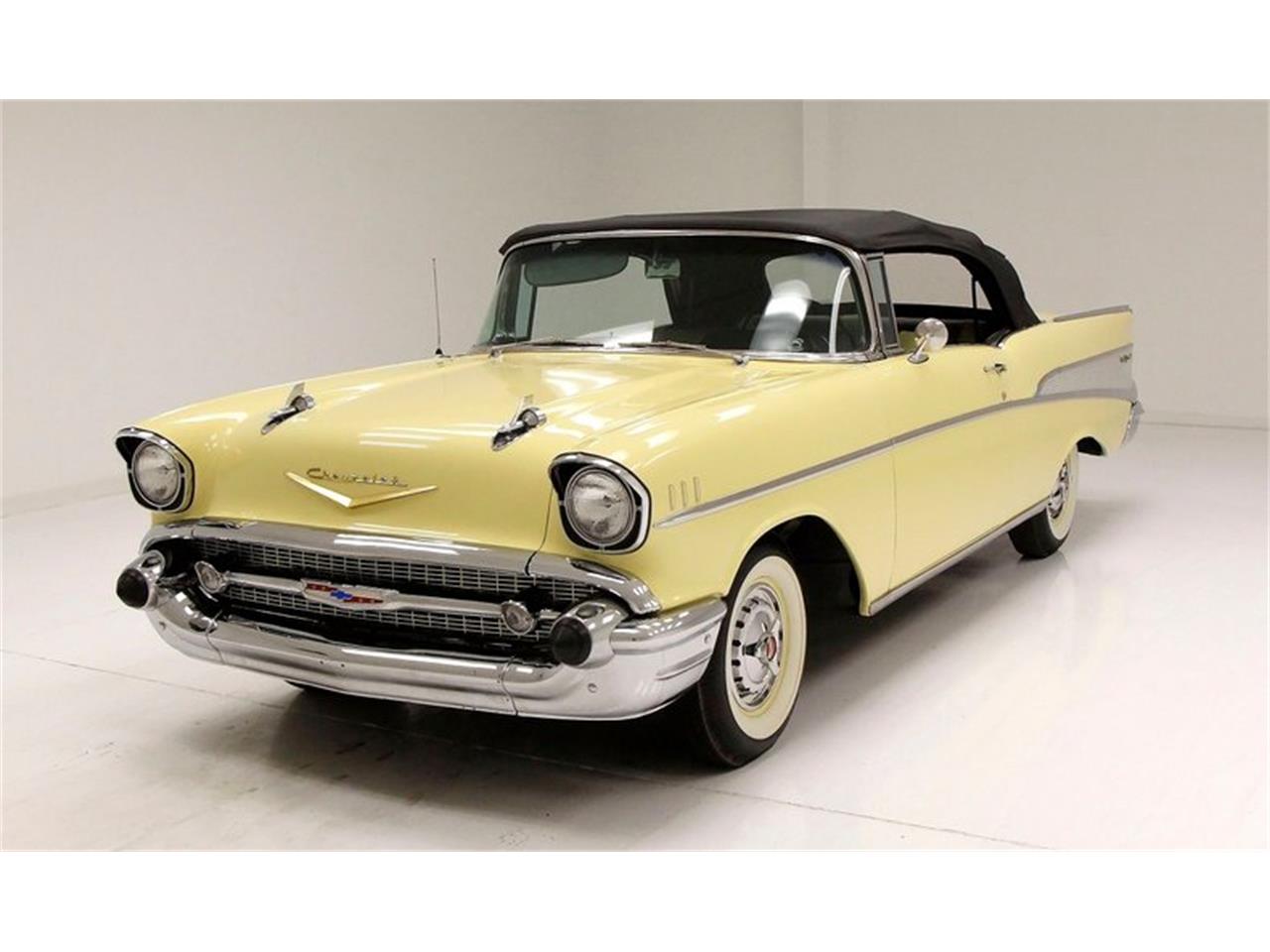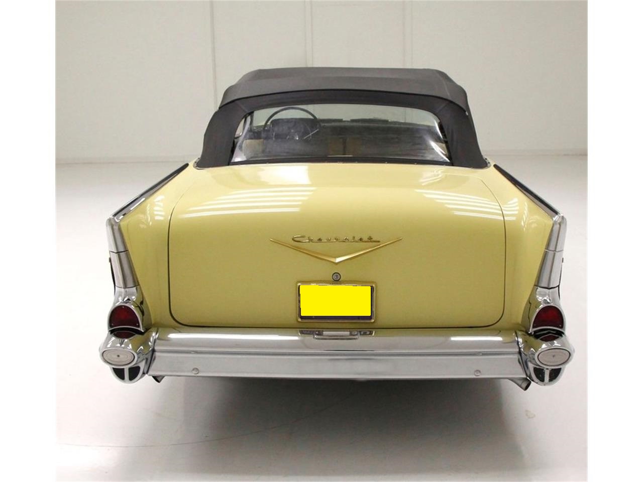 1957 Chevrolet Bel Air Convertible, 283ci Powerpack optioned engine. A 4-barrel carburetor is atop...underneath a black shiny air cleaner. Powerglide provides the automatic transmission in a 2 -peed form. Yellow vinyl making up the clean door panel. Cranks and levers are very good as is armrest. Looking inside a very clean split bench with more of the dough-knitted silver vinyl and yellow bolsters with button accents in yellow. The rear bench follows form of the front seats. The dash is showroom with black painted top dash, and mini checkered aluminum in front housing the clean and mean gauges, wonder-bar radio, knobs for various functions, and a clock. The original steering wheel also near perfect fronts the 50's styled dash, with another bowtie badge and more Bel Air grandmothers handwriting. Black, clean, no stain carpet covers all the floors.