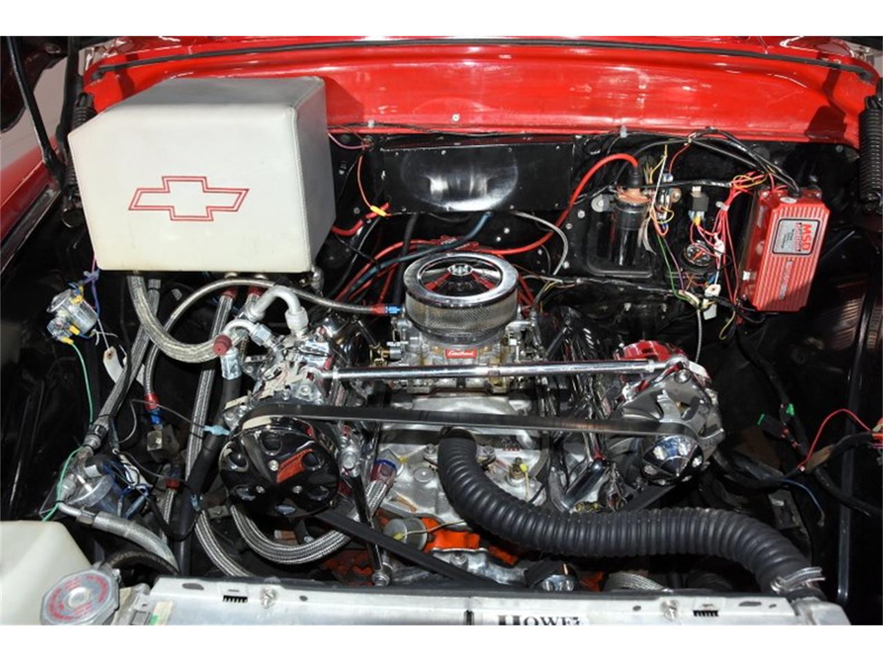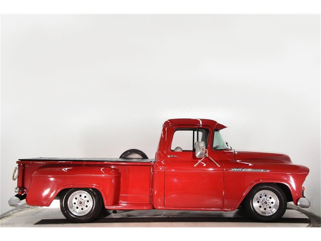 This is a very usable truck that shows really well. It has overdrive, a/c, power steering and brakes. The body is clean. The paint is very smooth and glossy. Has hand pinstripe. The chrome looks new. Has chrome bumpers and grill. Headlight bezels, emblems, door handles look new. Looks like the glass is new. All 5 wheels are aluminum. The 2 rears are bigger and have Mickey Thompson tires. Very comfortable contoured split bench seat with center armrest. Upholstered in soft leather. The entire inside of the cab is upholstered with pretty intricate designs behind the seat and headliner. Custom made door panels too. Custom cut carpet with bound edges. The dash area is painted gloss red. Has a full set of AutoMeter gauges. Below the dash has a custom made panel for the a/c vents and misc knobs. There is a Lokar floor shifter with lit gear indicator on the dash. It has a tilt column with walnut steering wheel. Modern stereo, speakers are hidden. Has seat belts. 350 motor upgraded with aluminum intake, Edelbrock carb and MSD ignition system. Modern air conditioning system. Chrome compressor and alternator, serpentine belt system. Aluminum water pump, big aluminum radiator with electric fan and shroud keeps it running cool. Has power steering with a chrome remote reservoir.